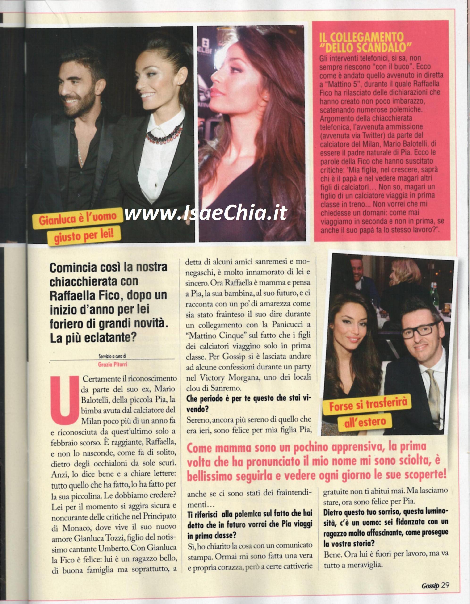 Con la notizia della rottura tra Mario Balotelli e Fanny Neguesha, il gossip si è già scatenato, immaginando un ritorno di fiamma tra il calciatore e Raffaella Fico, madre della piccola Pia (QUI l’articolo). Ma la gieffina si appresta a smentire tutto, perché la sua storia con Gianluca Tozzi va a gonfie vele: “In questo momento lui è fuori per lavoro, ma va tutto a meraviglia. Questo è un periodo della mia vita molto sereno, ancora più di quello che era ieri, e sono felice per mia figlia Pia, anche se ci sono stati dei fraintendimenti”. Quando le si chiede se si riferisce alla polemica sulla sua dichiarazione di volere che in futuro Pia viaggi in prima classe, risponde: “Sì, ma ho chiarito la cosa con un comunicato stampa. Ormai mi sono fatta una vera e propria corazza, però a certe cattiverie gratuite non ti abitui mai”.