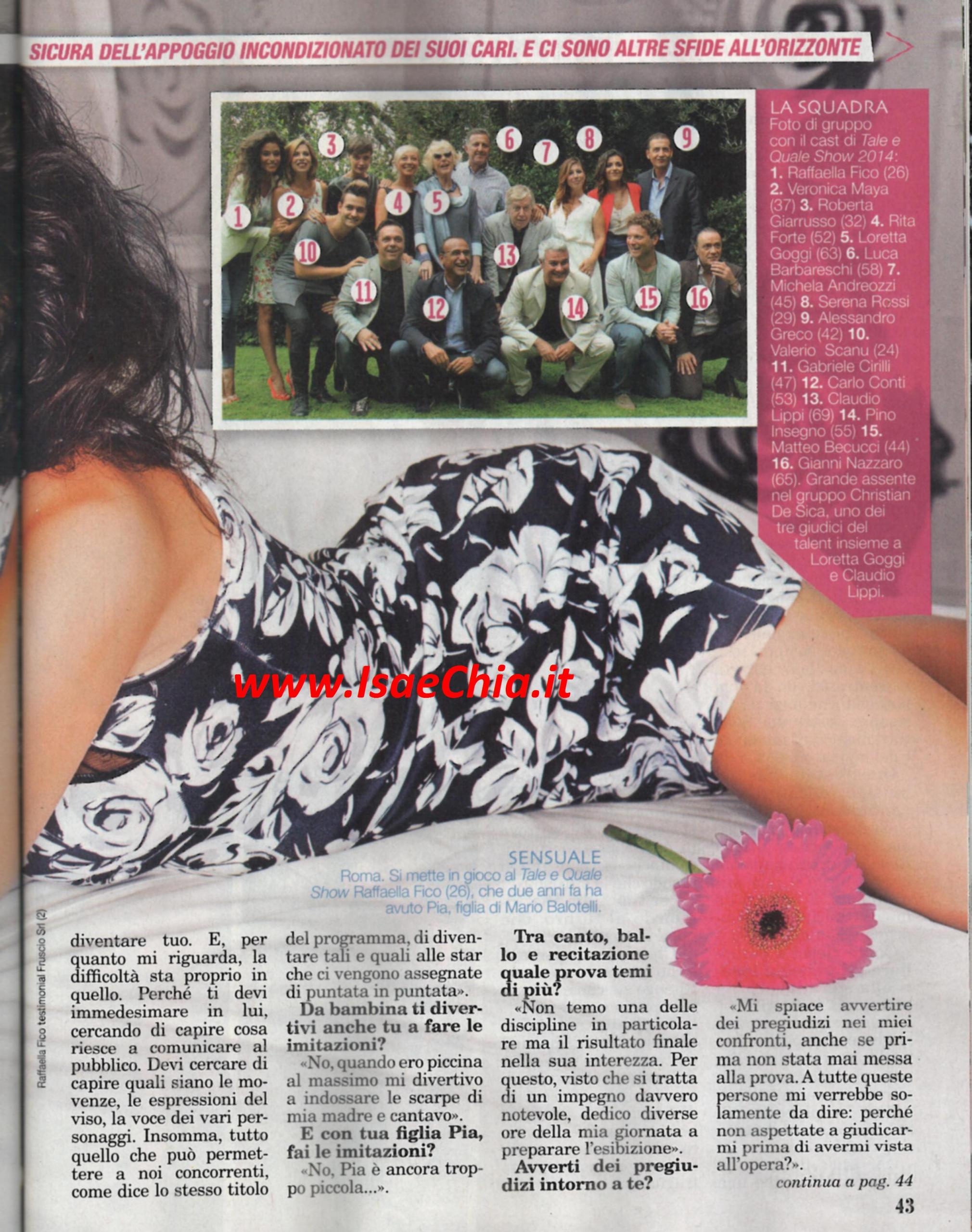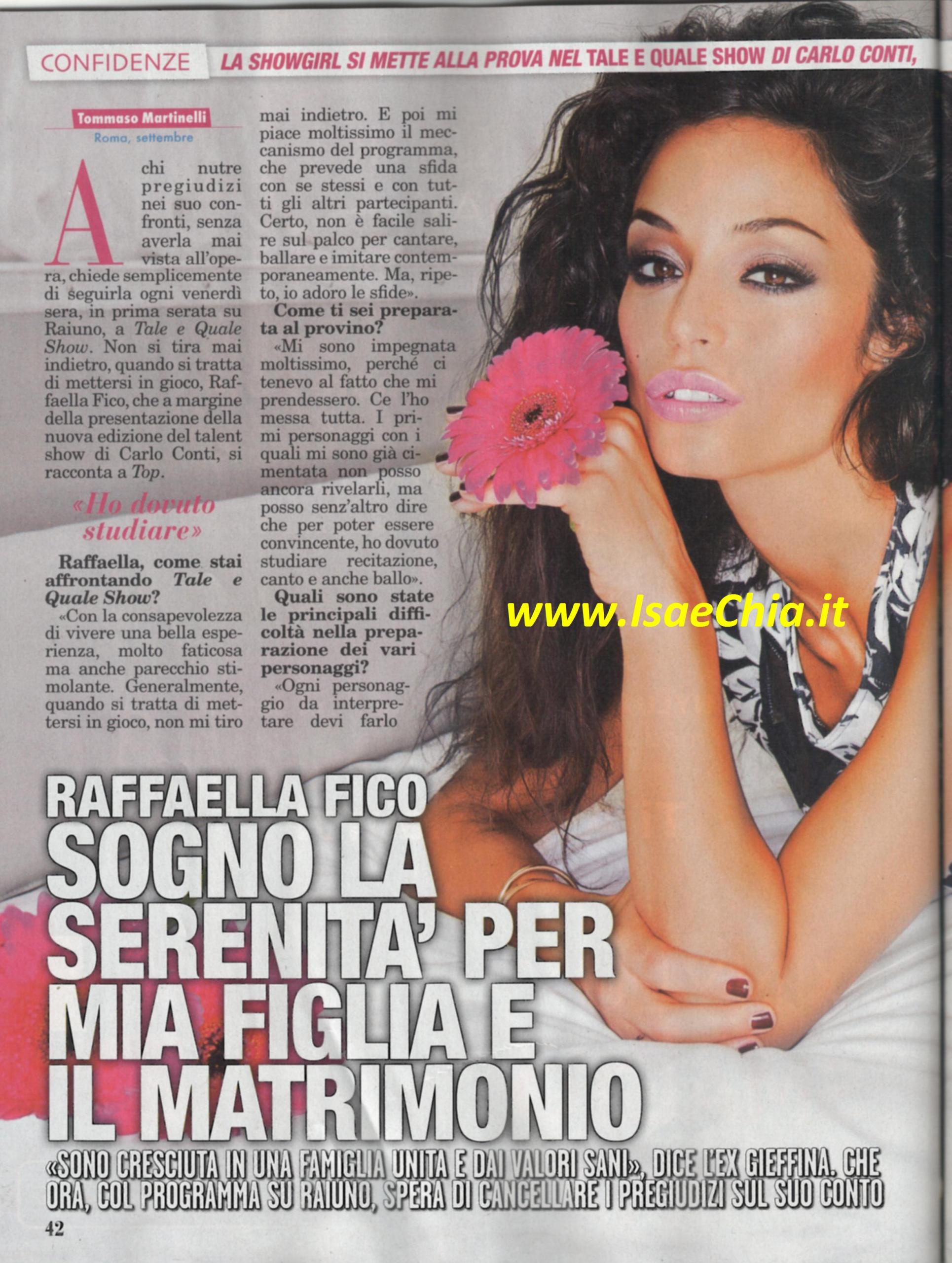 Raffaella Fico sta stupendo il pubblico con le sue imitazioni a Tale e quale Show, mostrando di non essere una che si tira indietro di fronte alle sfide: “Lo sto affrontando con la consapevolezza di vivere un’esperienza faticosa, ma molto stimolante. Mi piace il meccanismo: è una sfida contro sé stessi e tutti gli altri partecipanti. Certo non è facile ballare e cantare contemporaneamente, ma io amo le sfide. Per il provino mi sono impegnata moltissimo e ce l’ho messa tutta: per essere convincente ho dovuto studiare canto, danza e recitazione. Ogni personaggio da interpretare deve diventare tuo, devi immedesimarti in lui, capire le movenze, le espressioni del viso, la voce”. Quando le si chiede se da piccola giocava a imitare gli altri, risponde: “No, ma indossavo le scarpe di mia madre e cantavo! Mia figlia Pia non lo fa ancora: è troppo piccola!”, mentre se le si chiede se avverte dei pregiudizi attorno a sé, rivela: “Mi spiace avvertire pregiudizi, anche se non sono mai stata messa alla prova. A tutte queste persone mi verrebbe da dire: “perché non aspettate a giudicarmi prima di avermi vista all’opera?”. Ho debuttato col mio primo singolo, Rush, e prossimamente uscirà anche un album: è un periodo intenso, in cui mi sto impegnando tanto”. E come fa l’ex gieffina nonché naufraga dell’Isola dei famosi a conciliare tutti gli impegni? “Basta organizzarsi nel migliore dei modi e si trova il tempo per tutto, come fanno tutte le mamme! Come mamma sono un po’ apprensiva, ma anche una mamma serena, che cerca di trasmettere tranquillità: penso al mondo in cui Pia sta crescendo e a quella fase in cui comincerà a conoscerlo”. Infine, ora che è ufficialmente fidanzata (con tanto di anello) con il figlio di Umberto Tozzi, Gianluca, la Fico parla anche di matrimonio: “Certo che ci credo, essendo cresciuta in una famiglia unita e ricca di valori sani e autentici. In futuro mi piacerebbe raggiungere questo traguardo”.