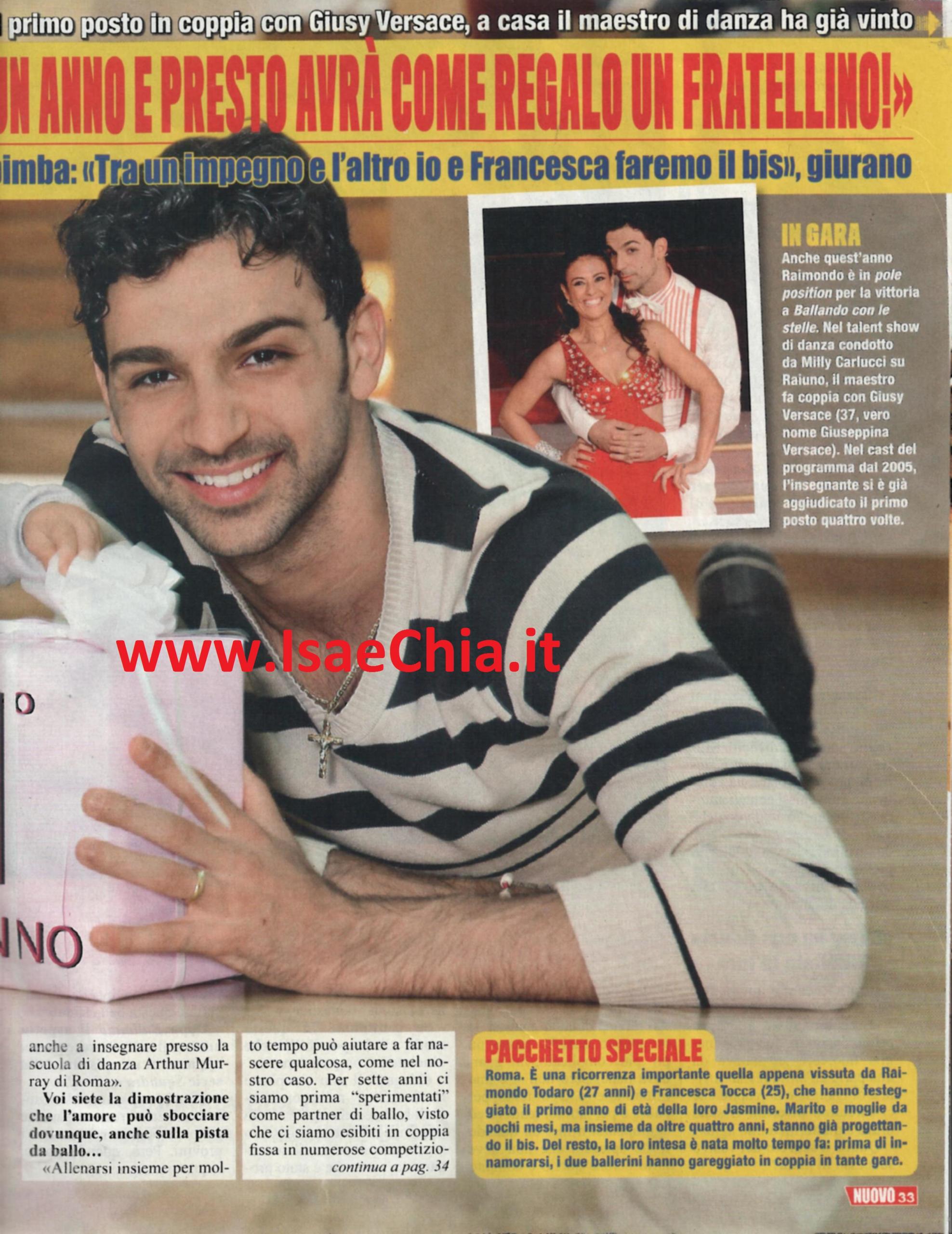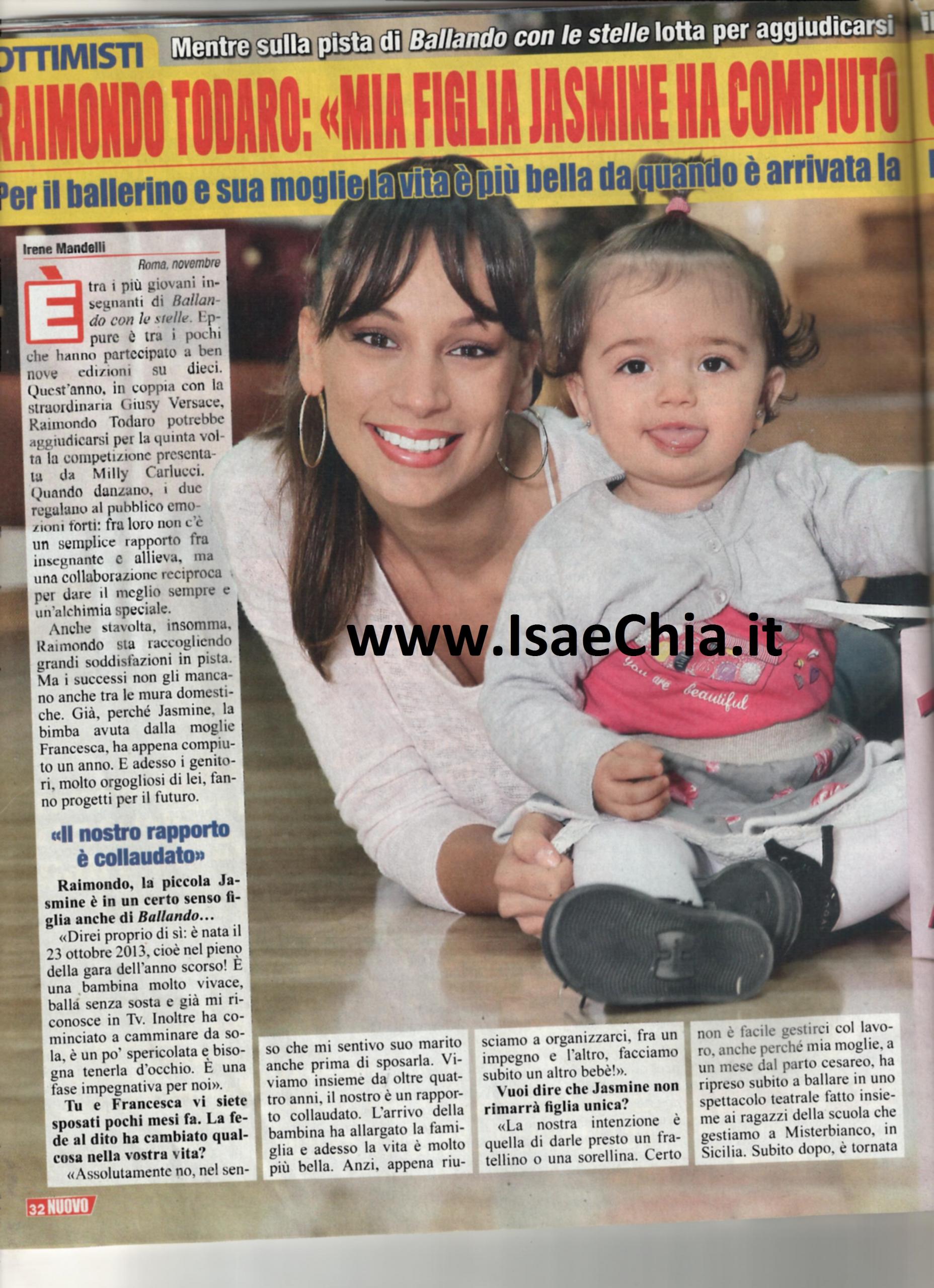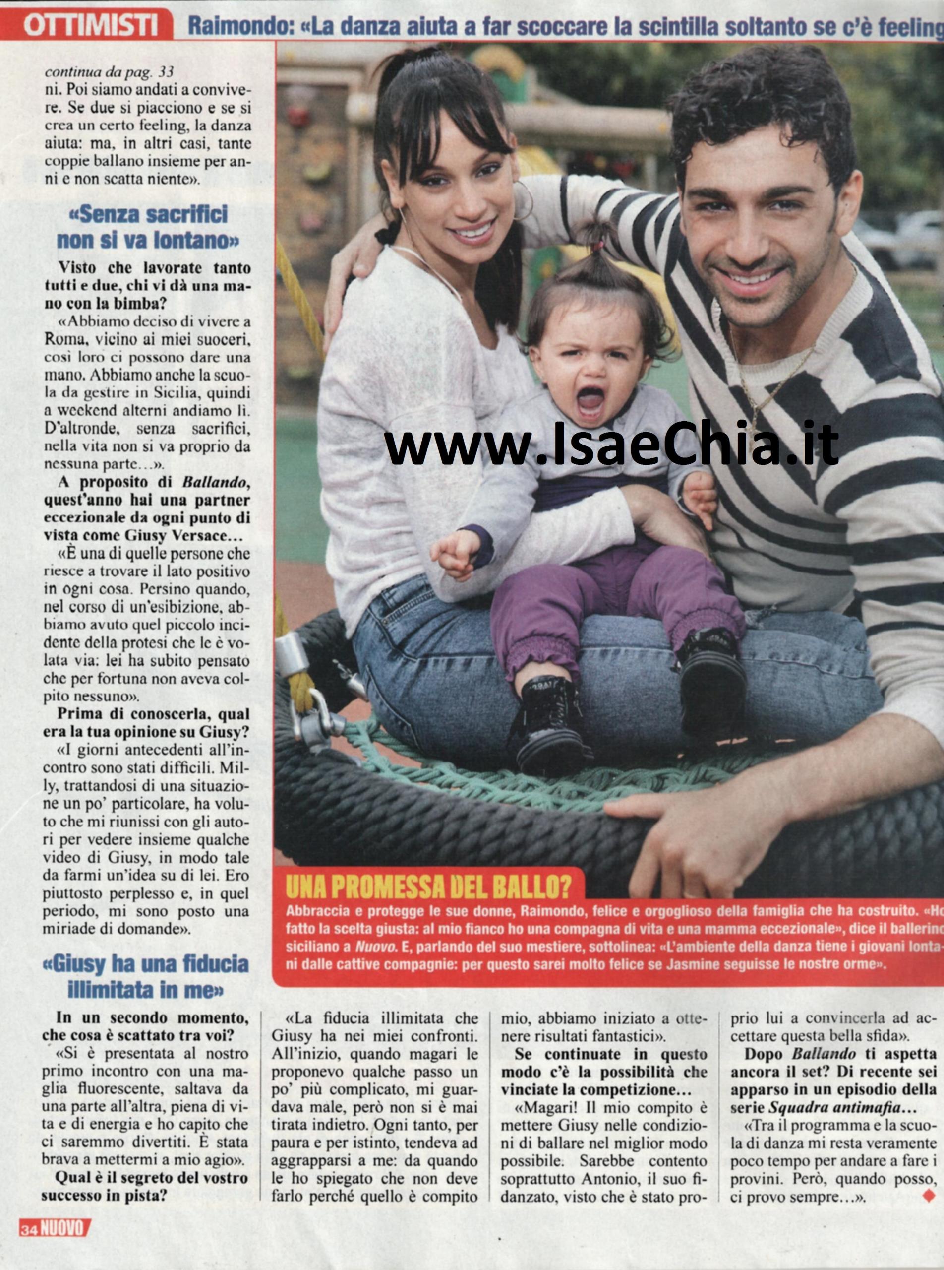 Raimondo Todaro è tra i più giovani maestri di ballo di Ballando con le stelle, ma è anche uno dei pochi ad essere presente da ben nove edizioni e quest’anno è in coppia con la straordinaria Giusy Versace, imprenditrice nella moda e atleta paraolimpica. Ma soprattutto, la sua vita è stata resa felice un anno fa, da quando è nata la sua prima figlia Jasmine: “La mia piccola è nata il 23 ottobre 2013, mentre ero nel pieno della gara. E’ molto vivace, balla senza sosta e già mi riconosce in tv. Inoltre ha cominciato a camminare, bisogna tenerla d’occhio ed è una fase impegnativa per noi. Io e Francesca ci siamo sposati pochi mesi fa, ma la fede al dito non ha cambiato il nostro rapporto. Mi sentivo suo marito anche prima e viviamo insieme da quattro anni. L’arrivo della famiglia ha allargato la famiglia e adesso la vita è più bella. Anzi, appena possiamo, tra un impegno e l’altro, facciamo subito un altro bebè! E’ nostra intenzione darle presto un fratellino o una sorellina. Certo non è facile gestire gli impegni di lavoro: mia moglie, un mese dopo il cesareo, ha ripreso a ballare in uno spettacolo organizzato dalla nostra scuola di Misterbianco, in Sicilia, e poi a Roma. Abbiamo deciso di vivere a Roma, vicino ai miei suoceri, così loro ci possono dare una macchina. Abbiamo una scuola da gestire, così nei week-end andiamo in Sicilia”. Parlando invece di Ballando e di Giusy, dichiara: “E’ una persona che riesce a trovare il lato positivo in ogni cosa, perfino quando le è volata via la protesi durante un’esibizione ha subito pensato che per fortuna non aveva colpito nessuno. Prima di incontrarla, mi sono posto una miriade di domande, ma quando l’ho incontrata, ho capito che ci saremmo divertiti, mi ha messo a mio agio. Il nostro segreto è la fiducia illimitata che lei ripone in me: non si è mai tirata indietro davanti ai passi complicati che le proponevo. Il mio compito è metterla in condizioni di ballare nel miglior modo possibile. La vittoria? Magari! Sarebbe contento soprattutto il suo fidanzato Antonio: è stato lui a convincerla a partecipare a questa sfida!”