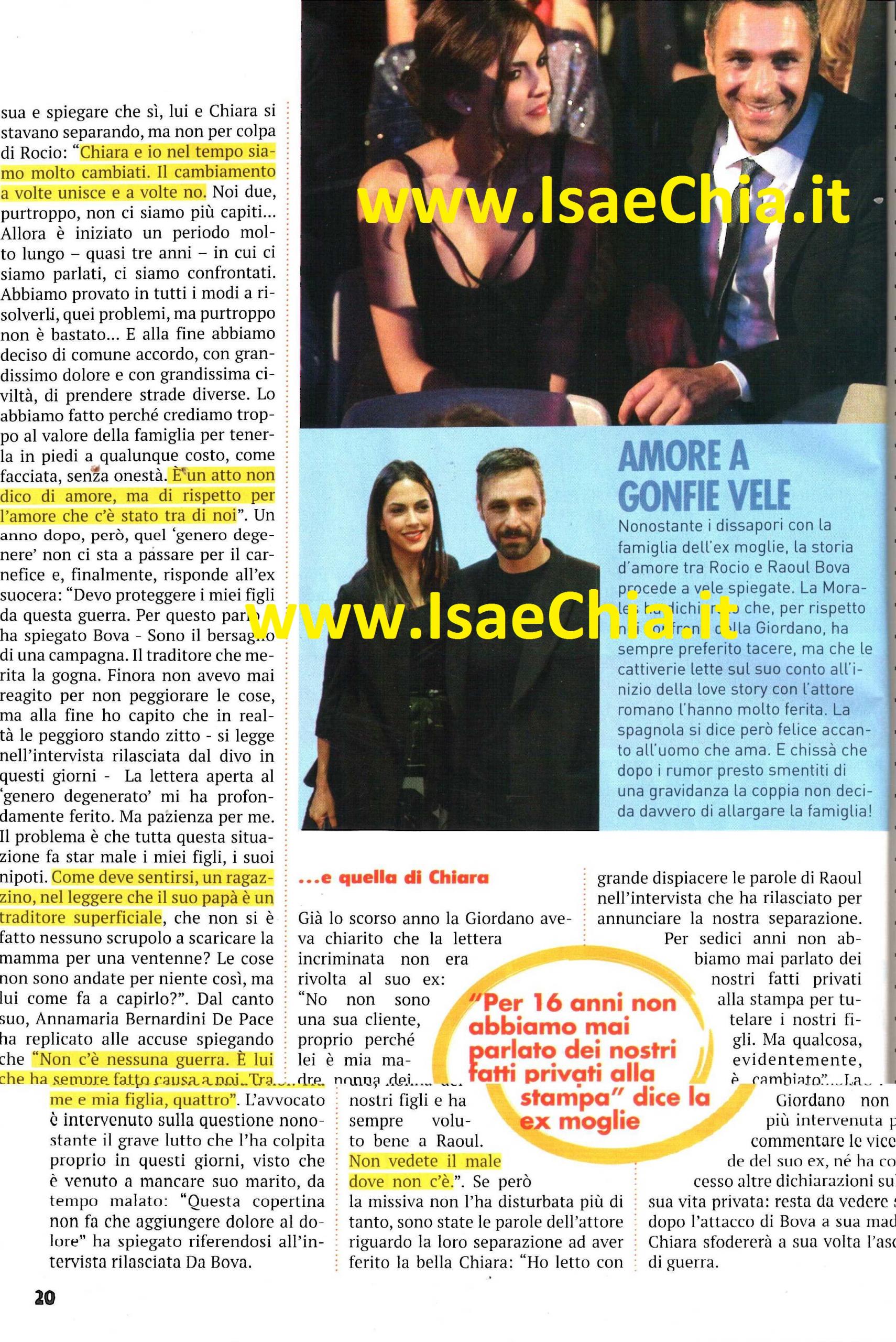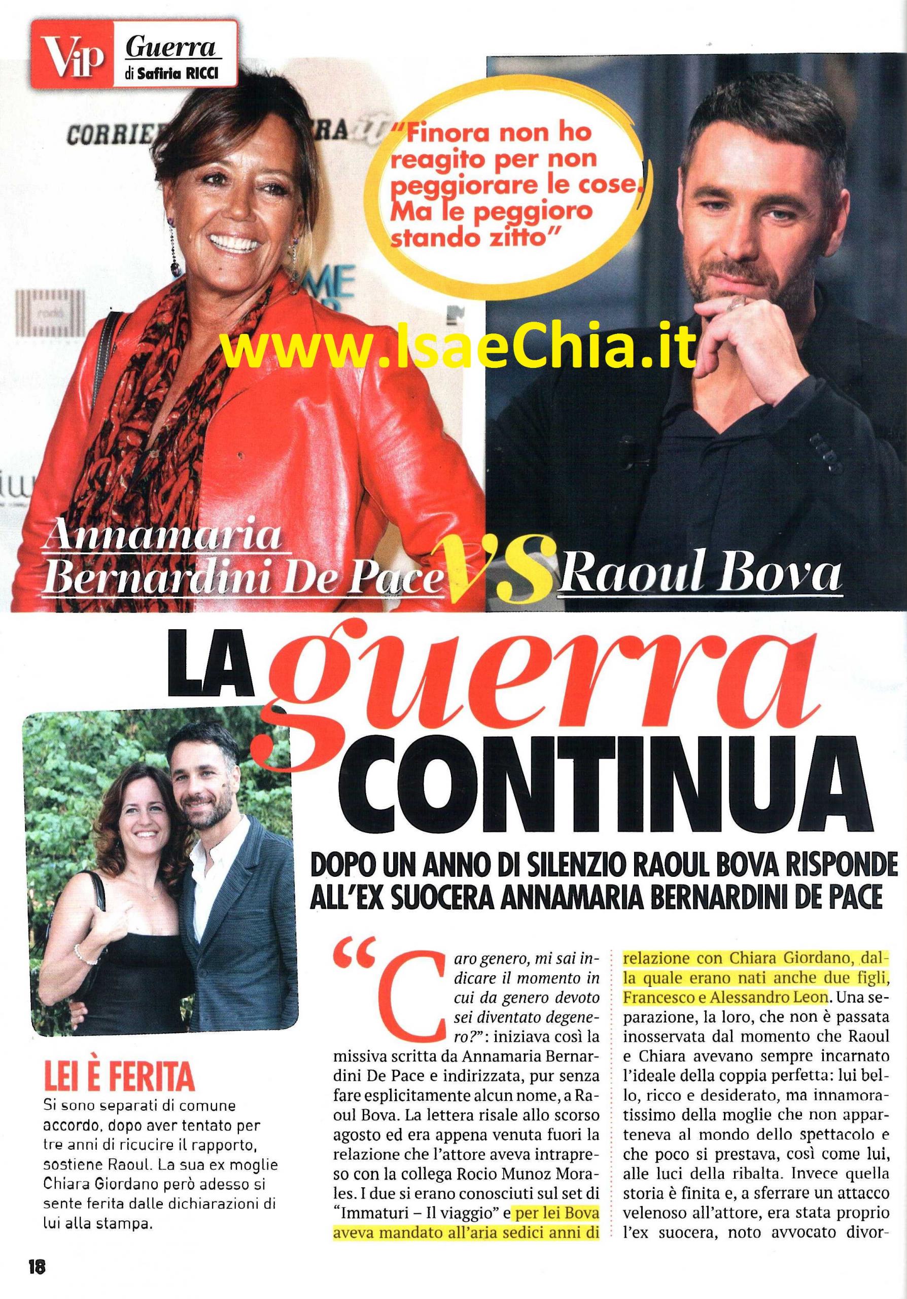 E’ passato quasi un anno da quando l’attore Raoul Bova ha annunciato la fine del matrimonio con Chiara Giordano e ufficializzato la sua relazione con l’attrice spagnola Rocio Munoz Morales. Per lui la fine del suo matrimonio non ha rappresentato un momento semplice e sicuramente è stato complicato ulteriormente dal fatto che la madre della sua ex moglie fosse Annamaria Bernardini De Pace, una degli avvocati divorzisti più potenti d’Italia. “Caro genero, mi sai indicare il momento in cui da genero devoto ti sei trasformato in degenere?” ha scritto lei in una lettera aperta alla stampa lo scorso agosto. Impossibile non collegarla alla separazione tra l’attore e la moglie. L’articolo “suocera inviperita”, però, era solo una rilettura letteraria di una classico triangolo amoroso marito-moglie-amante visto dagli occhi di una suocera. Tuttavia, gli indizi che il riferimento a Bova erano qua e là nel testo: “Vi ho curato la bimba ogni giorno finché tu non hai guadagnato abbastanza per poterti finalmente permettere una tata” erano alcune delle parole, che sembrano messe apposta per essere ambigue. Nei fatti, però, l’avvocato non ha accettato di assistere la figlia nella causa di separazione: “Raoul è il padre dei miei nipoti, come potrei?” ha dichiarato lei. Bova, dal suo canto, per lungo tempo non hai mai commentato la vicenda. La sua unica dichiarazione circa la fine del matrimonio fu: “Chiara ed io col tempo siamo molto cambiati e il cambiamento a volte unisce, altre no. Noi due purtroppo non ci siamo più capiti, così è iniziato un periodo di quasi tre anni, durante il quale ci siamo parlati e confrontati. Abbiamo fatto di tutto per risolvere quei problemi, ma non è bastato e abbiamo deciso di comune accordo, con grandissimo dolore e civiltà, di prendere strade diverse. Crediamo troppo nel valore della famiglia per tenerla in piedi a qualunque costo, senza onestà. E’ un atto di rispetto per l’amore che c’è stato tra noi“. Adesso, però, a distanza di mesi, lui ha deciso di rispondere a quelle provocazioni, spiegando: “Devo proteggere i miei figli da questa guerra, per questo parlo. Sono bersaglio di una campagna, il traditore che merita la gogna. Finora non avevo mai reagito per non peggiorare le cose, ma alla fine ho capito che in realtà le avrei peggiorate stando zitto. La lettera del “genero degenerato” mi ha profondamente ferito, ma pazienza per me. Il problema è che questa situazione fa stare male i miei figli, i suoi nipoti. Come deve sentirsi un ragazzino nel leggere che suo padre è un traditore superficiale, che non si è fatto scrupoli a scaricare sua mamma per una ventenne? Le cose non sono andate per niente così, ma lui come fa a capirlo?” ha detto lui in un’intervista di pochi giorni fa. La suocera avvocato ha presto ribattuto nonostante il lutto per la perdita di suo marito, che l’ha colpita nei giorni precedenti: “Non c’è nessuna guerra, è lui che ha sempre fatto causa a noi: tra me e mia figlia, quattro. Questa copertina non fa che aggiungere dolore al mio dolore“. La Giordano, in effetti aveva chiarito che la lettera incriminata non era rivolta all’ex marito: “Non sono cliente di mia madre proprio perché lei è la nonna dei miei figli e ha sempre voluto bene a Raoul. Non vedete il male dove non c’è” ha dichiarato. Ma quale sarà la verità?