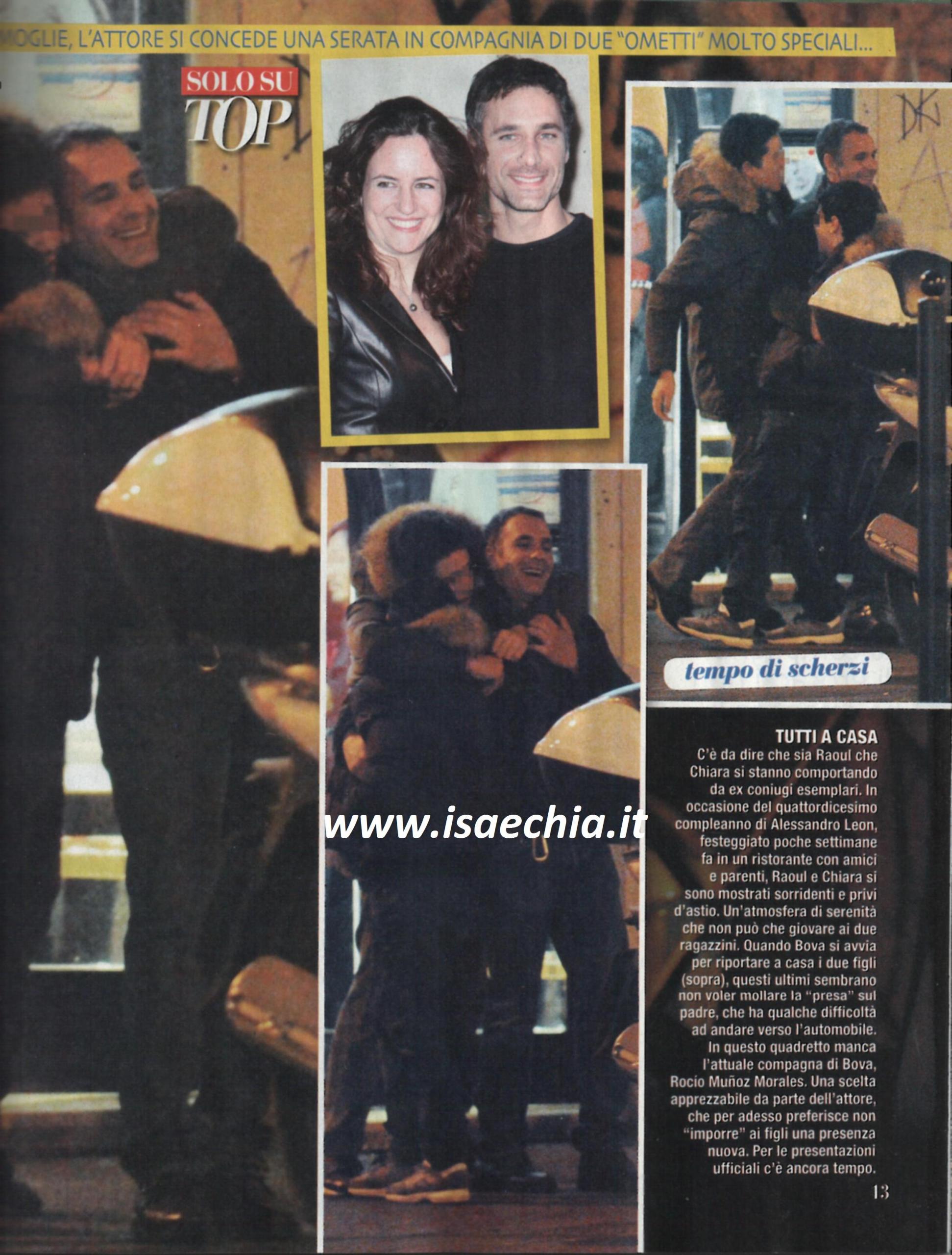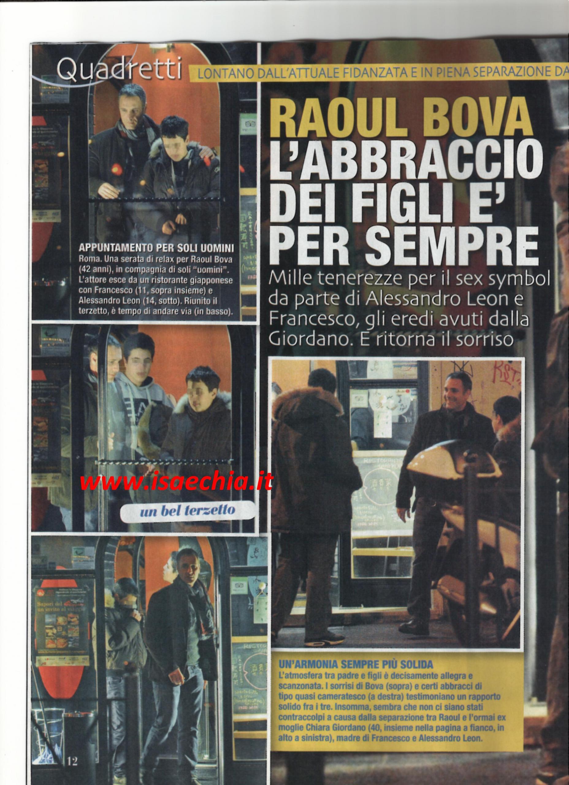 Nonostante la recente separazione, Raoul Bova e Chiara Giordano si stanno comportando da ex coniugi esemplari. In occasione del 14° compleanno del primo figlio Alessandro Leon, la famiglia si è riunita e i due si sono mostrati sorridenti e privi d’astio. In queste nuove foto, invece, c’è un’uscita tra soli uomini: l’attore ha portato i due figli al ristorante giapponese e gli abbracci camerateschi mostrano il rapporto solido tra i tre. Quando Raoul si avvia per riportare a casa i figli, questi sembrano non voler “mollare la presa” sul padre, che ha difficoltà ad andare verso l’auto. In questo quadretto manca Rocio Munoz Morales, la nuova compagna: l’attore ha scelto di non imporre ai figli una presenza nuova.