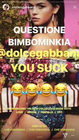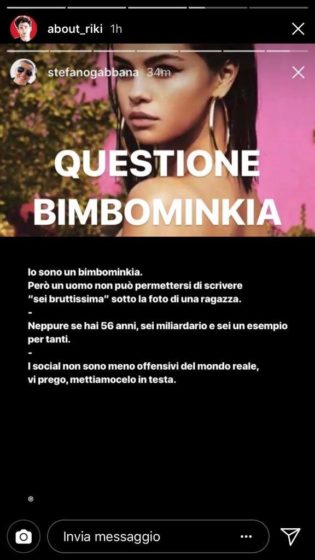 Il commento di Riki ha scatenato un breve scontro pubblico con Gabbana e proprio quest’ultimo, senza troppi fronzoli o giri di parole, ha definito il ragazzo un ‘bimbominkia‘: