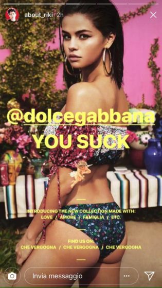 Tra i sostenitori arrabbiati della Gomez, anche un volto noto, ossia il cantautore di Amici 16 Riccardo Marcuzzo, che non ha esitato un solo istante a scagliarsi pubblicamente contro il noto stilista per il quale non troppo tempo fa – tra l’altro – ha sfilato (QUI il post con tutti i dettagli).
