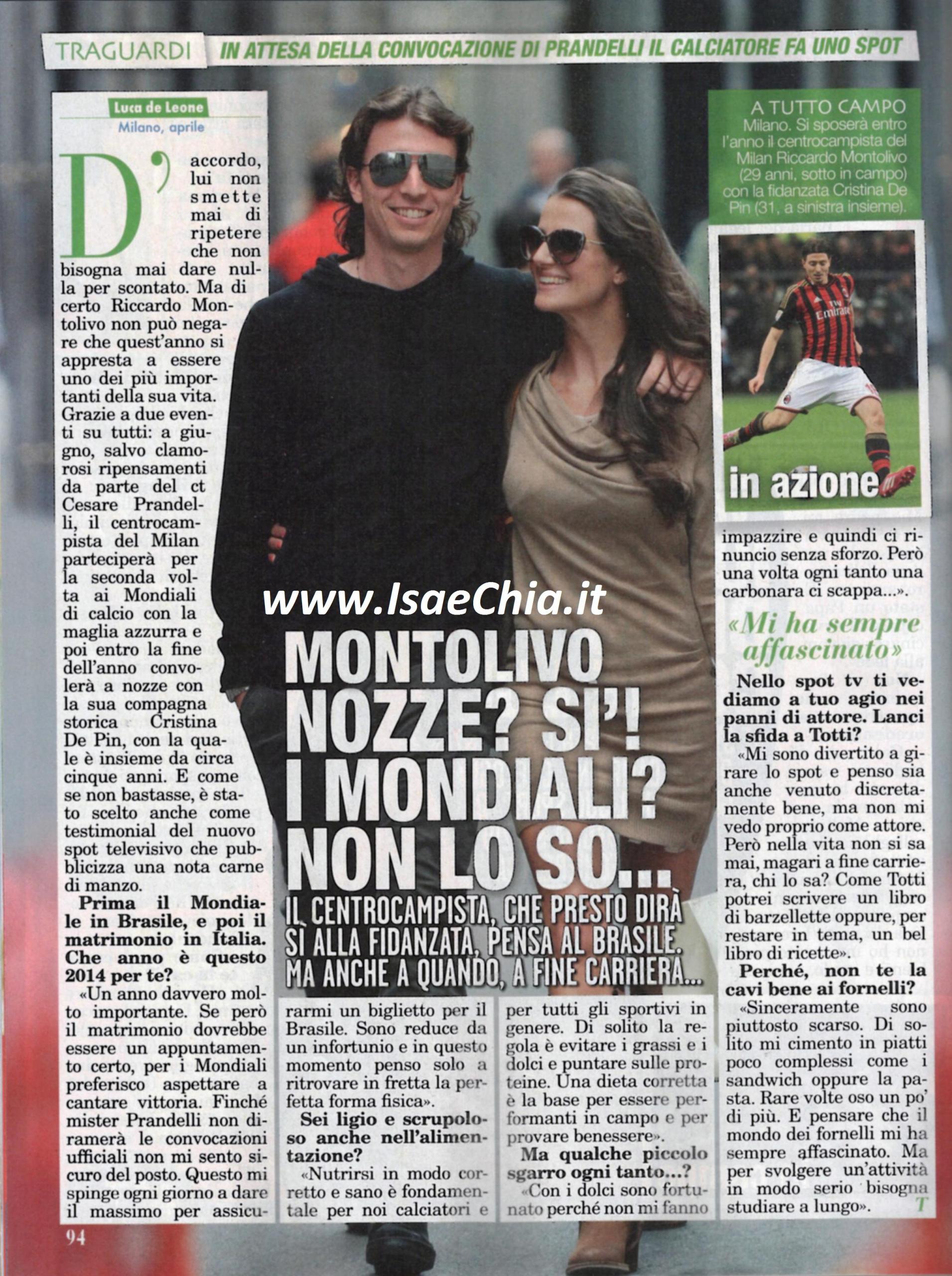 Salvo clamorosi ripensamenti del CT Cesare Prandelli, a giugno Riccardo Montolivo parteciperà per la seconda volta ai mondiali di calcio. Inoltre, entro l’anno convolerà a nozze con la sua compagna storica, Cristina De Pin: “Questo 2014 è un anno davvero molto importante. Il matrimonio dovrebbe essere certo, mentre per i Mondiali preferisco aspettare per cantare vittoria. Finché Prandelli non farà le convocazioni ufficiali non mi sento a posto. Questo mi spinge a dare ogni giorno del mio meglio per assicurarmi il biglietto per il Brasile: sono reduce da un infortunio e penso solo a ritrovare la perfetta forma fisica. Nutrirsi in modo sano evitando grassi e dolci e puntando su proteine è fondamentale per i calciatori! I dolci non mi fanno tanto gola, ma ogni tanto una carbonara ci scappa!”. Quando gli si chiede dello spot tv in cui appare, risponde: “Mi sono divertito a girarlo e penso sia venuto discretamente bene, ma non mi vedo proprio come attore. Però nella vita non si sa mai, magari a fine carriera! Come il mio collega Francesco Totti potrei scrivere un libro di barzellette o di ricette! In cucina sono scarso, mi cimento in piatti poco complessi. E pensare che il mondo dei fornelli mi ha sempre affascinato…Ma per svolgere un’attività in modo serio bisogna studiare a lungo”.