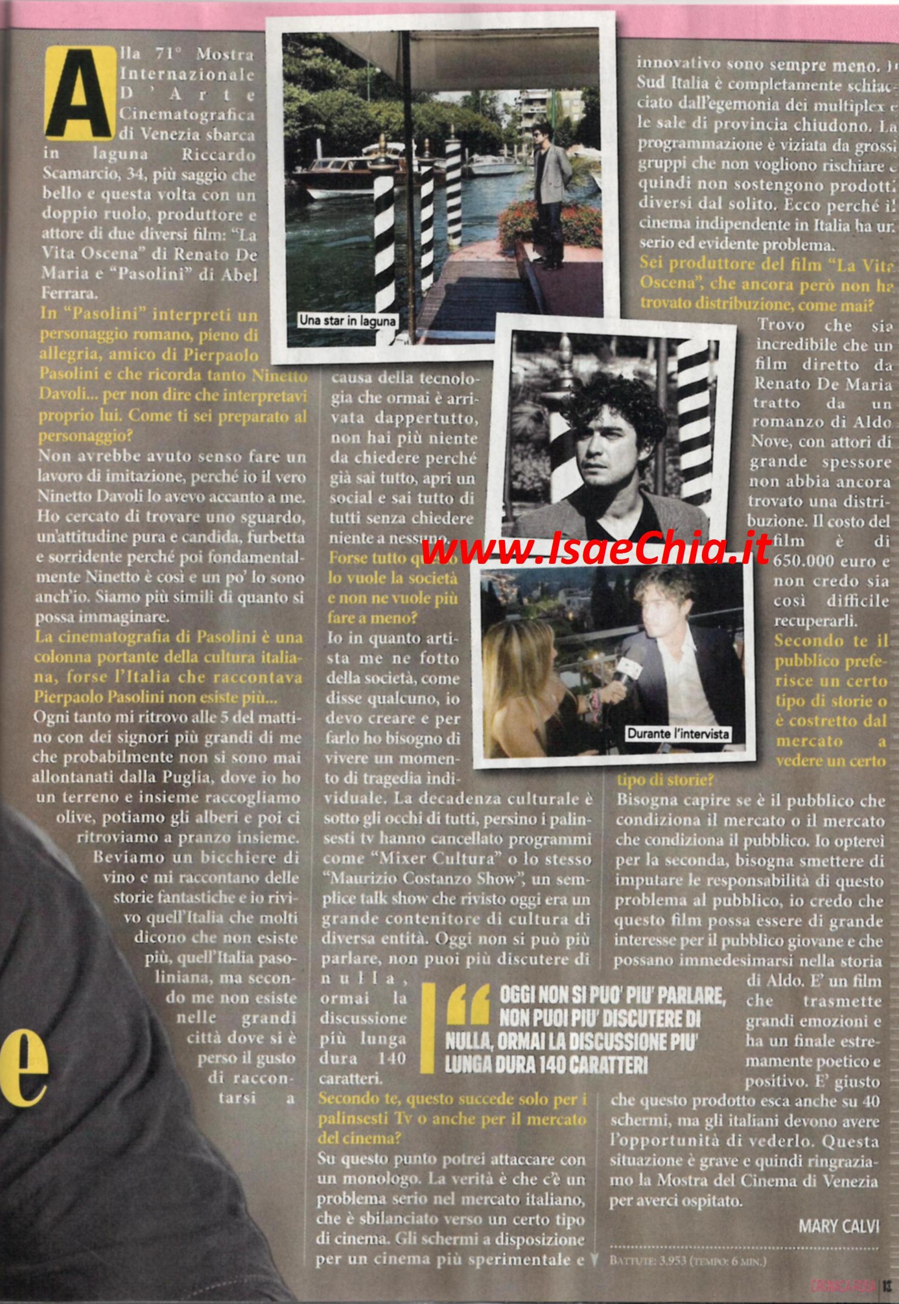 Riccardo Scamarcio è arrivato alla 71esima Mostra Internazionale d’Arte Cinematografica di Venezia come produttore e attore in due diversi film: La vita oscena e Pasolini. In quest’ultimo, interpreta un personaggio amico del poliedrico Pierpaolo Pasolini, che ricorda un po’ Ninetto Davoli: “Non avrebbe senso fare un lavoro d’imitazione, perché io il vero Ninetto lo avevo accanto a me. Ho cercato uno sguardo, un’attitudine pura e furbetta, perché Ninetto è così e lo sono un po’ anch’io: siamo più simili di quanto si possa immaginare”. E, parlando dell’Italia dei tempi di Pasolini, l’attore racconta: “A volte, in Puglia, dove ho un terreno, raccolgo le olive con dei signori più grandi di me, che dicono che quell’Italia non esiste più. Con la tecnologia non hai più niente da chiedere perché sai già tutto, apri un social e sai tutto senza chiedere niente a nessuno. Io in quanto artista, me ne fotto della società, come disse qualcuno. Ho bisogno di vivere un momento di tragedia individuale. La decadenza culturale oggi è sotto gli occhi di tutto; le discussioni si sono ridotte a 140 caratteri. Quanto al cinema, c’è un problema serio nel mercato italiano, che è sbilanciato verso un tipo di cinema e gli schermi a disposizione per il cinema più sperimentale e indipendente è sempre meno. Il film La vita oscena non ha ancora trovato distribuzione. Trovo incredibile che un film diretto da Renato De Maria e tratto da un romanzo di Aldo Nove con attori di grande spessore non l’abbia ancora trovata: è costato 650.0o0 euro e non credo sia così difficile recuperarli”. Così, quando gli si chiede se è il pubblico a preferire un certo tipo di cinema o è costretto dal mercato a vederne solo un tipo, Scamarcio risponde: “Bisogna capire se è il pubblico che condiziona il mercato o viceversa. Io penso che bisogni smetterla di imputare la responsabilità di questo problema al pubblico: credo che questo film possa essere di grande interesse per il pubblico giovane, che può immedesimarsi nella storia di Aldo; trasmette molte emozioni e ha un finale poetico e positivo. E’ giusto che esca anche su 40 schermi, ma gli Italiani devono avere l’opportunità di vederlo”.