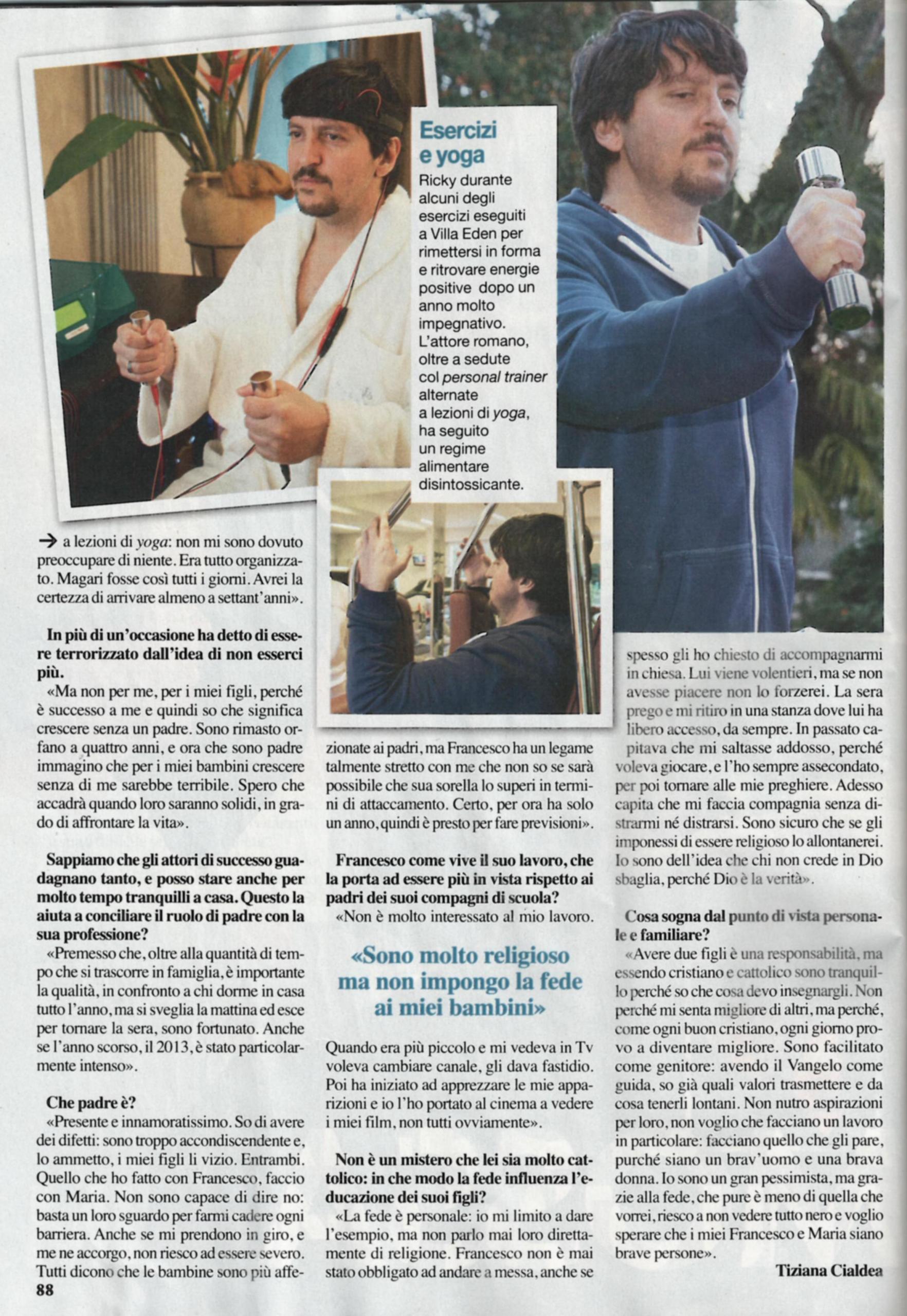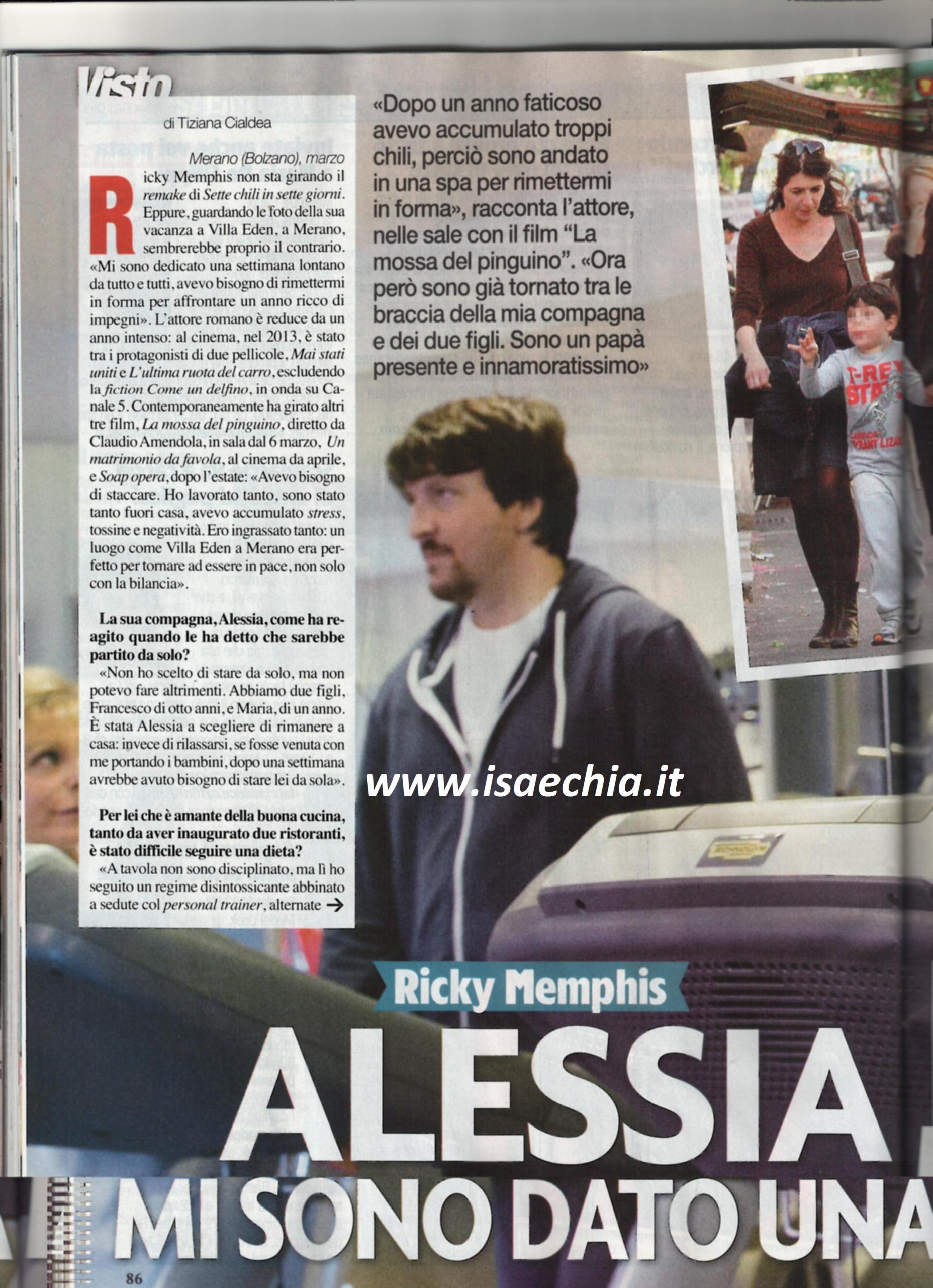 L’attore Ricky Memphis si è ritirato da solo a Merano: “Mi sono dedicato una settimana lontano da tutto e da tutti; avevo bisogno di rimettermi in forma prima di un anno pieno di impegni”. Nel 2013, infatti, è stato protagonista di due pellicole e della fiction Come un delfino, e contemporaneamente ha registrato altri tre film, uno appena uscito, uno in uscita ad aprile e uno dopo l’estate. “Ho lavorato tanto, sono stato tanto fuori casa e ho accumulato molto stress, tossine e negatività. Ero ingrassato tanto e un luogo come Villa Eden era perfetto per tornare in pace, anche con la bilancia. Non ho scelto di rimanere da solo: io e la mia compagna Alessia abbiamo due figli e lei ha scelto di rimanere a casa. Dopo una settimana con loro avrebbe avuto bisogno di un’altra settimana di vacanza”. Ricky è gestore di due ristoranti ed è un amante della cucina: “A tavola non sono disciplinato, ma lì ho seguito un regime disciplinante, abbinato a sedute con un personal trainer e yoga. Se fosse sempre così, avrei la certezza di campare fino a 70 anni. Ho paura di morire per i miei figli, perché so com’è crescere senza un padre. Sono un padre presente e innamoratissimo, forse troppo accondiscendente; vizio entrambi: quello che faccio con Francesco, lo faccio anche con Maria. Dicono che le bambine sono più affettuose, ma con Francesco ho un legame così stretto che dubito che lei riuscirà a superarlo! All’inizio gli dava fastidio guardarmi in tv, poi ha imparato ad apprezzarmi. Io sono molto cattolico, ma la fede è personale e non gli impongo di venire a messa, qualche volta gli ho chiesto di accompagnarmi. Sono sicuro che se glielo imponessi, lo allontanerei. Avere due figli è una responsabilità, ma essendo cattolico so cosa insegnargli. Non nutro aspirazioni per loro, spero che diventino due brave persone”.