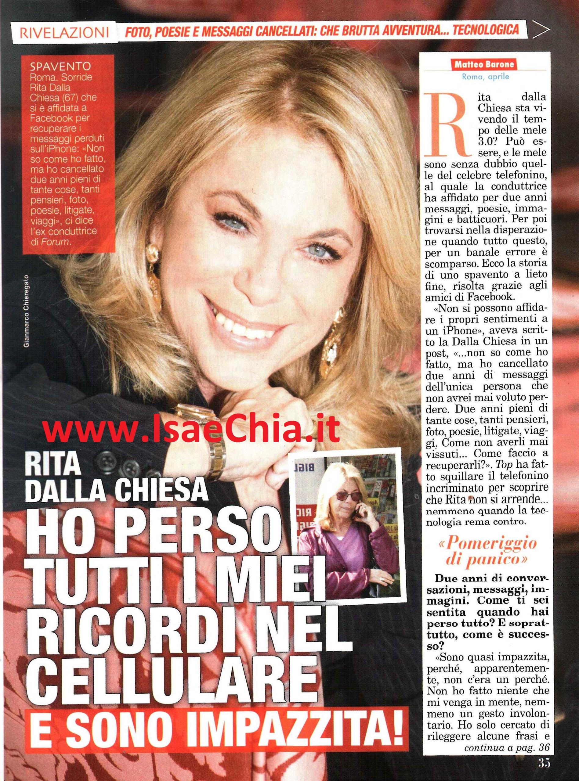 E’ stata presa dallo spavento, la conduttrice Rita Dalla Chiesa, in seguito ad un banale errore. “Non si possono affidare i prori sentimenti ad un IPhone. Non so come ho fatto, ma ho cancellato due anni di messaggi dell’unica persona che non avrei mai voluto perdere. Due anni pieni di tante cose, tanti pensieri, foto, poesie, litigate, viaggi. Come non averli mai vissuti. Come faccio a recuperarli?” aveva scritto lei su Facebook. Contattata, l’ex signora di Forum racconta: “Sono quasi impazzita perché apparentemente non c’era un perché alla sparizione di tutti i miei dati dal cellulare. Non ho fatto niente che mi venga in mente, nemmeno un gesto involontario. Ho solo cercato di rileggere alcune frasi e mi sono accorta che quello che avevo salvato negli ultimi due anni non era più lì, dove lo sapevo al sicuro. Potete immaginare come mi sia sentita: ero a Palermo e ho passato un pomeriggio nel panico. Sono una che conserva tutto, compresi i nastri dei regali che ricevo dalle persone a cui voglio bene. Immaginate cosa significa sapere di aver conservato messaggi con parole importanti, poesie, foto che mi danno il battito di cuore. Il tutto poi mentre ero fuori da Roma, dove ho il mio computer, che ho scoperto conservare in backup gran parte dei dati che non sapevo di poter ritrovare. Per un momento ho temuto il peggio. E più sentivo ripetere che i ricordi sono impressi nella mente, più mi salivano i nervi! Non è la stessa cosa. Ed è per questo che mi piace fare tesoro di certi passaggi. La memoria è uno strumento incredibile, ma anche capace di selezionare e sfumare col tempo. Io ho la fortuna di avere un’ottima memoria, ma diverso è sapere di poter recuperare in qualsiasi momento qualcosa che ti ha fatto emozionare. E’ una rinuncia che non avrei voluto fare per niente al mondo. Di chi erano quei messaggi? Di un grande…amore!“.