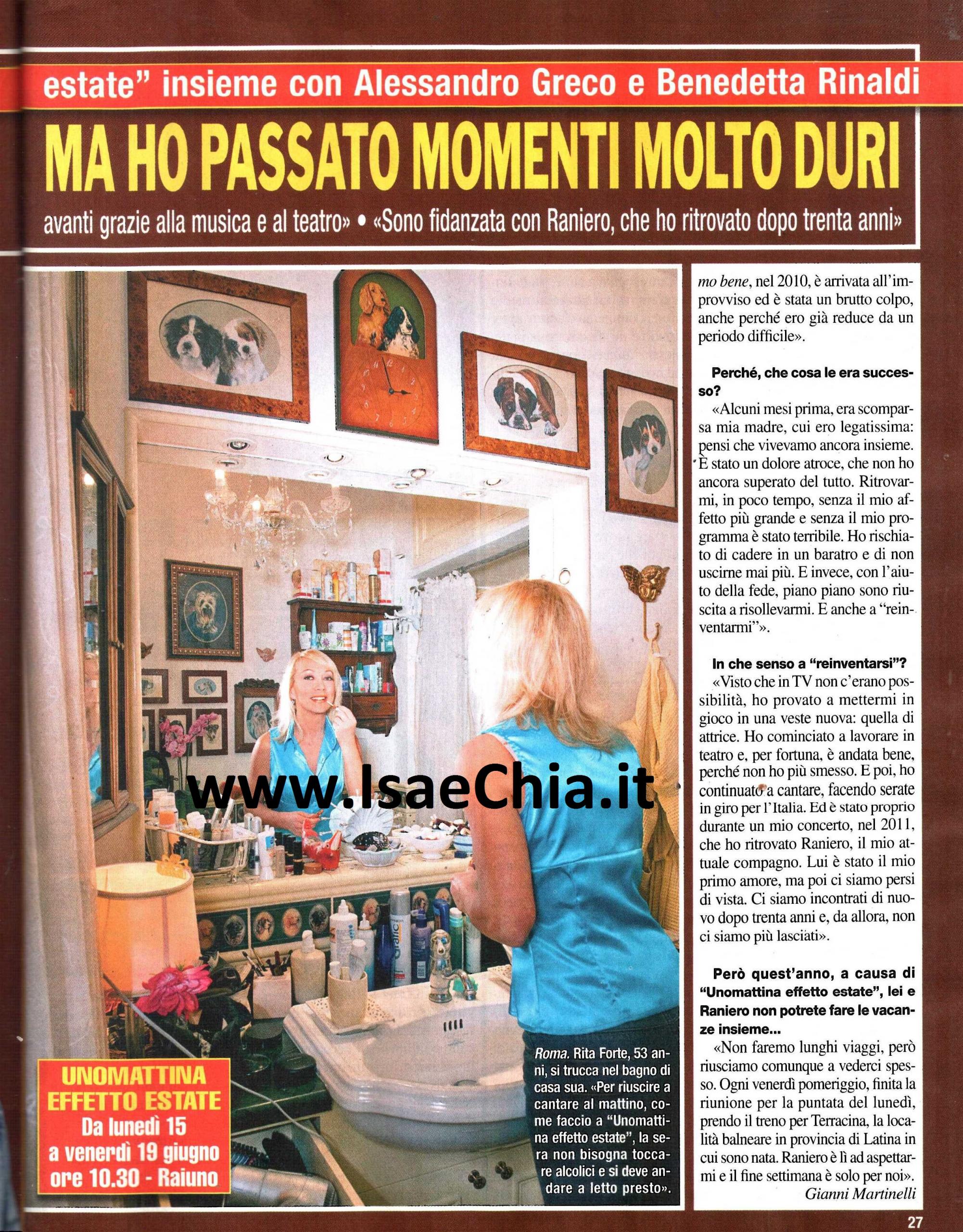 Dopo il successo di Tale e quale show, a Rita Forte è stata affidata la conduzione della versione estiva di UnoMattina. Intervistata, la cantante e conduttrice racconta: “E’ passata una settimana dal mio debutto a Unomattina effetto estate, ma sono ancora emozionata come il primo giorno: subito prima della diretta mi tremano le gambe e la notte fatico a dormire. Lo so: può sembrare strano che, dopo tanti anni di carriera, io mi senta ancora così. Ma questa trasmissione, per me, ha un significato speciale: erano cinque anni, infatti. da quando è finito Cominciamo bene, che non conducevo un programma. Ed è una gioia che divido con Raniero, il mio grande amore. Benedetta Rinaldi la conoscevo solo di vista, ma ci siamo subito trovate bene insieme. Alessandro Greco, invece, era con me a Tale e quale show, ma lo conosco da molto prima: diventammo amici quando era ospite al Tappeto volante di Luciano Rispoli. Lui imitava Pino Daniele e io lo accompagnavo al pianobar. Chissà, potremmo rifarlo: in studio abbiamo un pianoforte, perché, oltre a condurre, in trasmissione canto e suono. E per me e questa la cosa più difficile! E’ difficile cantare di mattina, perché è il momento della giornata in cui la voce è meno calda. Quindi, prendo due piccoli accorgimenti. Innanzitutto, evito di bere alcolici e bibite gassate la sera, perché irritano la gola e dunque le corde vocali. Poi, vado sempre a letto presto, perché, se l’organismo riposa bene, la mattina dopo anche la voce ne trae giovamento“. Facendo un passo indietro, Rita racconta come è stata scelta per Unomattina effetto estate: “Cesare Zavattini, capo degli autori del programma, mi ha conosciuto bene lo scorso anno, quando sono stata ospite diverse volte a Unomattina estate. Poi, Carlo Conti mi ha voluto a Tale e quale show: un grande successo in prima serata, mi ha dato una iniezione di fiducia. Sentivo che le cose cominciavano a girare. Poi, finito il programma di Conti, il mio agente, Alessandro Lo Cascio, ha invitato me e il mio compagno a cena, con la scusa di farci vedere la sua nuova casa. A un certo punto mi ha detto: ‘Rita, siediti: ho una bella notizia. Questa estate non farai le vacanze perché sarai tutte le mattine in onda su Raiuno’. Ero al settimo cielo: questa è l’occasione che aspettavo da tempo. Dopo Cominciamo bene, mi sono dovuta rimboccare le maniche. La chiusura del programma, nel 2010, è arrivata all’improvviso ed è stata un brutto colpo, anche perché ero già reduce da un periodo difficile: pochi mesi prima, era scomparsa mia madre, cui ero legatissima: pensi che vivevamo ancora insieme. E’ stato un dolore atroce, che non ho ancora superato del tutto. Ritrovarmi, in poco tempo, senza il mio affetto più grande e senza il mio programma è stato terribile. Ho rischiato di cadere in un baratro e di non uscirne mai più. E invece, con l’aiuto della fede, piano piano sono riuscita a risollevarmi. E anche a ‘reinventarmi’: visto che in tv non c’erano possibilità, ho provato a mettermi in gioco in una veste nuova: quella di attrice. Ho cominciato a lavorare in teatro e, per fortuna, è andata bene. perché non ho più smesso. E poi, ho continuato a cantare, facendo serate in giro per l’Italia. Ed è stato proprio durante un mio concerto, nel 2011, che ho ritrovato Raniero, il mio attuale compagno. Lui è stato il mio primo amore, ma poi ci siamo persi di vista. Ci siamo incontrati di nuovo dopo trent’anni e, da allora, non ci siamo più lasciati. E’ vero, quest’anno non faremo una lunga vacanza insieme, però riusciamo comunque a vederci spesso. Ogni venerdì pomeriggio, finita la riunione per la puntata del lunedì, prendo il treno per Terracina, la località balneare in provincia di Latina in cui sono nata. Raniero è lì ad aspettarmi e il fine settimana è solo per noi!“.