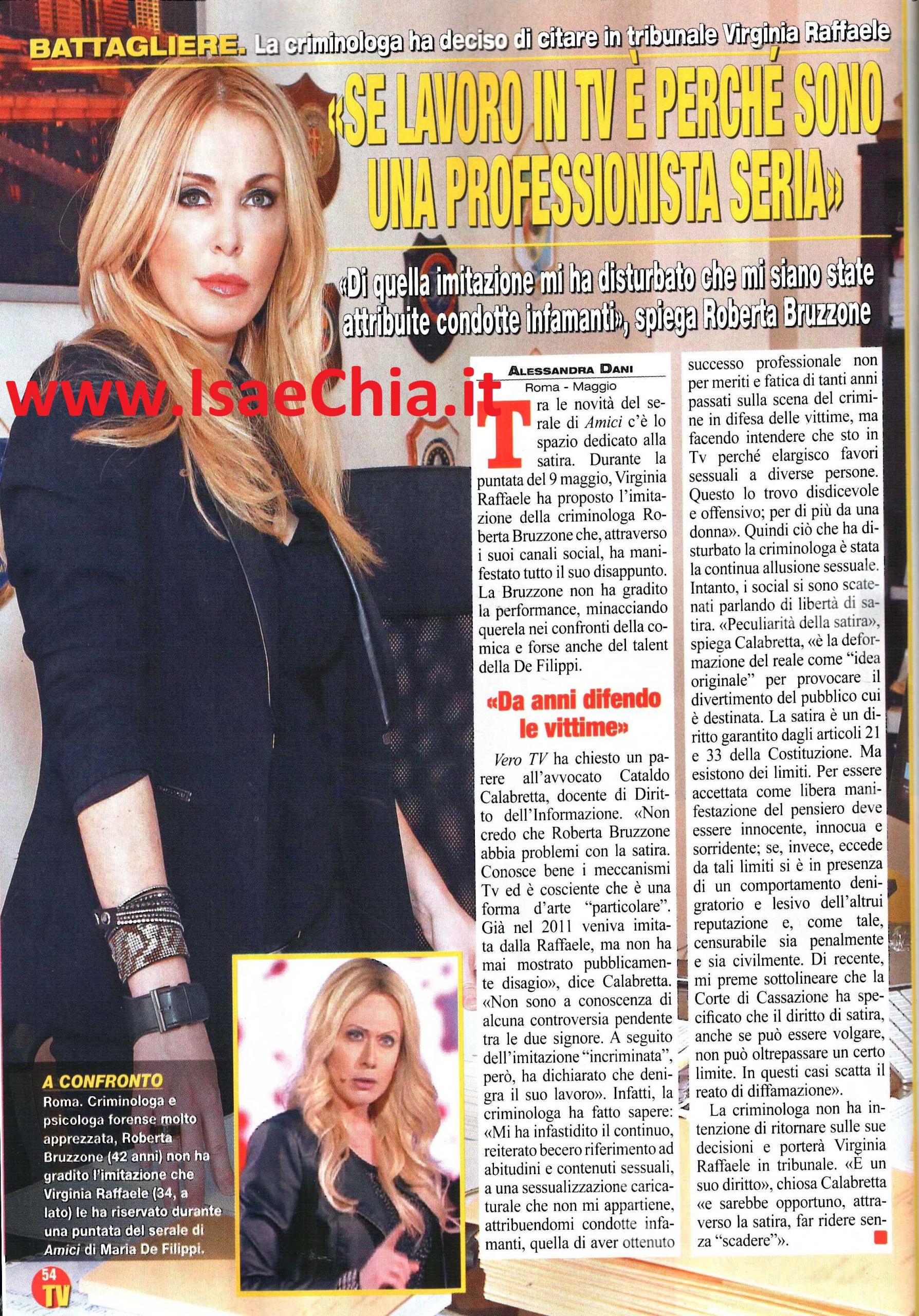 Ha fatto molto discutere, in questi ultimi tempi, la polemica nata in seguito ad una delle imitazioni che Virginia Raffaele ha portato in scena durante una puntata di Amici. L’imitatrice, infatti, ha proposto la caricatura della criminologa Roberta Bruzzone, ma quest’ultima non ha molto gradito la performance ed ha manifestato tutto il suo disappunto, minacciando la querela (QUI per leggere la notizia). “Mi ha infastidito il continuo, reiterato, becero riferimento ad abitudini e contenuti sessuali, a una sessualizzazione caricaturale che non mi appartiene, attribuendomi condotte infamanti, come quella di aver ottenuto successo professionale non per meriti e fatica di tanti anni passati sulla scena del crimine in difesa delle vittime, ma facendo intendere che sto in tv perché elargisco favori sessuali a diverse persone. Questo lo trovo disdicevole e offensivo; per di più da una donna!” ha dichiarato lei indignata. Ovviamente, il pubblico ha reagito manifestando sostegno nei confronti della comica, che probabilmente non intendeva ledere in tal senso l’immagine della criminologa, ma solo ironizzare. Chiedendo il parere di un esperto, l’avvocato Cataldo Calabretta, docente di Diritto dell’Informazione, risponde: “Non credo che Roberta Bruzzone abbia problemi con la satira, conosce bene i meccanismi della tv ed è cosciente che è una forma d’arte ‘particolare’ Già nel 2011 veniva imitata dalla Raffaele, ma non ha mai mostrato disagio pubblicamente. Peculiarità della satira è la deformazione del reale come ‘idea originale’, per provocare il divertimento del pubblico cui è destinata. La satira è un diritto garantito dagli articoli 21 e 33 della Costituzione. Per essere accettata come libera manifestazione del pensiero, deve essere innocente, innocua e sorridente, se, invece, si eccede da tali limiti, si è in presenza di un comportamento denigratorio e lesivo dell’altrui reputazione e, come tale, censurabile sia penalmente che civilmente. Di recente, la Corte di Cassazione ha specificato che il diritto di satira, anche se può essere volgare, non può oltrepassare un certo limite. In questi casi scatta il reato di diffamazione“. Così, quando gli si fa notare che la Bruzzone è decisa a portare in tribunale la Raffaele, il Professore risponde: “E’ un suo diritto. E sarebbe opportuno, attraverso la satira, far ridere senza ‘scadere’!“.
