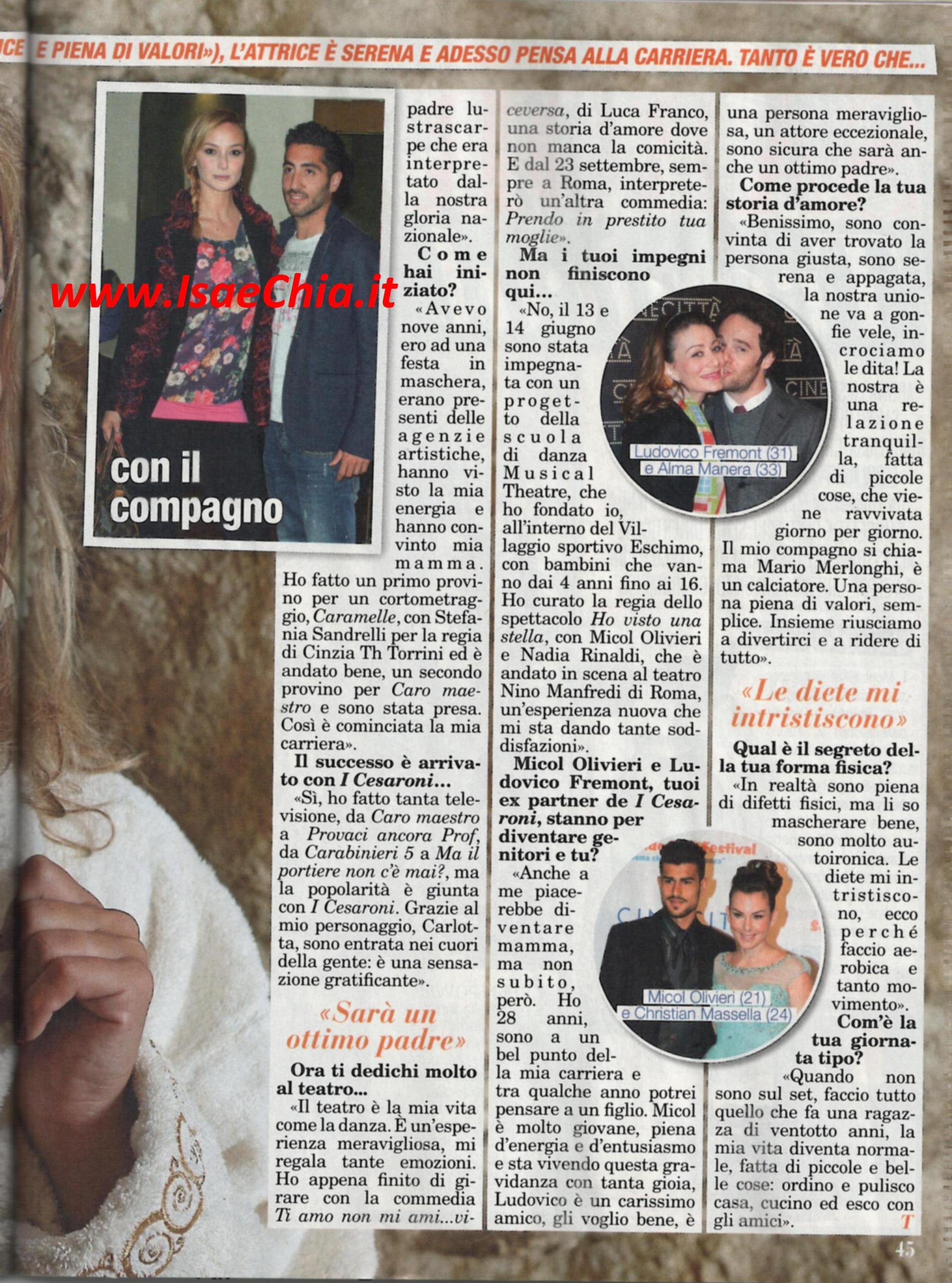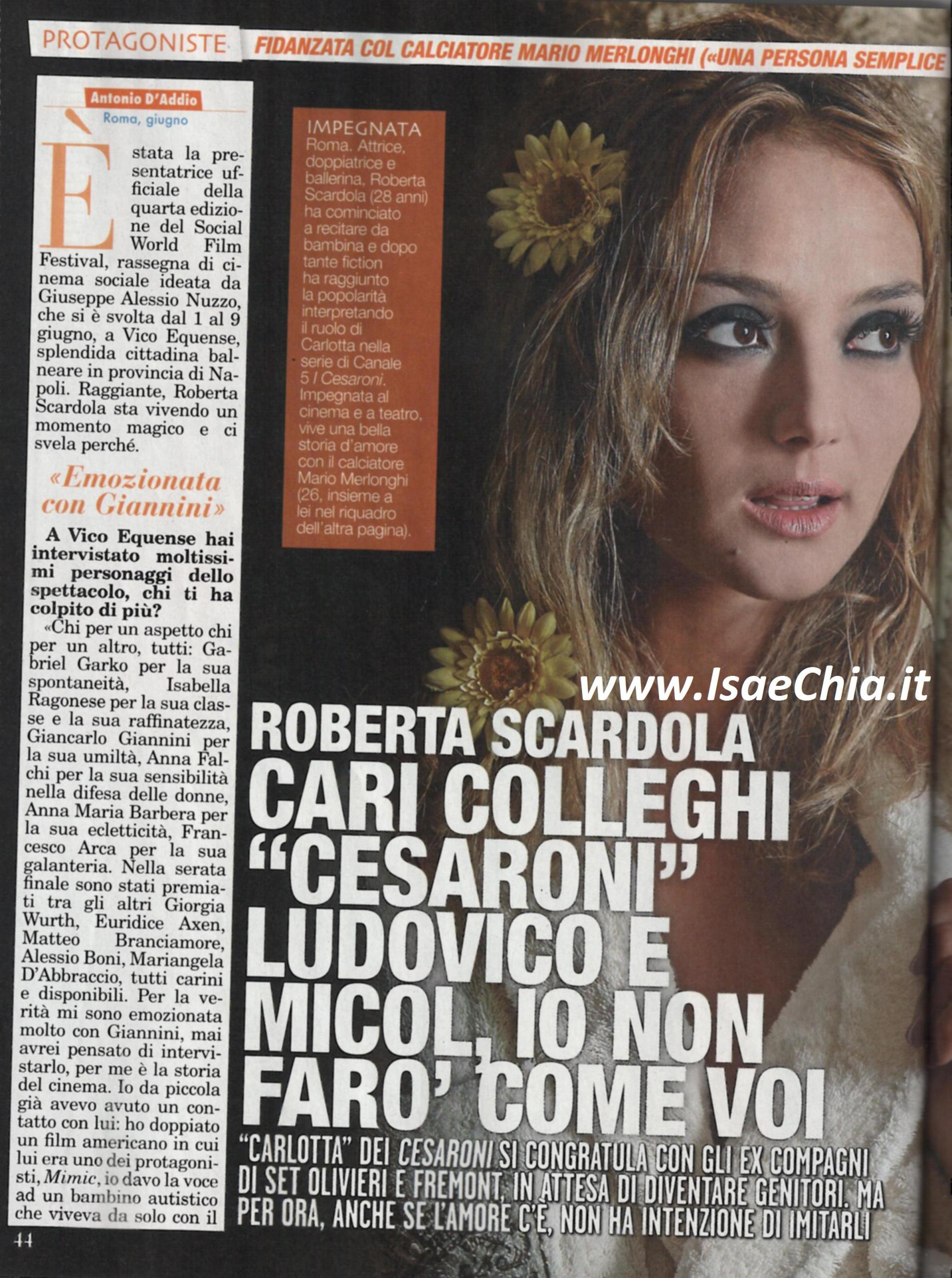 L’attrice Roberta Scardola ha ottenuto la notorietà soprattutto grazie a I Cesaroni, ma la sua carriera è iniziata ben prima: “A 9 anni ero ad una festa, dove c’erano delle agenzie che notarono la mia energia e hanno convinto mia mamma a farmi fare un provino per un cortometraggio, Caramelle. Poi feci quello per Caro maestro e sono stata presa, così è cominciato tutto. Ho fatto tanta tv, tra cui anche Provaci ancora prof e Carabinieri, ma la popolarità è arrivata col mio personaggio di Carlotta ne I Cesaroni. Al momento, invece, mi dedico al teatro, è un’esperienza televisiva che mi regala tante emozioni. Ho appena finito di girare con la commedia Ti amo, non mi ami, viceversa e da settembre interpreterò Prendo in prestito tua moglie. Il 13 e il 14 giugno parteciperò ad un progetto con la scuola di danza che ho fondato e ho curato la regia dello spettacolo Ho visto una stella, con Micol Olivieri e Nadia Rinaldi“. E, a proposito della sua ex collega de I Cesaroni, che diventerà presto mamma nonostante la sua giovane età, così come Ludovico Fremont, che interpretava proprio il suo fidanzato, la Scardola dichiara: “Anche a me piacerebbe diventare mamma, ma non subito. Ho 28 anni, sono a un bel punto della mia carriera e tra qualche anno potrei pensare ad un figlio. Micol è molto giovane e piena di entusiasmo e sta pensando a questa esperienza con tanta gioia. Ludovico è un carissimo amico e una persona eccezionale: sono sicura che sarà un ottimo padre. Con il mio compagno, il calciatore Mario Merlonghi, va benissimo: sono convinta di aver trovato la persona giusta, sono serena e appagata. La nostra è una relazione tranquilla, fatta di piccole cose, insieme ci divertiamo e ridiamo di tutto”.