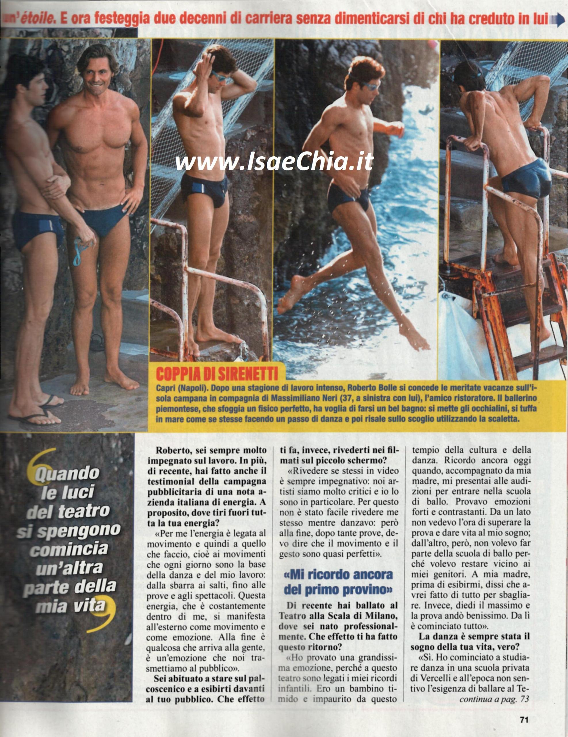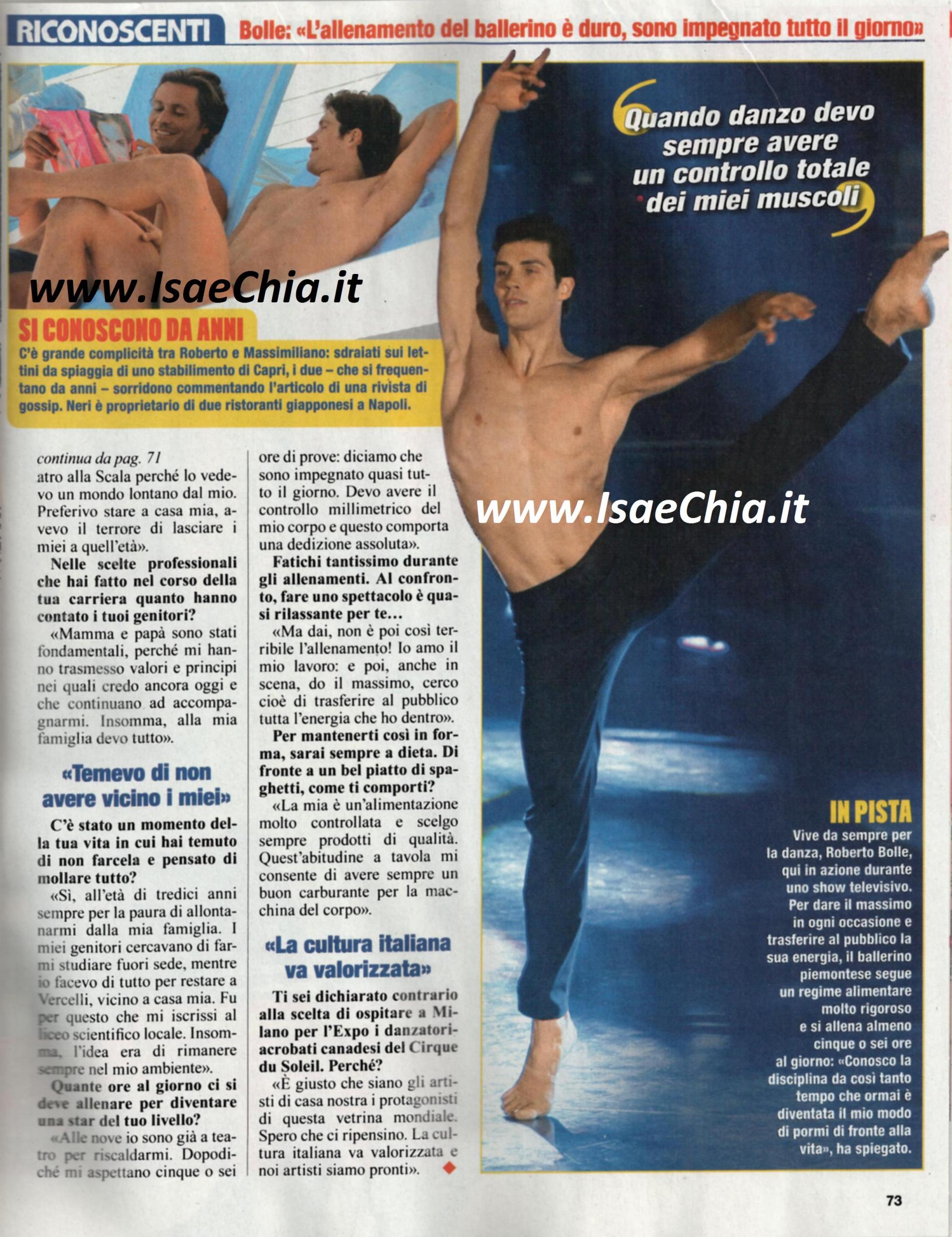 Esplosivo in scena, ma riservato nel privato, l’étoile Roberto Bolle ha smentito il coming out sulla sua presunta omosessualità: “A sorpresa, le prime pagine dei giornali si sono occupate di me, non per i miei successi, ma per la mia vita privata. Roberto Bolle esiste finché le luci non si spengono e cala il sipario. Fuori dal palcoscenico inizia un’altra vita, che non desidero mettere in mostra” ha detto lui. Ad alimentare le voci, forse, sono state le vacanze che ha trascorso con l’amico ristoratore Massimiliano Neri a Capri: eccolo mentre si tuffa come se facesse un passo di danza e poi mentre è steso al sole con l’amico di lunga data. Quest’anno, inoltre, il ballerino festeggia vent’anni di carriera. Quando gli si chiede dove trova l’energia che lo contraddistingue, risponde: “Per me l’energia è legata al movimento, cioè a quello che faccio ogni giorno, dalla sbarra ai salti. Quest’energia si manifesta come movimento ed emozione, che trasmetto al pubblico. Non è stato facile rivedermi sul piccolo schermo mentre danzavo.Noi artisti siamo molto critici e io lo sono in particolare, ma devo dire che dopo molte prove i movimenti erano quasi perfetti”. Poi, ripercorre la sua carriera: “Recentemente sono tornato al Teatro alla Scala, dove sono nato come ballerino: ero un bambino timido e impaurito e ricordo ancora quando andai alle audizioni accompagnato da mia madre. Da un lato volevo superarle, dall’altro non volevo far parte della scuola perché volevo restare vicino ai miei genitori. A mia madre dissi che avrei fatto di tutto per sbagliare…Invece diedi il massimo e la prova andò benissimo. Nelle scelte professionali, mamma e papà sono stati fondamentali perché mi hanno insegnato i principi in cui ancora oggi credo. A 13 anni ho pensato di lasciare tutto: i miei genitori volevano farmi studiare fuori sede, io invece non volevo lasciare casa e mi iscrissi al liceo a Vercelli, vicino casa mia. Ora alle 9 sono già a teatro e mi alleno cinque o sei ore: devo avere un controllo millimetrico del mio corpo; la mia dieta è controllata e scelgo solo prodotti di qualità. Ma io amo il mio lavoro e cerco di trasmettere emozioni al pubblico”. Infine, si dichiara contrario alla scelta di far esibire i ballerini del Cirque du Soleil all’Expo di Milano: “E’ giusto che siano gli artisti di casa nostra i protagonisti di questa vetrina mondiale, e spero che ci ripensino”.