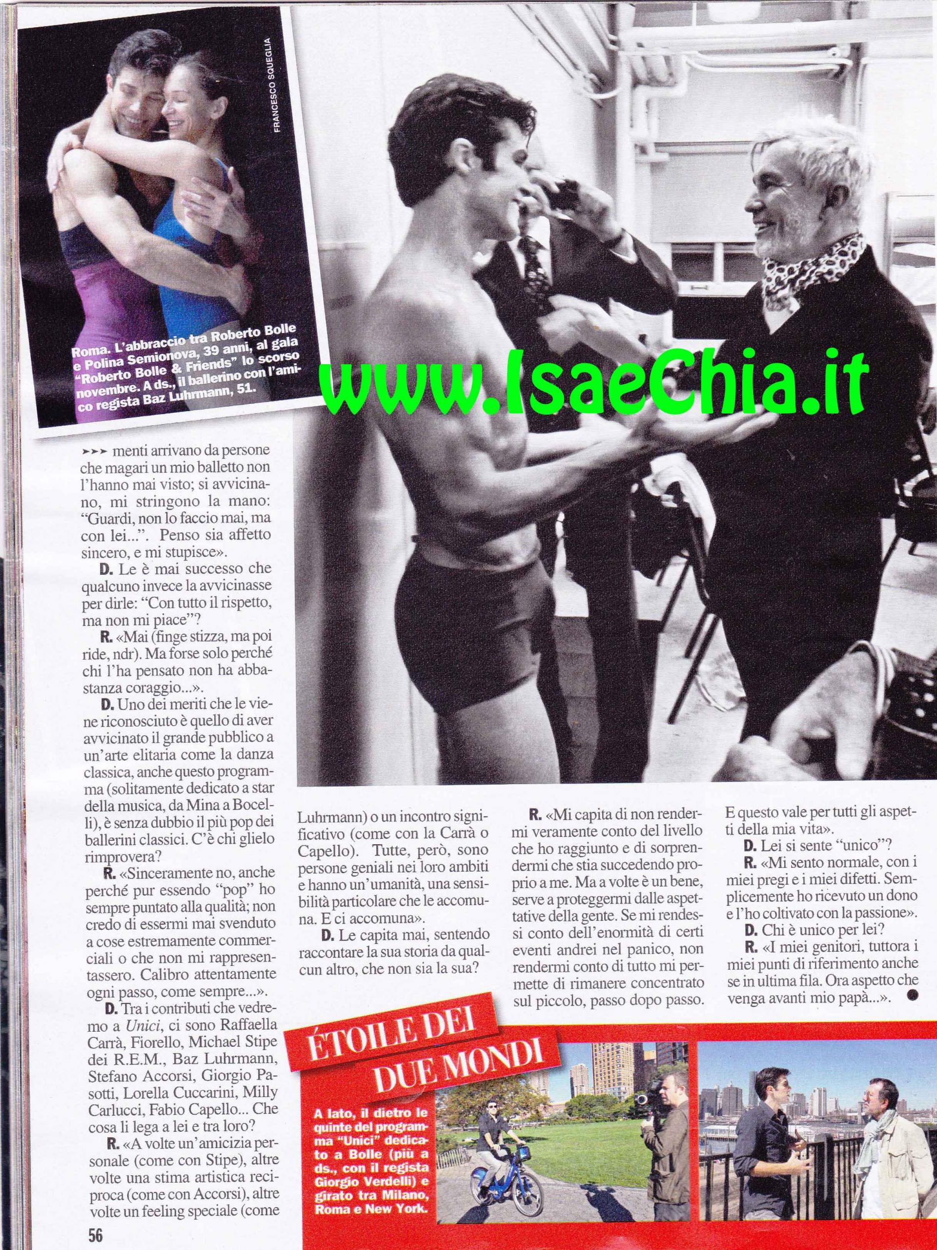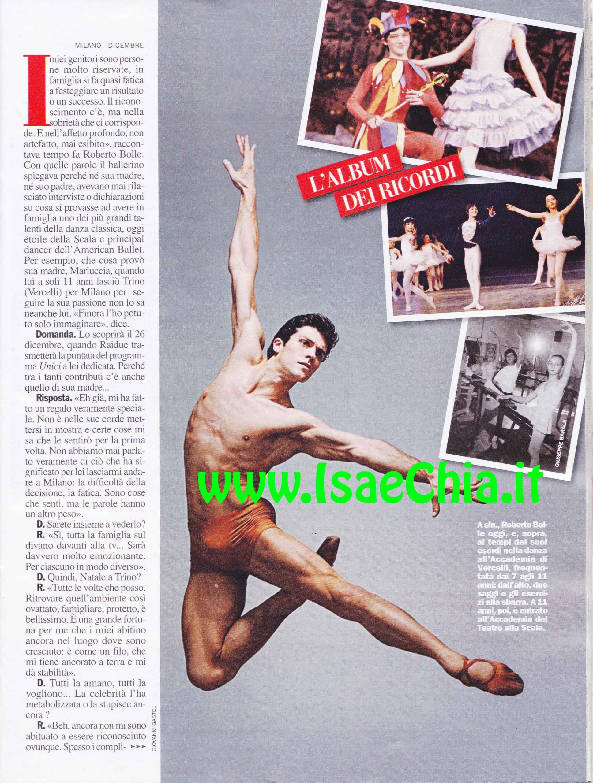 Domani 26 dicembre la Raidue trasmetterà uno speciale di Unici su Roberto Bolle e per la prima volta dopo tanti di carriera, per lui c’è un contributo di sua madre: “Mi ha fatto un regalo veramente speciale. Non è nelle sue corde mettersi in mostra, e certe cose mi sa che le sentirò per la prima volta. Non abbiamo mai parlato di cosa abbia significato per lei lasciarmi andare a Milano a 11 anni. Saremo tutti insieme in famiglia, sul divano, a guardarlo. Torno nel mio paese natale, Trino (VC), tutto le volte che posso: ritrovare quell’ambiente così ovattato e famigliare è bellissimo. Il fatto che i miei abitino ancora dove sono cresciuto è come un filo che mi tiene ancorato e mi dà stabilità. Non mi sono ancora abituato ad essere riconosciuto ovunque”. Quando gli si riconosce il merito di aver avvicinato il grande pubblico alla danza classica, dice: “Pur essendo “pop”, ho sempre puntato sulla qualità, non mi sono mai svenduto a cose estremamente commerciali o che non mi rappresentassero”. Tra i contributi per il servizio su di lui, grandi nomi, come Raffaella Carrà, Micheal Stipe dei REM, Baz Luhrmann, Fiorello: “A Stipe mi lega un’amicizia personale, a Stefano Accorsi stima reciproca, a Luhrmann un feeling speciale, ad altri un incontro significativo. A volte, sentendo raccontare la mia storia, mi è capitato di non rendermi conto del livello che ho raggiunto e di sorprendermi. A volte è un bene che mi protegge dalle aspettative della gente: se mi rendessi conto dell’enormità di certi momenti, andrei nel panico!”