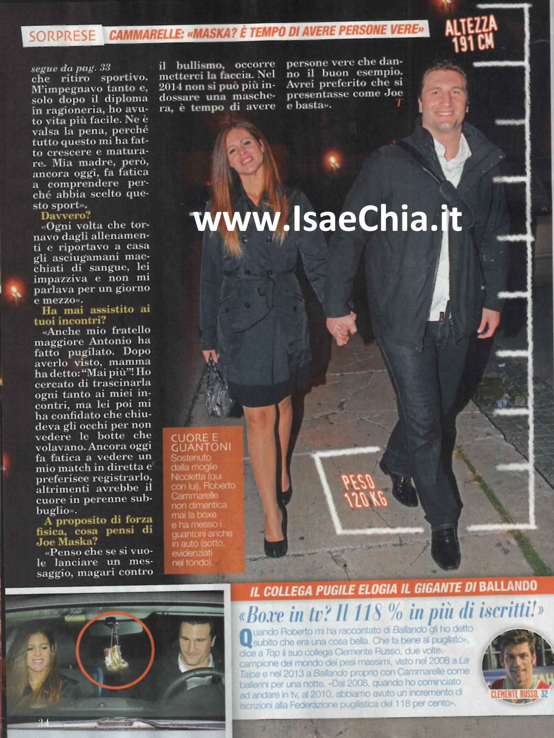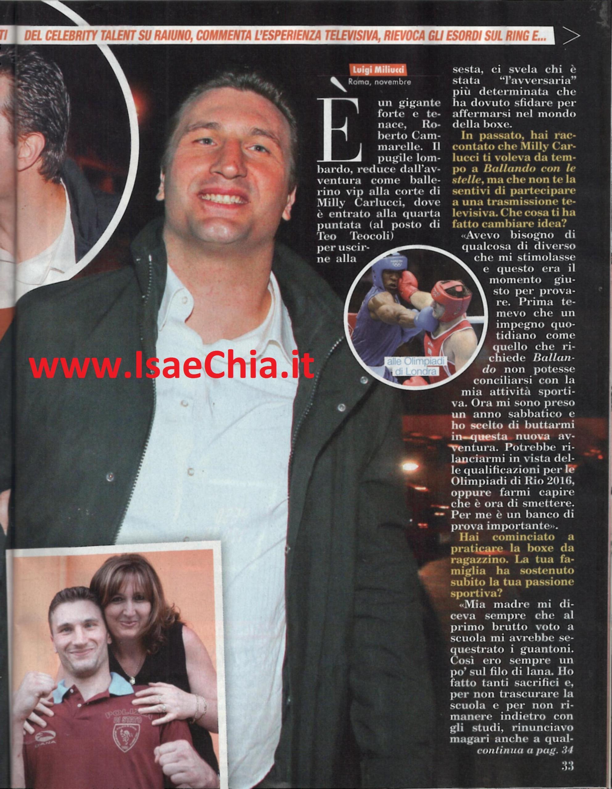 Con l’uscita di Teo Teocoli, alla quarta puntata di Ballando con le stelle è entrato in gioco il pugile lombardo Roberto Cammarelle. Adesso, reduce dalla gara di ballo, è ritornato dalla moglie Nicoletta, con la quale è stato fotografato in un momento romantico e racconta: “Milly Carlucci mi voleva da tempo, ma prima non me la sentivo di partecipare ad un programma televisivo. Adesso avevo bisogno di qualcosa nuovo, che mi stimolasse, e questo era il momento giusto per provare. Temevo che non potesse conciliarsi con la mia attività sportiva, ma mi sono preso un anno sabbatico e ho scelto di buttarmi in questa nuova avventura: potrebbe rilanciarmi in vista delle qualificazioni per le Olimpiadi 2016, oppure farmi capire che è ora di smettere. Da ragazzo, mia mamma mi diceva che al primo brutto voto mi avrebbe sequestrato i guantoni, così ho fatto tanti sacrifici per non rimanere indietro con lo studio. Solo dopo il diploma ho avuto vita facile. Tutto questo mi è servito perché mi ha fatto maturare, anche se mia madre non ha mai capito la mia scelta di fare questo sport. Quando tornavo con gli asciugamani sporchi di sangue, lei impazziva e non mi parlava per un giorno e mezzo. Anche mio fratello Antonio ha fatto pugilato e, dopo aver visto un suo incontro, ha detto ‘Mai più’. Ho cercato di trascinarla a qualche mio incontro, ma lei chiudeva gli occhi e tuttora li registra e non li guarda in diretta!”. Infine, quando gli si chiede cosa pensa di un altro sportivo concorrente di Ballando, Joe Maska, che ha celato la sua vera identità dietro una maschera, risponde: “Penso che se si vuole mandare un messaggio contro il bullismo, occorre metterci la faccia. Nel 2014 non ci si può più indossare una maschera, è tempo di avere persone che danno il buon esempio. Avrei preferito che fosse Joe e basta”.