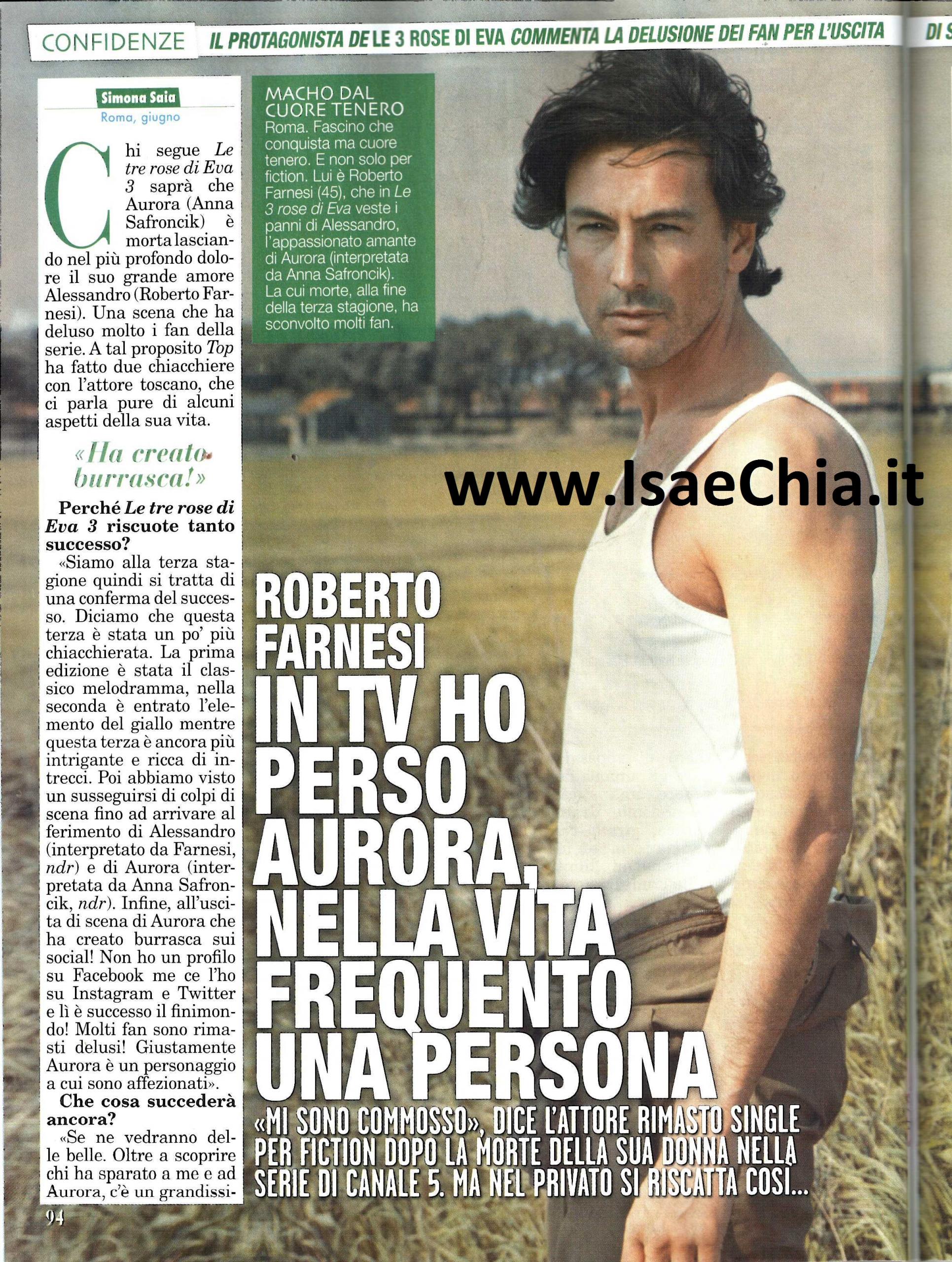 Chi segue la fiction di Canale 5 Le tre rose di Eva saprà che la protagonista Aurora (interpretata da Anna Safroncik) è morta, lasciando nel più profondo dolore il suo grande amore Alessandro, interpretato da Roberto Farnesi. Una scena che ha deluso molte fan. Quando gli si chiede come mai Le tre rose di Eva ha tanto successo, l’attore toscano risponde: “Siamo alla terza stagione, quindi è una conferma. Diciamo che questa è stata quella più chiacchierata: la prima era il classico melodramma, nella seconda è entrato l’elemento del giallo e questa è ancora più ricca di intrecci. Non ho un profilo su Facebook, ma ce l’ho su Instagram e Twitter e so che lì è successo il finimondo! Molti fan sono rimasti delusi, Giustamente, Aurora è un personaggio a cui sono affezionati. Quando morì il personaggio di Ricky Memphis in Distretto di polizia ci fu una sommossa popolare, così come quando morì Serena Bonanno a CentoVetrine. Ora se ne vedranno delle belle: oltre a scoprire chi è stato a sparare a me e ad Aurora, c’è un grandissimo colpo di scena nell’ultima puntata. Direi geniale. Ma non riguarda me, ma Edoardo (Luca Capuano). Il successo della serie sta nel fatto che non è scontata, è sempre intrigante. Con la morte di Aurora si apre la fase più romantica, ma per capire pienamente il senso delle mie parole bisogna guardare cosa succede. Comunque, secondo me, c’è molto romanticismo in questa fase e lo ripeto anche se sono stato contestato. Poi lo si vedrà: l’epilogo drammatico è romantico se vissuto in un certo modo. Vedremo lui combattere per capire chi ha sparato e sente lei molto vicina. Questa cosa mi fa commuovere. Sì, anche sul set mi sono commosso, perché è una storia molto coinvolgente e l’amore di lui è molto forte. Molti mi scrivono ringraziandomi di aver regalato emozioni e io mi auguro di avere le capacità per poter continuare a farlo. Una quarta stagione? E’ presto per dirlo. Ci tengo a sottolineare che non bisogna dimenticare gli altri dieci protagonisti. Se fossimo stati solo io e Aurora, la fiction era già finita da un pezzo!“. Poi, quando gli si chiede se, dopo la fine della storia con Rausy, una ragazza molto più giovane di lui, è di nuovo fidanzato, l’ex concorrente di Ballando con le stelle rivela: “Frequento una persona da qualche mese e vediamo, se sono rose fioriranno! Sono un esteta, sono sensibile alla bellezza esteriore, ma anche all’intelligenza e alla simpatia: da buon toscano mi piacciono le persone simpatiche. Adesso ho appena finito il film Infernet, che denuncia il lato oscuro della Rete, di cui ho scritto il soggetto con un amico e credo sarà al cinema in autunno. Ma nel tempo libero mi dedico al mio ristorante a Pisa, che propone i prodotti di zona, anche biologici e mi rilasso in campagna, con i cani e andando a cavallo, leggendo e guardando tantissimi film“.