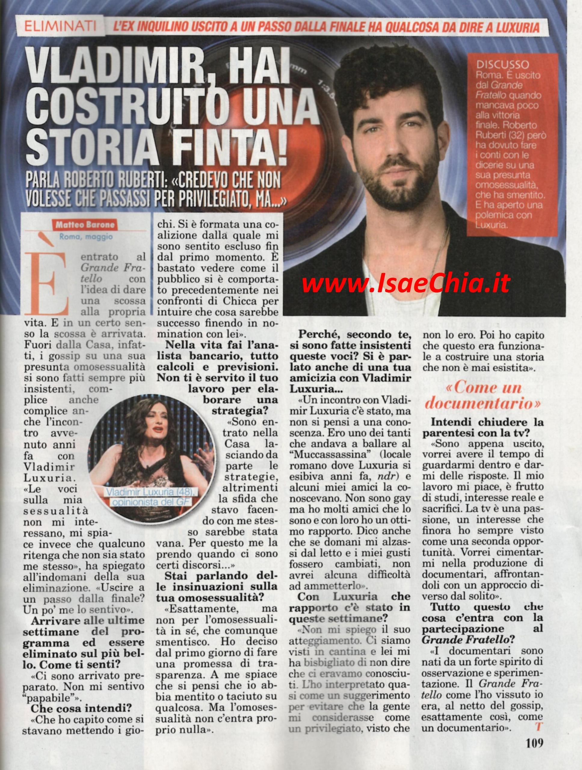 Il concorrente del Grande fratello 13 Roberto Ruberti è stato al centro del gossip per una sua presunta omosessualità nonostante il fatto che nella Casa avesse intrecciato una storia con Diletta Di Tanno. Ad alimentare le voci ha contribuito anche l’incontro con Vladimir Luxuria, avvenuto qualche anno fa, sul quale anche l’opinionista ha giocato. “Le voci sulla mia sessualità non mi interessano, ma mi spiace che qualcuno ritenga che non sia stato me stesso. Un incontro con Luxuria c’è stato, ma non si pensi a una conoscenza. Ero uno dei tanti che andava a ballare al Muccassassina, locale romano dove lei si esibiva, e alcuni miei amici la conoscevano. Non sono gay, ma ho amici che lo sono e con loro ho un ottimo rapporto. Se domani mi alzassi dal letto e i miei gusti sessuali fossero cambiati, non avrei problemi ad ammetterlo. Quando io e Vladi ci siamo visti in cantina, mi ha bisbigliato all’orecchio di non dire che ci conoscevamo. Io l’ho preso come un suggerimento affinché la gente non pensasse che fossi un privilegiato, ma poi ho capito che era servito per costruire una storia mai esistita”. Poi, parlando della sua eliminazione ad un passo dalla finale, dice: “Me lo sentivo: si era creata una coalizione dalla quale mi ero sentito escluso e bastava vedere come si era comportato il pubblico con Chicca Rocco per capire che avrebbe salvato lei. Il mio lavoro mi piace, la tv è una passione che vedo come seconda opportunità e mi piacerebbe fare dei documentari con un approccio diverso dal solito: il GF così come l’ho vissuto io, al netto dei gossip, era esattamente un documentario!”