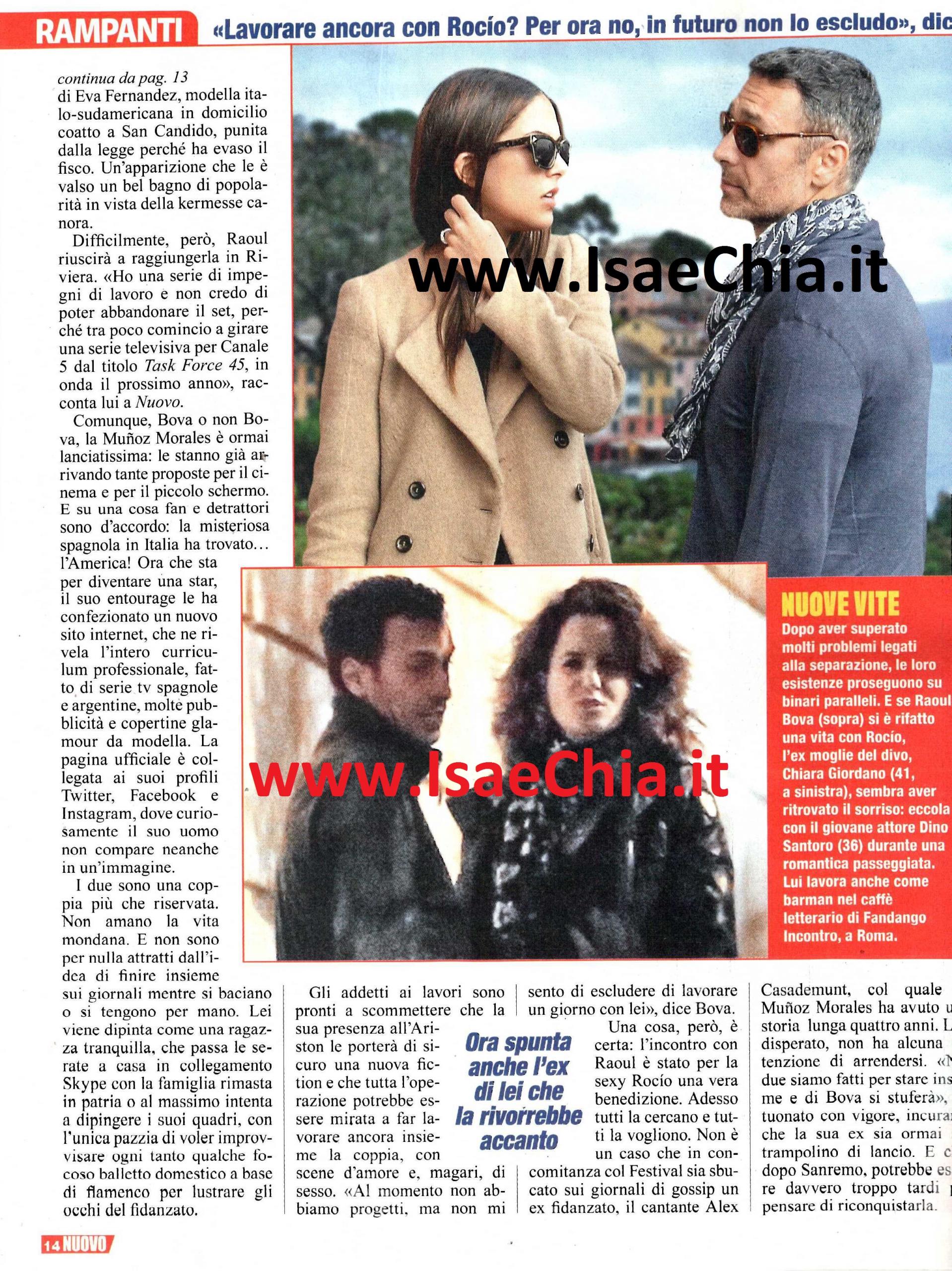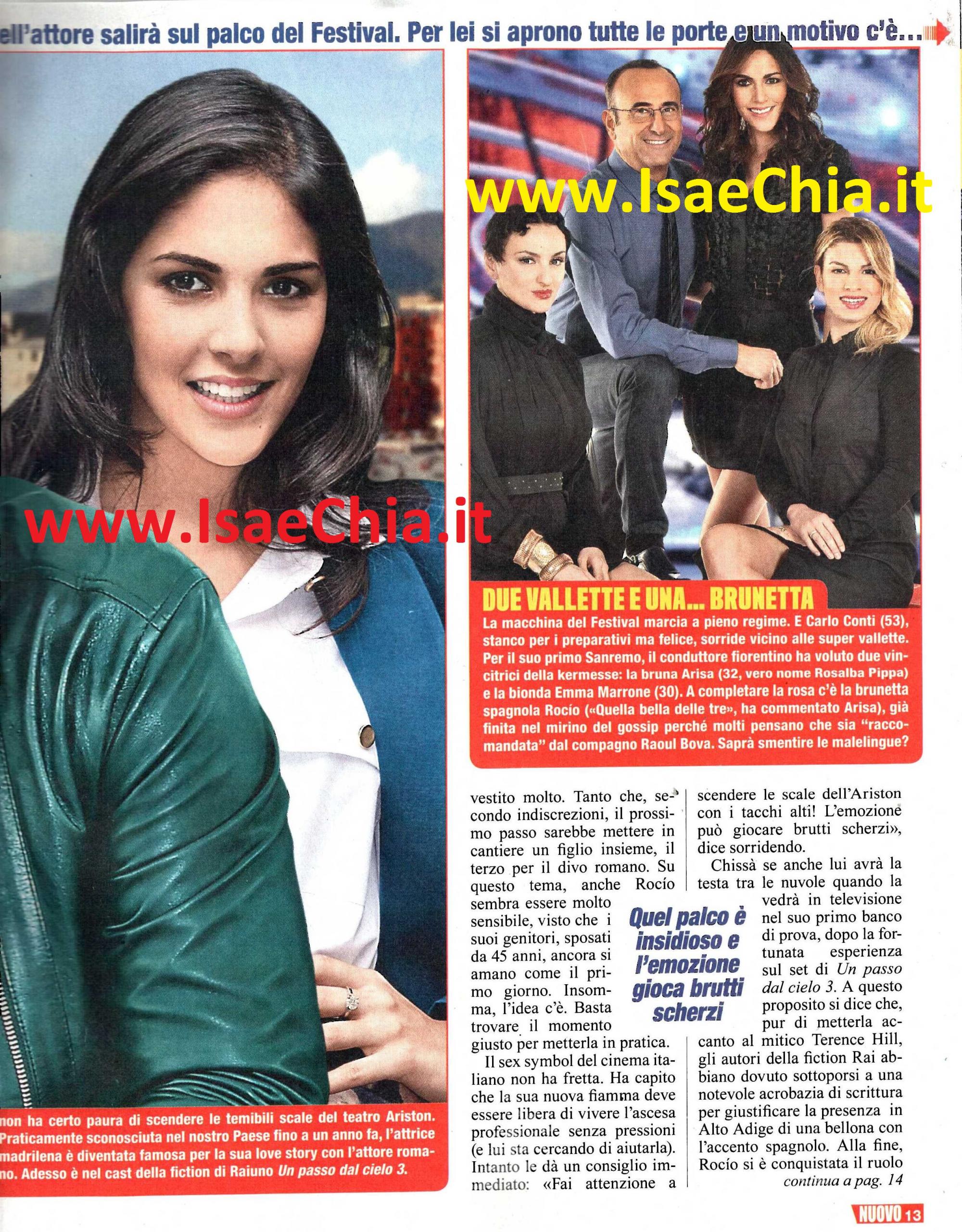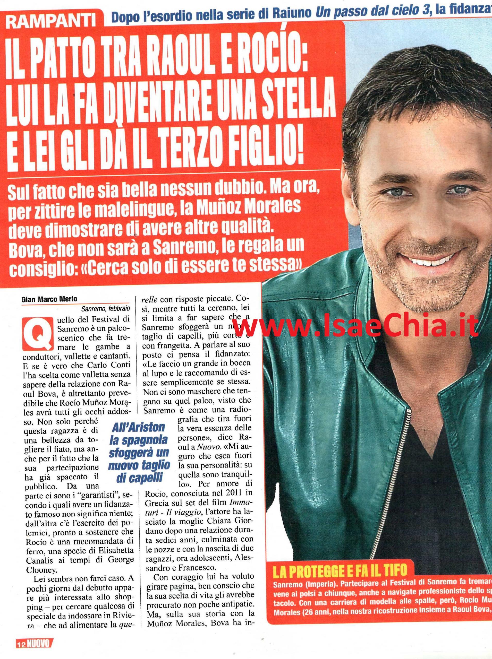 Insieme ad Arisa ed Emma Marrone, sul palco dell’Ariston per il 65° Festival di Sanremo, ci sarà la bella Rocío Muñoz Morales. In molti hanno creduto che Carlo Conti l’avesse scelta solo perché è la compagna di Raoul Bova, ma lui ha precisato che non sapeva che stesse con lui. In ogni caso, la bella spagnola avrà tutti gli occhi addosso e ha già diviso in due il pubblico: c’è chi dice che essere fidanzati con un uomo famoso non vuol dire niente e chi afferma che sia raccomandata. Lei però, sembra non farci caso e le sole dichiarazioni che ha fatto finora riguardano i suoi capelli, che, a quanto pare, saranno più corti e con una frangetta. A parlare al suo posto, però, c’è il suo fidanzato: “Le faccio un grande in bocca al lupo e le raccomando di essere sempre sé stessa. Non ci sono maschere che tengano su quel palco, Sanremo è come una radiografia che tira fuori la vera essenza delle persone. Mi auguro che esca fuori la sua personalità: su quella sono tranquillo” ha dichiarato l’attore. Per lei, infatti, ha lasciato la moglie Chiara Giordano, dopo 16 anni di matrimonio e due figli, oggi adolescenti, Alessandro e Francesco e pare aver investito parecchio in questa nuova storia. Tanto che, secondo alcune indiscrezioni, i due starebbero pensando di mettere in cantiere un figlio. Nel frattempo, la vedrà mettersi alla prova nella prima esperienza televisiva dopo A un passo dal cielo 3. Proprio a proposito di quest’ultimo, c’è chi notava che gli autori della fiction hanno dovuto fare delle vere e proprie acrobazie di scrittura per giustificare la presenza di una bellona dall’accento spagnolo in Alto Adige! Alla kermesse musicale, però, Bova potrebbe non essere presente: “Ho una serie di impegni di lavoro e non credo di poter abbandonare il set, perché tra poco comincerò a girare la fiction Task Force 45″. Strana dichiarazione, soprattutto se si considera che la coppia non si fa vedere quasi mai insieme in pubblico…A complicare il tutto ci si è messo l’ex di lei, l’attore Alex Casademunt, che ha dichiarato: “Io e Rocio siamo fatti per stare insieme e lei presto si stancherà” (QUI per leggere l’intervista completa). E, a quanto pare, non è l’unica ex a ritornare come un fulmine a ciel sereno. Il settimanale Nuovo ha scoperto che Raoul e l’ex moglie Chiara nascondono qualcosa: l’attore viene pizzicato mentre entra nel portone di un palazzo di Roma. Da quello stesso portone, poco dopo, esce la Giordano guardinga. Poco dopo, è il momento di Raoul, che esce mentre guarda il cellulare. Prima di azzardare ipotesi, è bene precisare che nessuno dei due abita in quel palazzo, dove si sono trovati per qualche ora. Che cosa siano andati a fare e perché con aria circospetta è ancora un mistero. Si sa solo che il condominio ospita degli studi legali e quindi potrebbero aver solo discusso i dettagli del divorzio. Sarà proprio così?