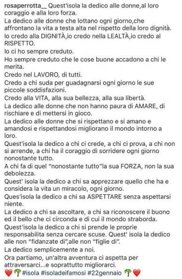 E invece pochi minuti fa, su Instagram, è stata la stessa Perrotta a scrivere un lungo messaggio prima della sua partenza per l’Honduras, un messaggio dal quale emerge tutta la riconoscenza e l’emozione per la nuova avventura che affronterà a partire dal 22 gennaio, giorno della prima diretta della tredicesima edizione del programma condotto da Alessia Marcuzzi. Non manca, sul finale, una “frecciatina”, Rosa infatti scrive: “Questa isola la dedico alle non”fidanzate di..” e alle non “figlie di…””, frase generica o con un destinatario ben preciso?