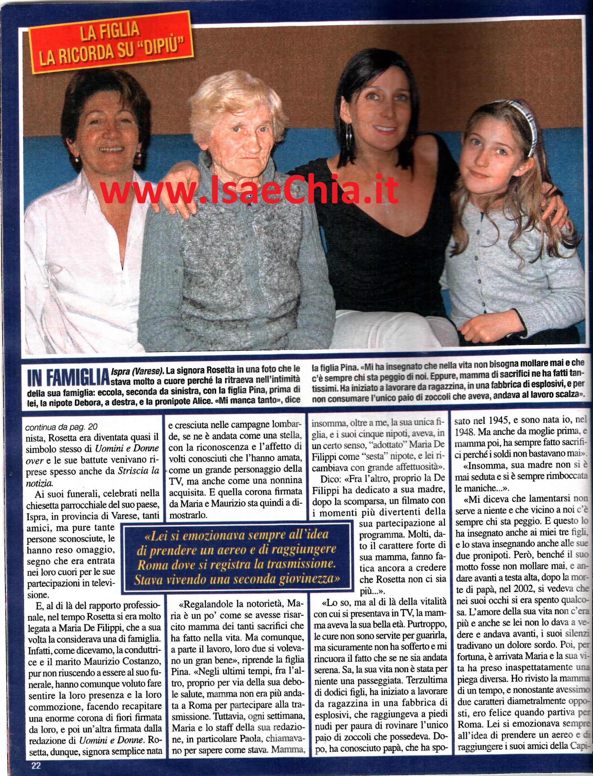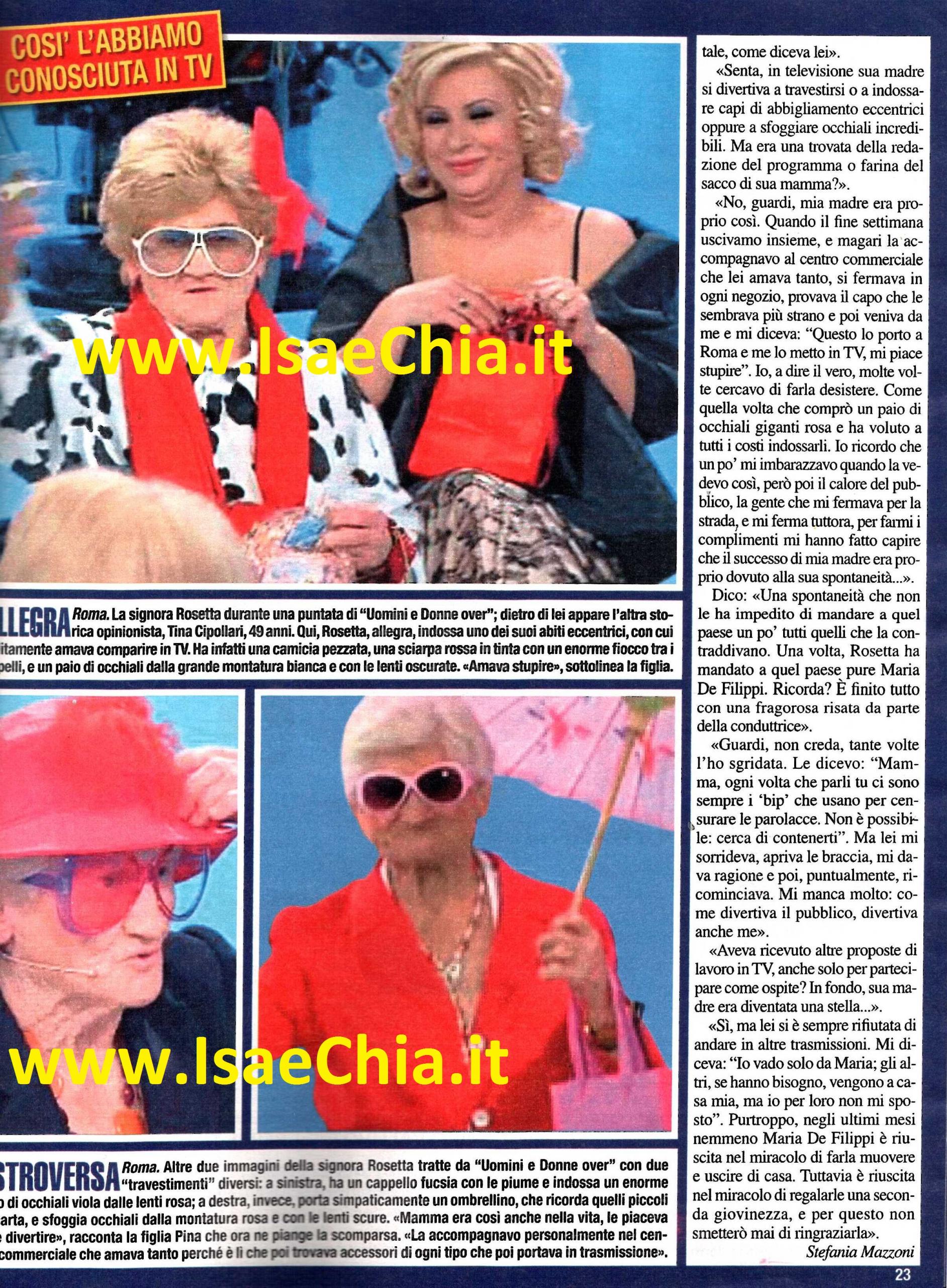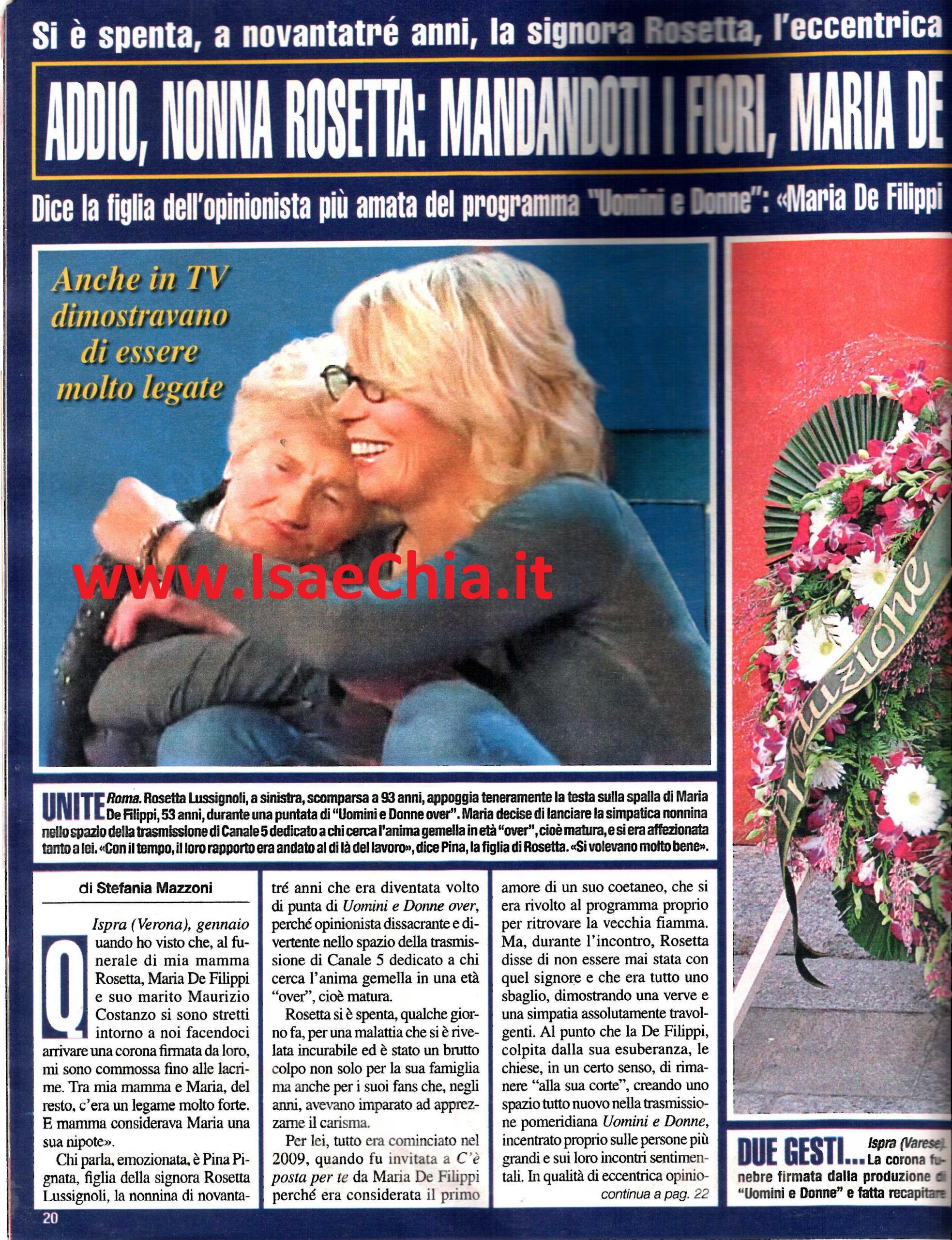 Tutto è iniziato nel 2009: l’ultraottantenne Giuseppe Grieco cercava un suo amore dell’adolescenza a C’è posta per te e ha chiamato, per sbaglio, Rosetta Lussignoli, poi rivelatasi la sorella della sua amata Lina. Maria De Filippi è stata colpita a tal punto dalla vitalità e dalla spontaneità di Rosetta che ha deciso di invitarla a Uomini e Donne come ospite d’onore della nuova versione del programma, il Trono Over, che avrebbe avuto come scopo quello di trovare l’amore anche ai più grandi. Qualche giorno fa, però, Rosetta si è spenta a 93 anni, per una malattia che si è rivelata incurabile. Ai suoi funerali, tenutisi nella chiesetta di Ispra, il paesino in provincia di Varese dove viveva l’esuberante nonnina, Maria e suo marito Maurizio Costanzo, che l’aveva conosciuta solo al telefono, hanno voluto far sentire la loro presenza e la loro commozione facendo recapitare un’enorme corona di fiori, insieme ad un’altra spedita dalla redazione di Uomini e donne. Quella corona è stata molto importante per i cari di Rosetta, come testimonia sua figlia Pina: “Quando ho visto che al funerale di mia mamma Rosetta, Maria e Maurizio si sono stretti intorno a noi facendoci recapitare quei fiori, mi sono commossa fino alle lacrime. Tra lei e Maria, infatti, c’era un rapporto molto forte e mamma la considerava una nipote. Regalandole la notorietà, è come se Maria l’avesse ricompensata un po’ di tutti i sacrifici che ha fatto nella vita. Ma comunque, a parte il lavoro, loro due si volevano un gran bene. Negli ultimi tempi, a causa della sua debole salute, mamma non era più andata in trasmissione. Ciononostante, Maria e lo staff della redazione, in particolare Paola, chiamavano per sapere come stava“. La signora di Canale 5, infatti, ha anche dedicato a Rosetta un video con tutti i momenti più divertenti e una commovente dedica alla fine. Molti, data l’energia della nonnina, hanno fatto fatica a credere che non ci fosse più: “Lo so” dice la figlia Pina, “ma al di là della vitalità che mostrava in tv, la mamma aveva una bella età. Purtroppo le cure non sono servite a guarirla, ma so che non ha sofferto e mi rincuora il fatto che se ne sia andata serena. La sua vita non è stata una passeggiata: terzultima di dodici figli, ha iniziato a lavorare da ragazzina in una fabbrica di esplosivi, che raggiungeva a piedi nudi per paura di rovinare l’unico paio di zoccoli che possedeva. Dopo ha conosciuto papà, che ha sposato nel 1945 e nel ’48 sono nata io. Ma anche da moglie e madre ha fatto sacrifici, perché i soldi non bastavano mai. Eppure diceva che lamentarsi non serve a niente e c’è sempre chi sta peggio. Questo lo ha insegnato anche ai miei tre figli e alle sue due pronipoti. Benché il suo motto fosse non mollare mai, si vedeva che dopo il 2002, anno della morte di mio padre, nei suoi occhi si era spento qualcosa. Il suo amore non c’era più e anche se lei non lo dava a vedere, i suoi silenzi tradivano un dolore sordo. Poi, per fortuna, è arrivata Maria e la sua vita ha preso una piega diversa. Ho rivisto la mamma di un tempo e nonostante avessimo due caratteri diametralmente diversi, ero felice ogni volta che partiva per Roma: lei si emozionava sempre all’idea di prendere l’aereo e raggiungere i suoi amici“. Quando le si chiede se era la Redazione a chiederle di indossare i suoi stravaganti occhiali da sole o i suoi vestiti eccentrici, la signora Pina risponde: “No, mia madre era proprio così. Quando la accompagnavo al centro commerciale, prendeva il capo d’abbigliamento più strano e mi diceva ‘Questo lo porto a Roma e lo metto in tv. Mi piace stupire!’. Io, a dire il vero, cercavo di farla desistere, come quando comprò quegli occhiali giganti rosa. Un po’ m’imbarazzavo a vederla così, però il calore del pubblico e della gente che la fermava per strada mi faceva capire che il suo successo era dovuto proprio alla sua spontaneità. Tante volte l’ho sgridata perché mandava a quel paese la De Filippi. Le dicevo: ‘Mamma, ogni volta che parli tu ci sono i bip per censurare le parolacce. Cerca di contenerti!’, ma lei apriva le braccia, mi diceva che avevo ragione e poi, puntualmente, ricominciava. Aveva ricevuto anche altre proposte, in altre trasmissioni, ma lei ha sempre rifiutato. Diceva: “Io vado solo da Maria. Gli altri, se hanno bisogno, vengono a casa mia. Ma io per loro non mi sposto!”. Purtroppo, negli ultimi mesi, nemmeno Maria è riuscita nel miracolo di farla spostare da casa. Ma è riuscita nel miracolo di regalarle una seconda giovinezza e per questo non smetterò mai di ringraziarla“.