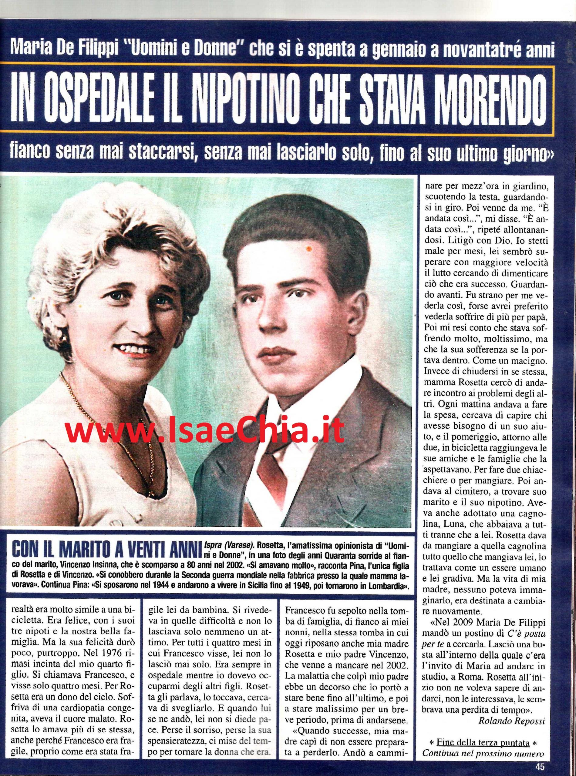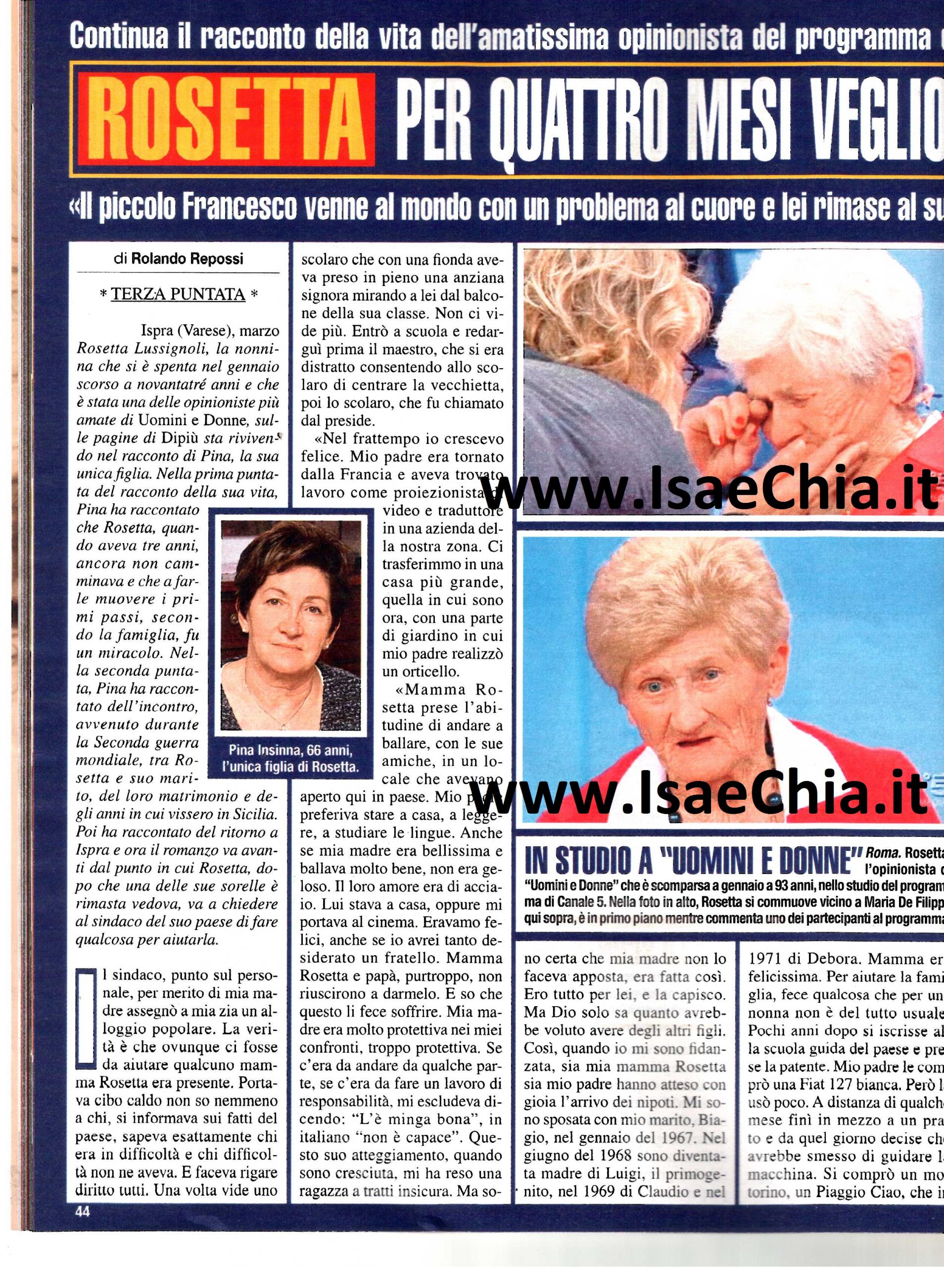La scomparsa della mitica vecchina Rosetta, ospite fissa e ispiratrice del Trono Over, ha lasciato un grande dispiacere in tutto il pubblico che da anni la seguiva a Uomini e Donne, ma soprattutto alla sua famiglia. A due mesi da quel giorno di gennaio in cui Rosetta ci ha lasciati, la figlia Pina racconta un altro pezzo della storia della sua vita: in alcune precedenti interviste, infatti, aveva raccontato l’incontro tra i genitori e il loro grande amore. Stavolta, invece, racconta il gesto di altruismo fatto per sua sorella: “Per merito di mia madre, il sindaco, punto sul personale, assegnò a mia zia un alloggio popolare. La verità è che ovunque ci fosse da aiutare qualcuno, mia mamma Rosetta era sempre presente. Portava il cibo caldo non so nemmeno a chi, si informava sui fatti del paese e su chi fosse in difficoltà. E faceva rigare dritto tutti! Una volta vide uno scolaro che aveva preso di mira con la fionda un’anziana signora dal balcone della scuola. Non ci vide più: entrò a scuola a redarguire il maestro! Nel frattempo, io crescevo felice. Mio padre era tornato dalla Francia e aveva trovato lavoro come proiezionista di video e traduttore. Ci trasferimmo in una casa più grande e mamma prese l’abitudine di andare a ballare con delle amiche, mentre papà preferiva restare a casa a studiare le lingue. Anche se mia madre era bellissima e ballava molto bene, lui non era geloso. Eravamo felici e io desideravo un fratello, ma loro non riuscirono a darmelo e so che questo li fece soffrire. Mia madre era molto protettiva nei miei confronti; se c’era da mandarmi da qualche parte, lei diceva ‘L’è minga bona’, cioè ‘non è capace’ e questo suo atteggiamento, quando sono cresciuta, mi ha reso a tratti insicura. Ma non lo faceva apposta, era fatta così e io ero tutto per lei. Quando mi sono fidanzata e poi sposata con mio marito Biagio nel 1967, sia mia mamma che mio padre hanno atteso con gioia i nipoti. Nel ’68 ho avuto Luigi, nel ’69 Claudio e nel ’71 Debora e lei era felicissima. Per aiutare la famiglia, fece qualcosa che all’epoca era inusuale: si iscrisse alla scuola guida e prese la patente. Mio padre le comprò una Fiat 127 bianca, che però usò poco: qualche mese dopo finì in mezzo ad un prato e decise che avrebbe smesso di guidare! Così comprò un motorino, in realtà simile ad una bicicletta. Ma la sua felicità durò poco: nel 1976 ebbi un altro figlio, Francesco, ma morì pochi mesi dopo. Lei lo amava con tutta se stessa, anche perché Francesco soffriva di una cardiopatia congenita, era fragile proprio come lo era lei da bambina. Per tutti i 4 mesi in cui Francesco visse, lei non lo lasciò mai solo. Era sempre in ospedale mentre io dovevo occuparmi degli altri figli. Gli parlava, lo toccava, cercava di svegliarlo. E quando lui se ne andò, lei non si diede pace. Perse il sorriso, ci mise tempo a ritornare la donna che era. Francesco fu sepolto nella tomba di famiglia, vicino ai miei nonni, vicino a lei e a mio padre Vincenzo. Mio padre morì nel 2002; la sua malattia lo portò a stare bene fino alla fine e poi a stare malissimo per un breve periodo, prima di lasciarci. Quando successe, mia madre non era preparata a perderlo. Andò a camminare per mezz’ora in giardino, scuotendo la testa, poi venne da me e disse ‘E’ andata così’. Litigò con Dio. Io stessi male per mesi, lei sembrò superare in fretta il lutto, dimenticando, guardando avanti. Poi mi resi conto che stava soffrendo moltissimo, ma che la sofferenza se la portava dentro. Invece di chiudersi in sé stessa, cercò di andare incontro agli altri. Quando faceva la spesa, vedeva chi aveva bisogno di aiuto e il pomeriggio, verso le 2, andava in bici dalle amiche, che la aspettavano per due chiacchiere o per mangiare. Poi andava al cimitero a trovare il marito e il nipotino. Poi adottò un cagnolino, Luna, che abbaiava a tutti tranne a lei. Le dava da mangiare tutto quello che mangiava lei, la trattava come un essere umano e lei gradiva. Ma la vita di mia madre era destinata a cambiare nuovamente, quando nel 2009 le arrivò l’invito di C’è posta per te. All’inizio non voleva saperne di andarci, le sembrava una perdita di tempo“…Eppure, sappiamo tutti com’è finita: colpita dalla sua vivacità, Maria De Filippi l’ha poi invitata a Uomini e Donne, dove ha fatto da madrina alla versione Senior del programma, che riportava le sue parole: ‘l’amore non ha età’.