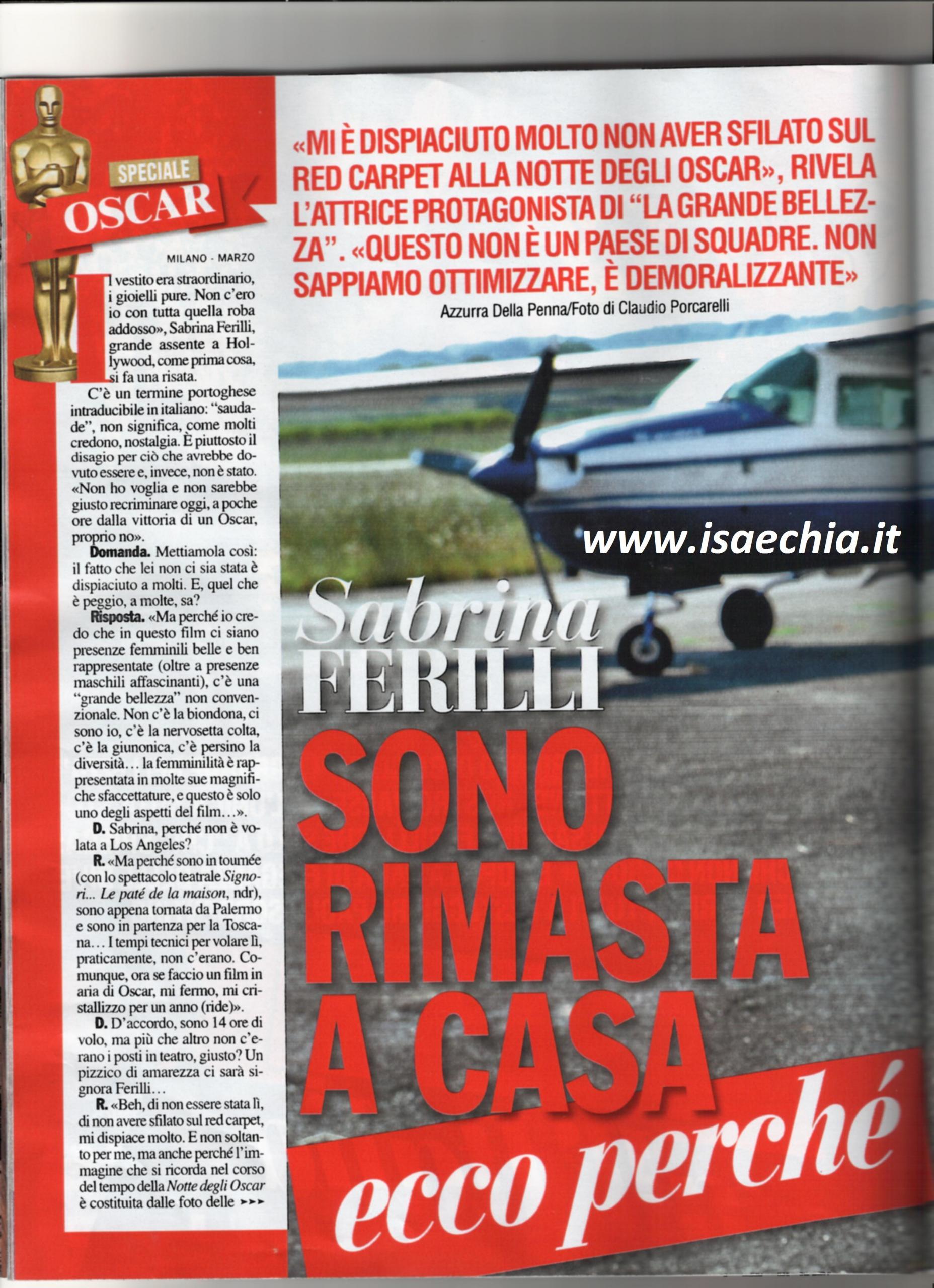 L’attrice Sabrina Ferilli spiega perché non ha presenziato alla cerimonia degli Oscar, durante la quale il film La grande bellezza, in cui interpretava Ramona, è stato premiato: “Sono in tournée teatrale, sono appena tornata da Palermo e sto andando in Toscana. Non c’erano i tempi tecnici per volare a Los Angeles. Ora, se faccio un film in aria di Oscar, mi cristallizzo per un anno!”. Quando le si chiede se era perché non c’erano posti in teatro, risponde: “Mi è dispiaciuto molto non essere stata lì e non aver sfilato sul red carpet. Non soltanto per me, ma anche perché l’immagine degli Oscar che si ricorda nel tempo è costituita dalle foto delle attrici che solcano il tappeto rosso in abiti favolosi. Per quanto possa essere ottimista, dubito che mi possa succedere di nuovo. Io sono sempre stata capace di lavorare e fare tanto, ma poi l’ “incoronazione” mi è sempre sfuggita. Questo è un Paese di talenti, ma non di squadre; è a livello di impresa che manchiamo. La grande bellezza non l’hanno amplificato, l’hanno detonato, ed è demoralizzante, perché erano 15 anni che non vincevamo un Oscar. E’ un Paese in cui al primo che è andato sulla Luna, non chiedono “Com’era?” ma “Come l’ha presa sua sorella che, invece, è rimasta a casa?”. Sa che le dico? Ho ancora un po’ d’anni davanti e prima o poi, a Hollywood, ci vado”.
