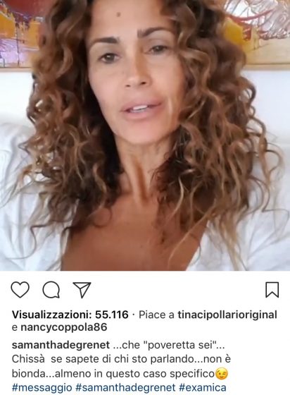 La De Grenet ha condiviso sui propri profili social un video in cui parla di una donna romana, “molto romana”, che non avrebbe certo speso delle belle parole nei suoi confronti. Le frasi che la Mosetti avrebbe detto sul suo conto dal parrucchiere, sarebbero state riportate a una delusissima Samantha, che ha, così, deciso di sfogarsi su Instagram.