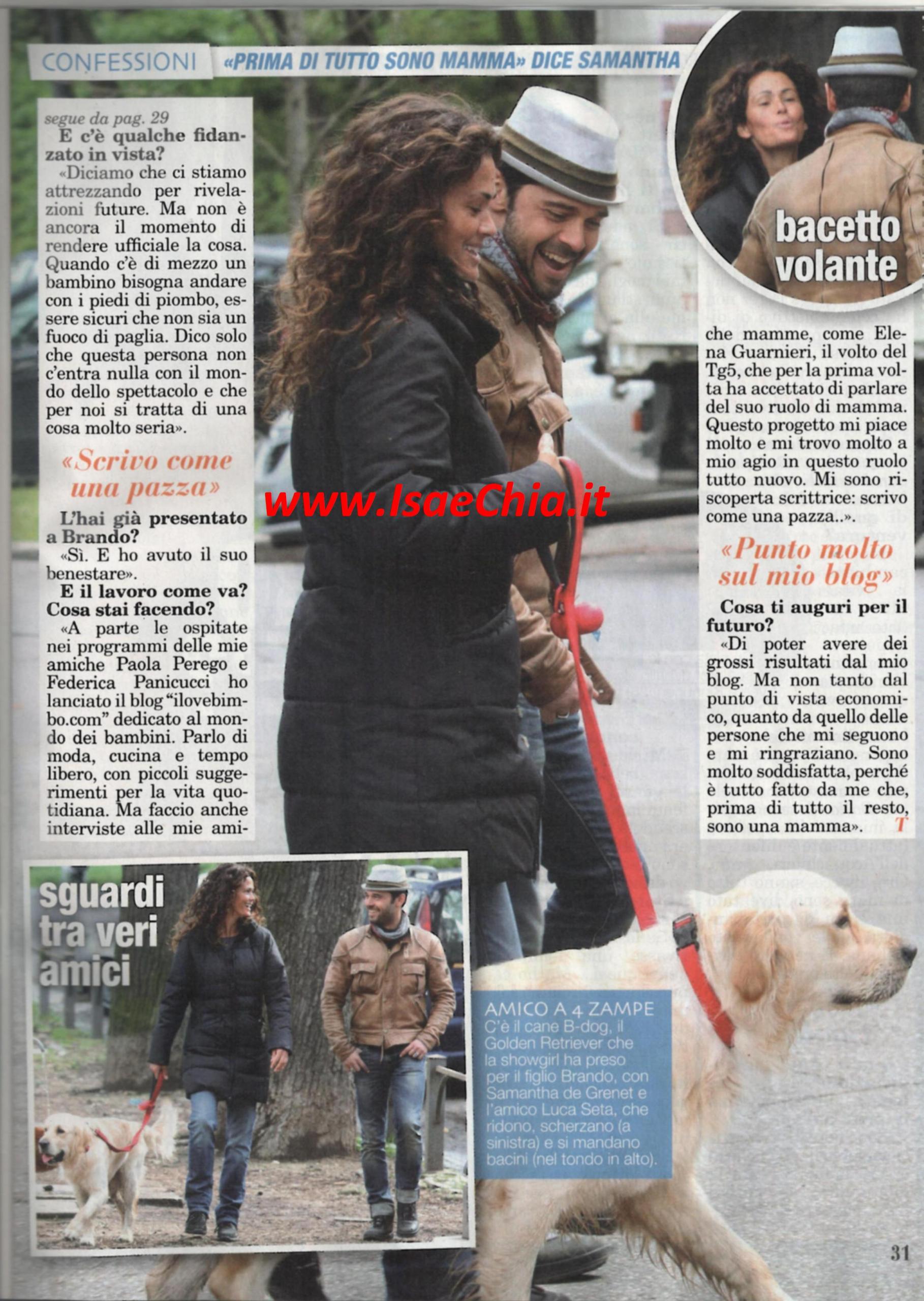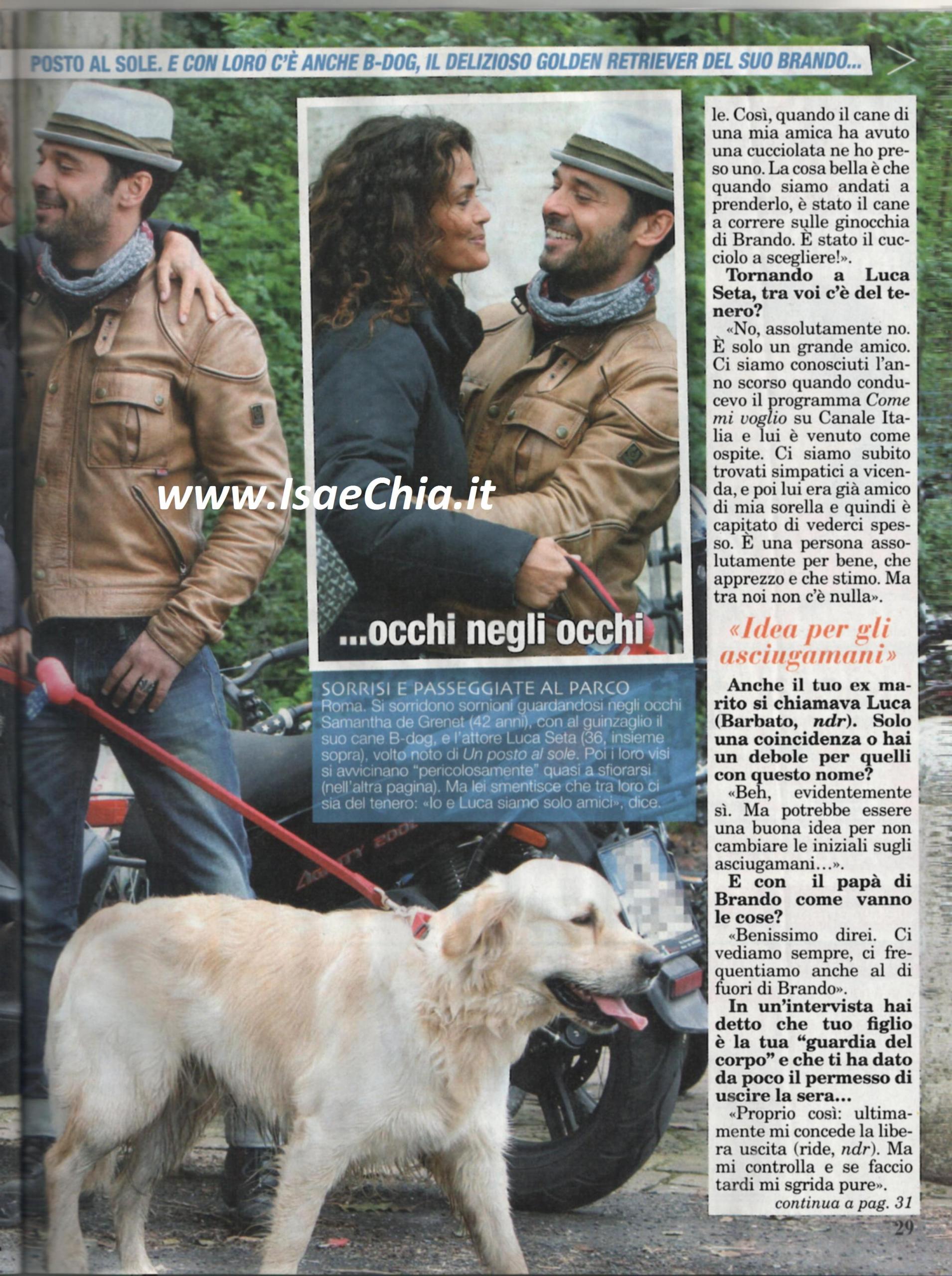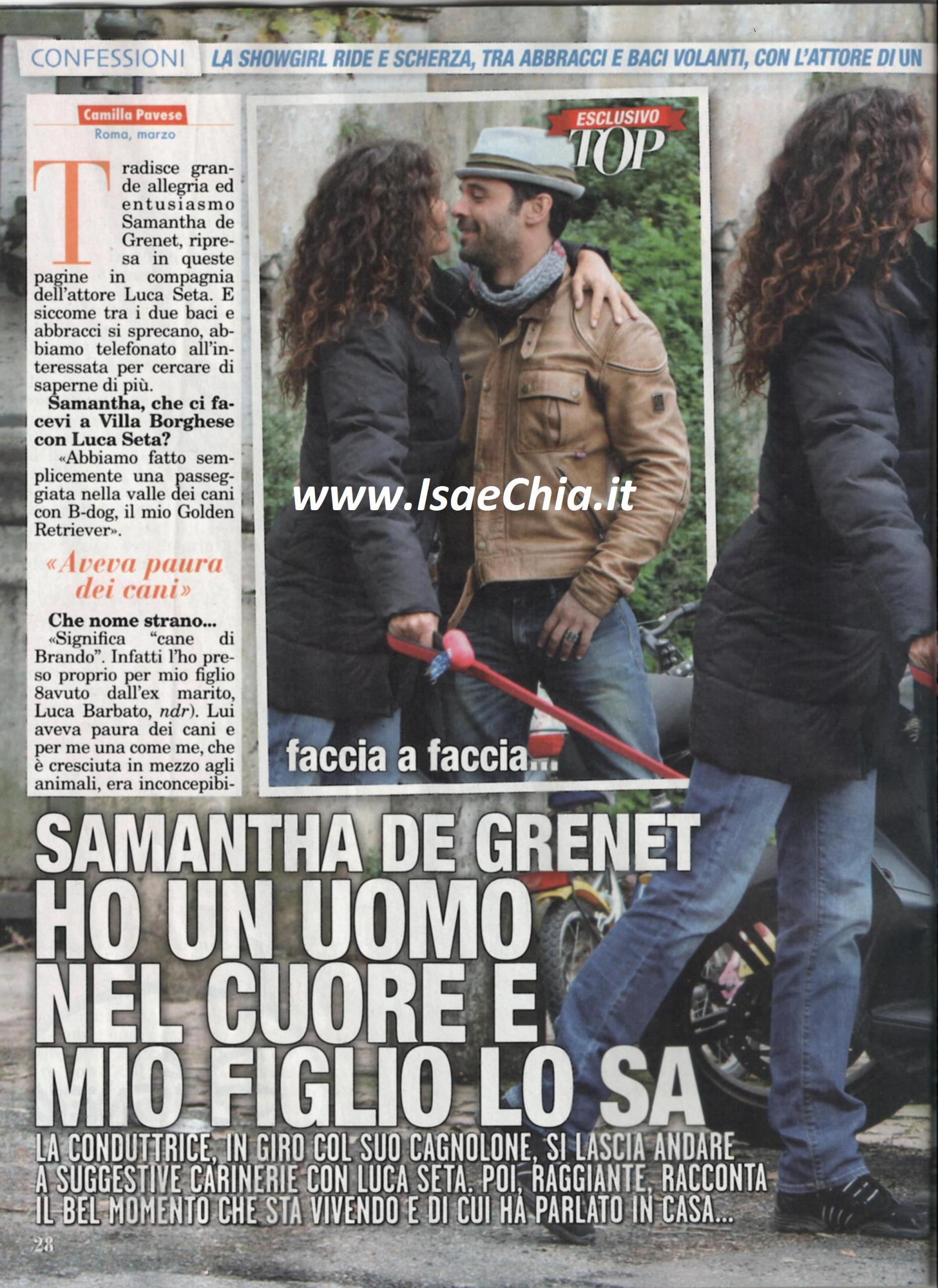 La showgirl Samantha De Grenet tradisce grande allegria in queste foto scattate a Villa Borghese, a Roma, con Luca Seta. Quando le si chiede di lui, risponde: “Abbiamo fatto semplicemente una passeggiata nella valle dei cani con B-Dog, il mio cane. Si chiama così perché significa “il cane di Brando“, ossia di mio figlio: lui aveva paura dei cani e per una come me che è cresciuta tra gli animali era inconcepibile, così ho preso un cucciolo da un’amica ed è stato lui a correre in braccio a Brando. Tra me e Luca Seta non c’è assolutamente niente, è un amico. Ci siamo conosciuti quando conducevo Come mi voglio su Canale Italia 1 e ci siamo trovati simpatici. Poi lui era già amico di mia sorella e quindi ci è capitato di vederci spesso. E’ una persona per bene, che apprezzo e stimo, ma non c’è niente”. Quando le si fa notare che si chiama come il suo ex marito Luca Barbato, risponde scherzando: “Bene, buona idea per non cambiare le iniziali sugli asciugamani. Con lui le cose vanno benissimo: ci vediamo anche al di fuori di Brando”. Poi, quando le si chiede se ora suo figlio approva che esca con qualcuno, risponde: “Ultimamente mi concede qualche libera uscita. Mi sto attrezzando per eventuali rivelazioni future, ma vado coi piedi di piombo. Non è il caso di fare presentazioni ufficiali, dico solo che c’è una persona che non fa parte del mondo dello spettacolo e per noi si tratta di una cosa molto seria. L’ho presentato a Brando ed ha avuto il suo benestare”.