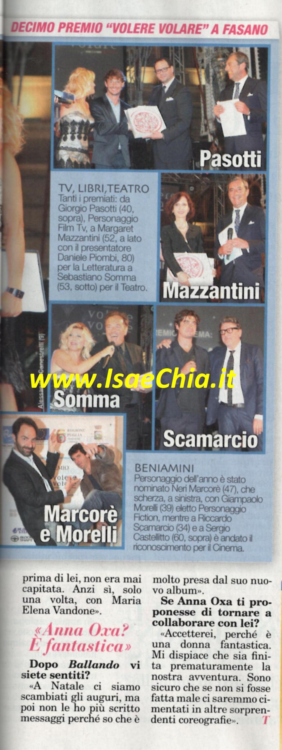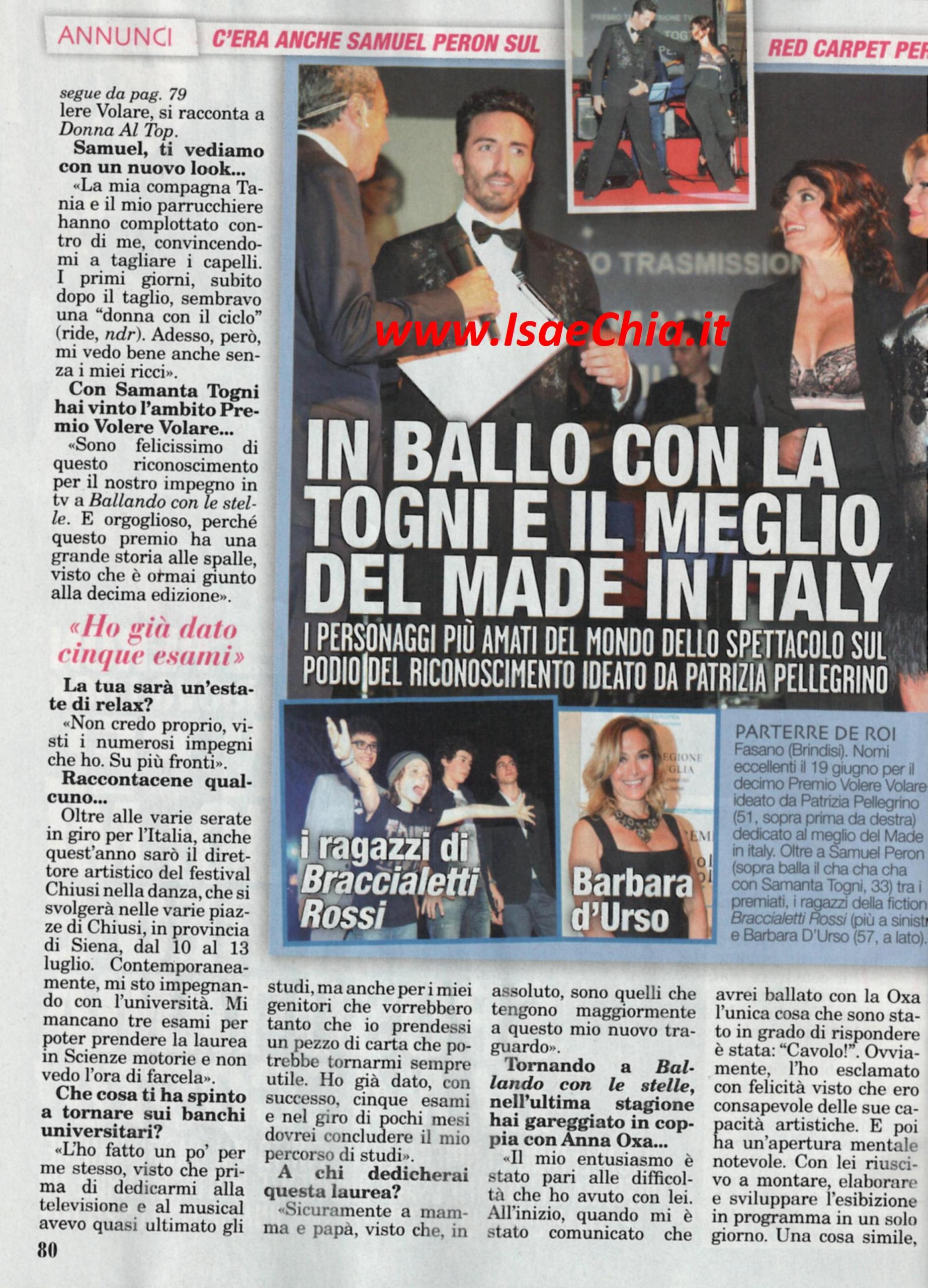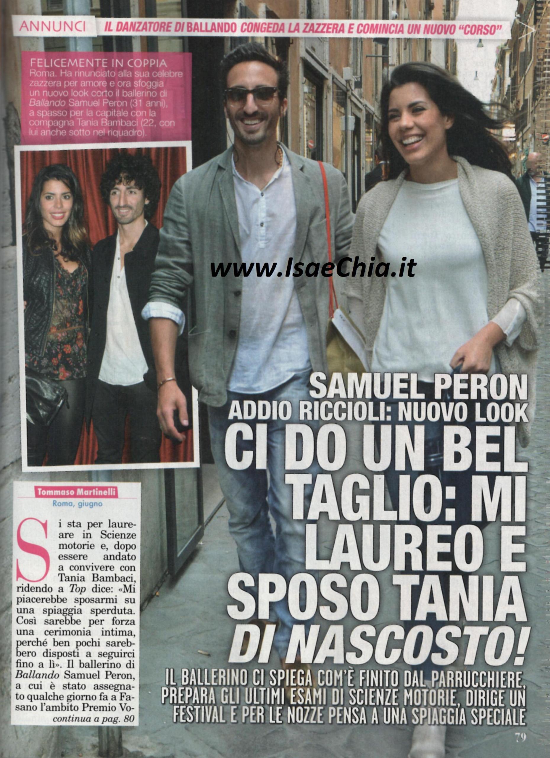 Il ballerino di Ballando con le stelle Samuel Peron ha sfoggiato un look tutto nuovo in occasione del ritiro del premio Volere volare a Fasano (BR). Intervistato, racconta: “E’ stato un complotto della mia compagna Tania Bambaci e del mio parrucchiere, che mi hanno convinto a tagliare i ricci. I primi giorni mi sentivo come una “donna con il ciclo”, ma adesso mi vedo bene anche senza i miei ricci. Sono contento e orgoglioso di esser stato insignito di questo premio insieme alla mia collega Samanta Togni perché ha una grande storia alle spalle ed è arrivato alla decima edizione. Quest’estate sarò direttore del festival Chiusi nella danza, a Chiusi (SI). Contemporaneamente, studierò per l’università: ho dato cinque esami in pochi mesi e me ne mancano tre per essere laureato in Scienze motorie. Sicuramente dedicherò la mia laurea ai miei, che sono quelli che ci tenevano di più a questo traguardo: è un pezzo di carta che può sempre servirmi!”. Samuel ha rivelato i suoi desideri per un futuro matrimonio con Tania, con la quale è andato a convivere: “Mi piacerebbe sposarmi su una spiaggia sperduta, così sarebbe una cerimonia intima: ben pochi sarebbero disposti a seguirci fin lì!” dichiara. E infine, nell’attesa della prossima edizione di Ballando, ricorda la sua ultima esperienza, in coppia con Anna Oxa: “Quando mi hanno detto che avrei ballato con lei, mi sono detto ‘Cavolo!’, perché ero consapevole delle sue capacità artistiche. Ha un’apertura mentale notevole, con lei riuscivo a montare e sviluppare l’esibizione in un solo giorno. A Natale ci siamo sentiti per gli auguri, ma poi non le ho scritto più perché so che è molto impegnata col nuovo album. Mi dispiace che la nostra avventura sia finita prematuramente e se mi proponesse di collaborare di nuovo, accetterei: è una donna fantastica”.