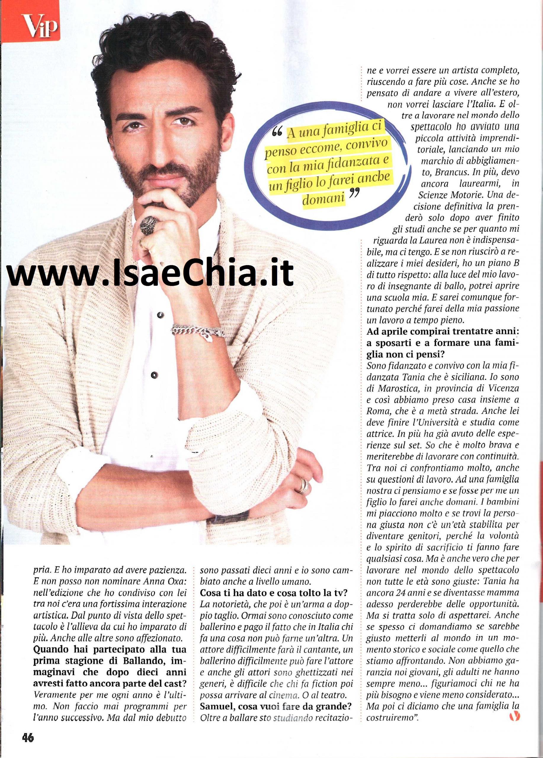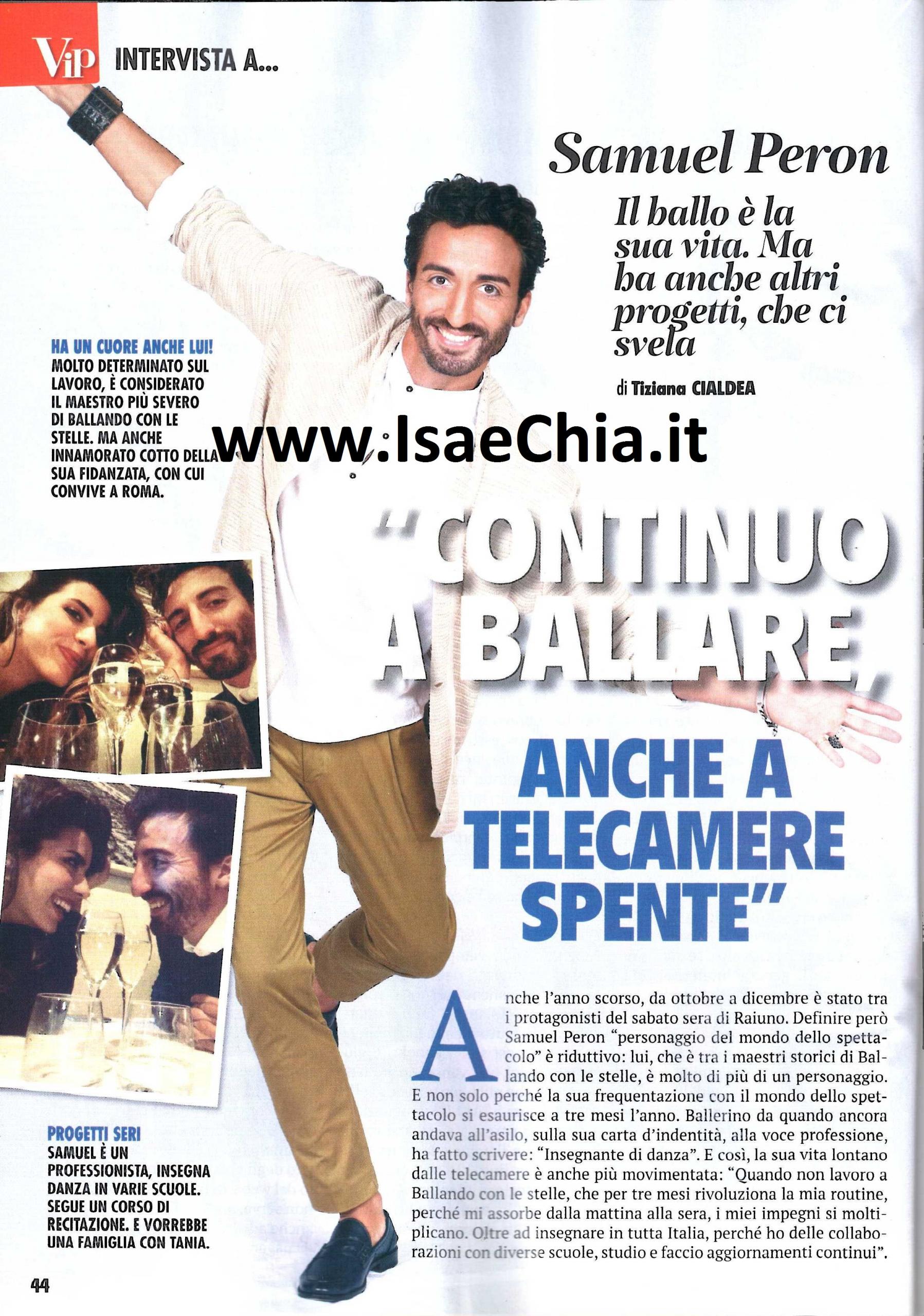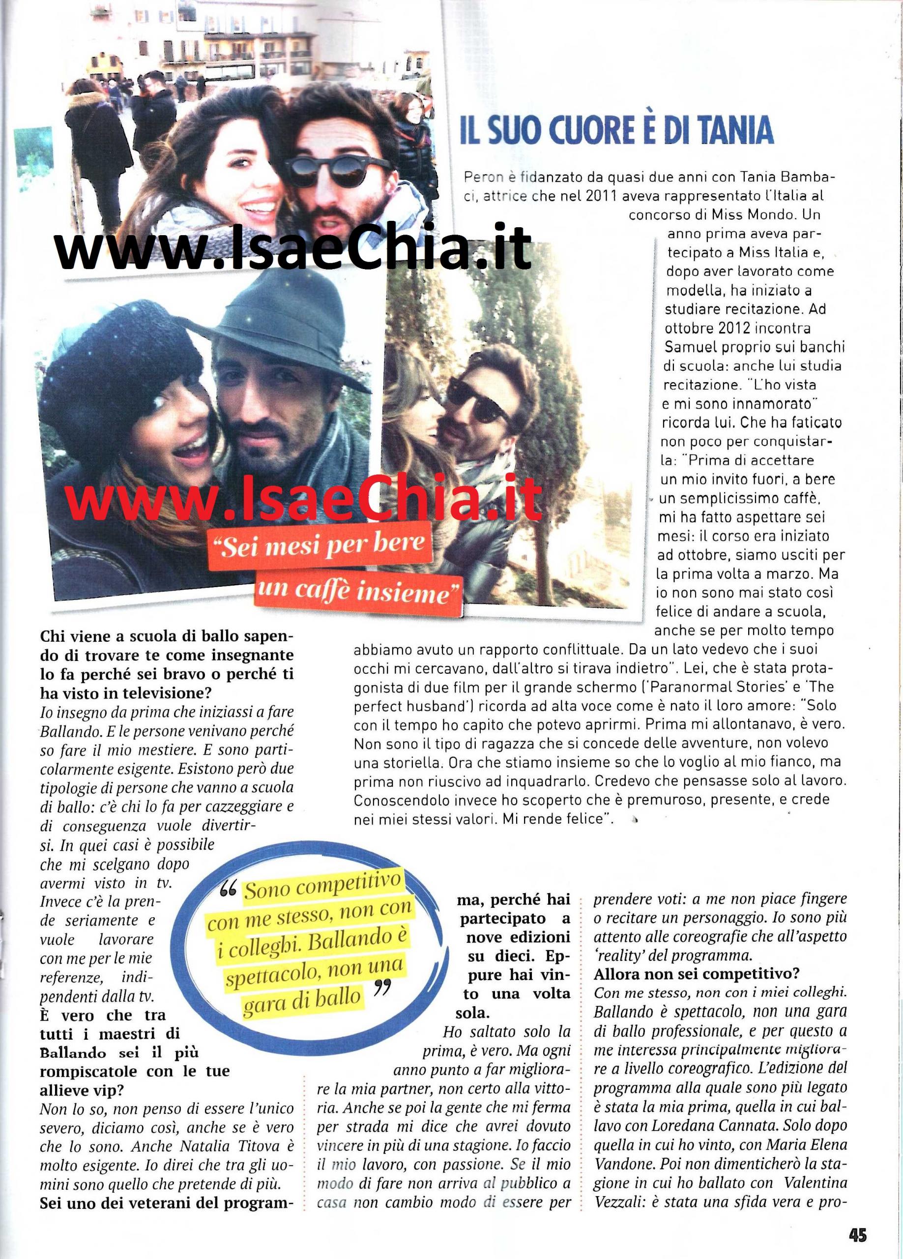 Da anni ormai Samuel Peron fa parte del cast di insegnanti di danza di Ballando con le stelle e fa spettacoli sin da bambino. Sulla sua carta d’identità, però, ha fatto scrivere “insegnante di danza”, perché quando non è impegnato nello show di Milly Carlucci, si dedica alla sua attività di insegnamento: “Quando non sono a Ballando, i miei impegni si moltiplicano: oltre ad insegnare in tutta Italia, perché ho collaborazioni in diverse scuole, studio e faccio aggiornamenti continui. Io insegno da prima che iniziassi Ballando e la gente veniva perché so fare il mio mestiere, e sono molto esigente! Esistono due tipi di persone: c’è chi lo fa per cazzeggiare e divertirsi e di conseguenza è possibile che mi scelgano dopo avermi visto in tv, e c’è chi la prende seriamente e vuole lavorare con me per le mie referenze. Non so se sono il più esigente nel cast di Ballando: anche Natalia Titova lo è molto. Forse sono il più esigente tra gli uomini!“. Proprio parlando del programma, quando gli si fa notare che in nove edizioni ha vinto solo una volta, risponde: “Ogni anno punto a far migliorare la mia partner, non alla vittoria, anche se poi la gente mi dice che avrei dovuto vincere più stagioni! Se il mio modo di fare non arriva a casa, io non cambio modo di essere per prendere più voti: non mi piace fingere o recitare un personaggio, do poca importanza all’aspetto ‘reality’. Ballando è uno spettacolo, non una gara professionale, mi interessa migliorare a livello coreografico. L’edizione a cui sono più legato è la prima, quella in cui ero in coppia con Loredana Cannata; poi quella in cui ho vinto, con Maria Elena Vangone. Non dimenticherò la stagione in cui ho ballato con Valentina Vezzali, una vera e propria sfida. Non posso non nominare Anna Oxa: tra di noi c’era una fortissima interazione artistica e dal punto di vista dello spettacolo è quella da cui ho imparato di più. Per me ogni anno è l’ultimo, non faccio mai programmi per l’anno successivo. Sono passati dieci anni e sono cambiato molto. La tv mi ha dato notorietà, ma è un’arma a doppio taglio: ormai sono conosciuto come ballerino e in Italia chi fa una cosa non ne può fare un’altra. Oltre a ballare, sto studiando recitazione e vorrei essere un artista completo, fare più cose. Ho pensato di andare all’estero, ma vorrei rimanere in Italia. Ho avviato una piccola attività imprenditoriale, con un mio marchio di abbigliamento. In più, devo ancora laurearmi in Scienze motorie: quando mi sarò laureato, potrò prendere una decisione definitiva“. Insomma, un futuro ancora da scrivere per il ballerino, che quando gli si chiede se, avendo raggiunti i 33 anni, pensa a metter su famiglia, risponde: “Convivo con la mia fidanzata Tania, che è siciliana. Io sono di Marostica, provincia di Vicenza, così abbiamo preso casa a metà strada, a Roma. Anche lei deve finire l’Università e studia come attrice: ha già fatto delle esperienze, è molto brava e meriterebbe di lavorare con continuità. Ad una famiglia nostra pensiamo e se fosse per me un bambino lo farei anche domani. Ma è anche vero che nel mondo dello spettacolo non tutte le età sono giuste: Tania ha 24 anni e se diventasse mamma adesso, perderebbe molte opportunità. Si tratta solo di aspettare! Spesso ci domandiamo se sia giusto mettere un figlio al mondo nel momento storico che stiamo affrontando: non abbiamo garanzie noi giovani, gli adulti sempre meno. Ma poi ci diciamo che una famiglia la costruiremo!“