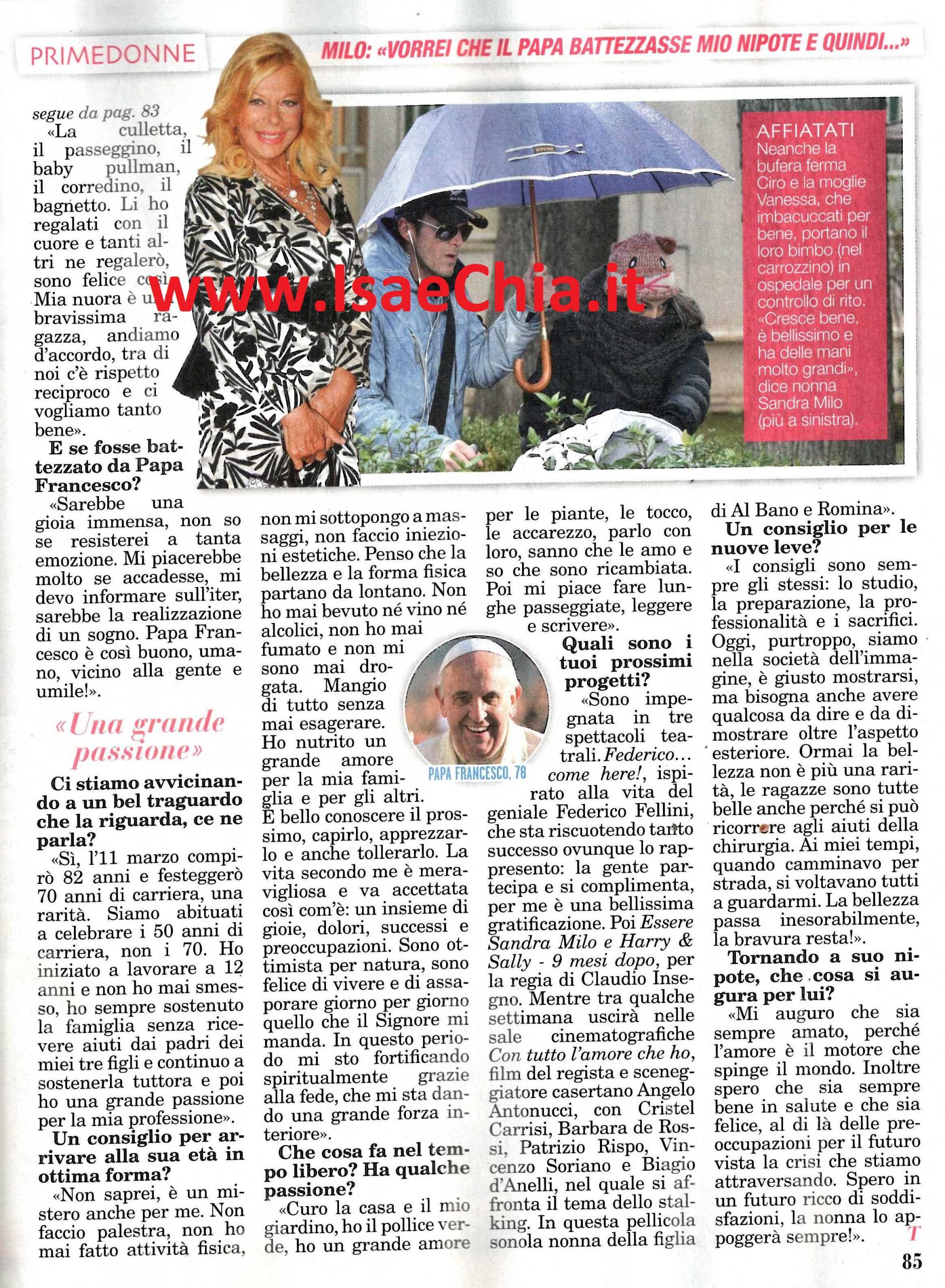 Oggi, 11 marzo, l’attrice Sandra Milo compie 82 anni, portati splendidamente. Il più bel regalo per il suo compleanno? L’ha ricevuto in anticipo da suo figlio ed è un bel nipotino! “E’ con piacere e orgoglio che vi presento mio nipote: si chiama Flavio Milo De Lollis: mio figlio Ciro e mia nuora Vanessa Ceccarini mi hanno fatto questo gradito omaggio a mia insaputa inserendo anche il mio cognome. Mi hanno detto che lo reputano un portafortuna e per me è stata un’ulteriore felicità. Flavio è nato il 29 gennaio a Villa San Pietro a Roma, il secondo ospedale in Italia per nascite dei bambini. Il parto, con cesareo, programmato, è andato bene; pesava 3 chili e 300 grammi e misurava 50 cm. Quando lo tengo in braccio mi sembra Ciro quando era piccolo, ma giorno dopo giorno cambia e per stabilire le somiglianze bisogna aspettare un po’. E’ stata una sensazione indescrivibile, un’incredibile gioia. Con la nascita di mio nipote ho avuto la certezza che la vita continua e che ‘la stirpe’ non morirà mai. Finalmente sono diventata nonna, era ora! Ormai non ci speravo più! Io sono molto legata alla mia famiglia e ai miei figli, sono una mamma chioccia. Per loro ho lottato, rischiato, sofferto, ma non mi sono mai pentita di niente. Adesso Ciro è diventato padre, è un uomo, è responsabile, aiuta Vanessa in tutto. Con Flavio sto rivivendo i momenti in cui i miei tre figli erano piccoli e mi sento rinata anch’io. E’ bellissimo“. Impossibile, infatti, dimenticare lo scherzo del 1990 che coinvolgeva suo figlio Ciro e fece urlare la Milo dallo spavento: “Quello scherzo di pessimo gusto è rimasto nella storia della televisione. Per me fu uno shock. Conducevo L’amore è una cosa meravigliosa quando è arrivata quella telefonata anonima in cui mi informavano che Ciro era ricoverato in condizioni gravi a causa di un brutto incidente. Lasciai lo studio in lacrime, mentre stavolta ho pianto per un evento bellissimo“. Quando le si chiede di dare un consiglio ai neo-genitori, l’ex naufraga de L’Isola dei famosi risponde: “Posso dare i classici consigli che può dare ogni mamma. Mi sono imposta di non essere invadente, di intervenire solo se interpellata: ho rispetto della loro privacy. Da qualche settimana hanno deciso di andare a vivere da soli e ho capito le loro ragioni. Vado spesso da loro e chiamo sempre Ciro per mantenermi aggiornata. Io ci sarò sempre, non devono preoccuparsi. Ho fatto tanti regali al bambino e tanti gliene farò. Mia nuora è una bravissima ragazza, c’è affetto e stima reciproca e ci vogliamo bene. Per me sarebbe una grandissima emozione se mio nipote fosse battezzato da Papa Francesco I: devo informarmi sull’iter, sarebbe la realizzazione di un sogno!“. Infine, quando le si chiede dei progetti futuri, racconta: “Con i miei 82 anni, festeggio anche i settant’anni di carriera: ho iniziato a lavorare a 12 anni. Sono impegnata in tre spettacoli teatrali: Federico, come here, ispirato a Federico Fellini, sta riscuotendo successo dappertutto. Poi Essere Sandra Milo e Harry e Sally – 9 mesi dopo. Presto uscirò nelle sale con Con tutto l’amore che ho, nel quale si affronta il tema dello stalking. Interpreto la nonna di Cristel Carrisi, figlia di Al Bano e Romina Power. I consigli che darei alle nuove leve sono sempre gli stessi: studio, preparazione, professionalità e sacrifici. E’ importante mostrarsi, ma oggi le ragazze sono tutte belle grazie alla chirurgia, quindi bisogna avere anche qualcosa da dire. Ai miei tempi, quando camminavo per strada, tutti si voltavano a guardarmi! La bellezza passa, la bravura resta! Il segreto della mia forma fisica? Non lo so neanch’io. Non ho mai fatto attività fisica, non mi sottopongo a massaggi, né a iniezioni estetiche. Non ho mai bevuto alcolici, mai fumato e non mi sono mai drogata. Mangio tutto senza esagerare. Ho nutrito un grande amore per la mia famiglia e per gli altri…E per le piante!“
