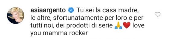 Sulla questione è intervenuta con un commento sotto il post della cantante l’attrice Asia Argento con queste parole: «Tu sei la casa madre, le altre, sfortunatamente per loro e per tutti noi, dei prodotti di serie. Love u mamma rocker!».