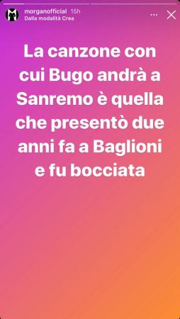 Morgan, che non ha ancora digerito la sua esclusione da questa nuova edizione in partenza martedì su Rai Uno e la presenza invece in gara di Bugo, ha approfittato ancora una volta dei social per lanciare una severa frecciatina al collega. La canzone con cui Bugo andrà a Sanremo è quella che presentò due anni fa a Claudio Baglioni e fu bocciata”, ha scritto in maniera lapidaria l’ex giudice di X-Factor nelle sue Instagram Stories.