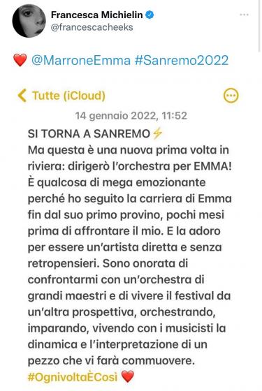 A dirigere l’orchestra per la cantante e giudice di X-Factor, che porterà a Sanremo il brano Ogni volta è così, sarà Francesca Michielin e ad annunciarlo è stata quest’ultima sui social: