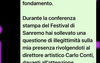 Nel corso della conferenza stampa di presentazione della prima serata della settantaseiesima edizione sel Festival di Sanremo un giornalista, nel commentare la defezione di Morgan nella serata dei duetti, ha rimarcato a Carlo Conti la denuncia per stalking da parte di una cantautrice che pochi mesi fa è stata risarcita di 100.000,00 euro.