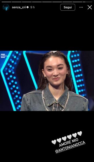 A proposito di Antonia, sui social non è mancato il tifo da parte dei suoi ex compagni di avventura e soprattutto di Senza Cri che ha postato una foto dell’esibizione della cantante, accompagnata dalla tenera dedica “Amore mio”, con diversi cuori bianchi.