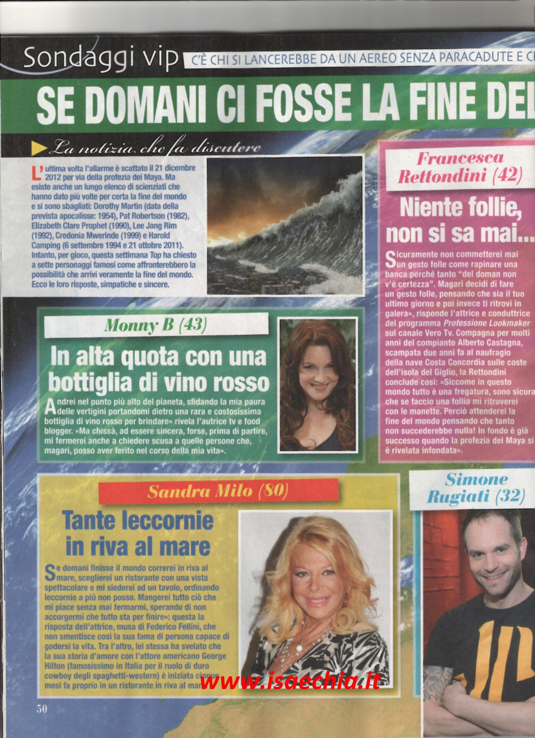 Barbara Chiappini dice: “Mi chiuderei in casa con mio marito e mia figlia, davanti al camino, coi telefoni spenti e poi aspetterei la fine con un bel bagno caldo tutti insieme”. Similmente, l’ex concorrente de La Fattoria Justine Mattera rivela: “Sono già stata così spericolata nella vita che sceglierei una giornata normale: mi precipiterei a scuola a prendere i miei figli e trascorrerei con la famiglia il mio ultimo tempo”.