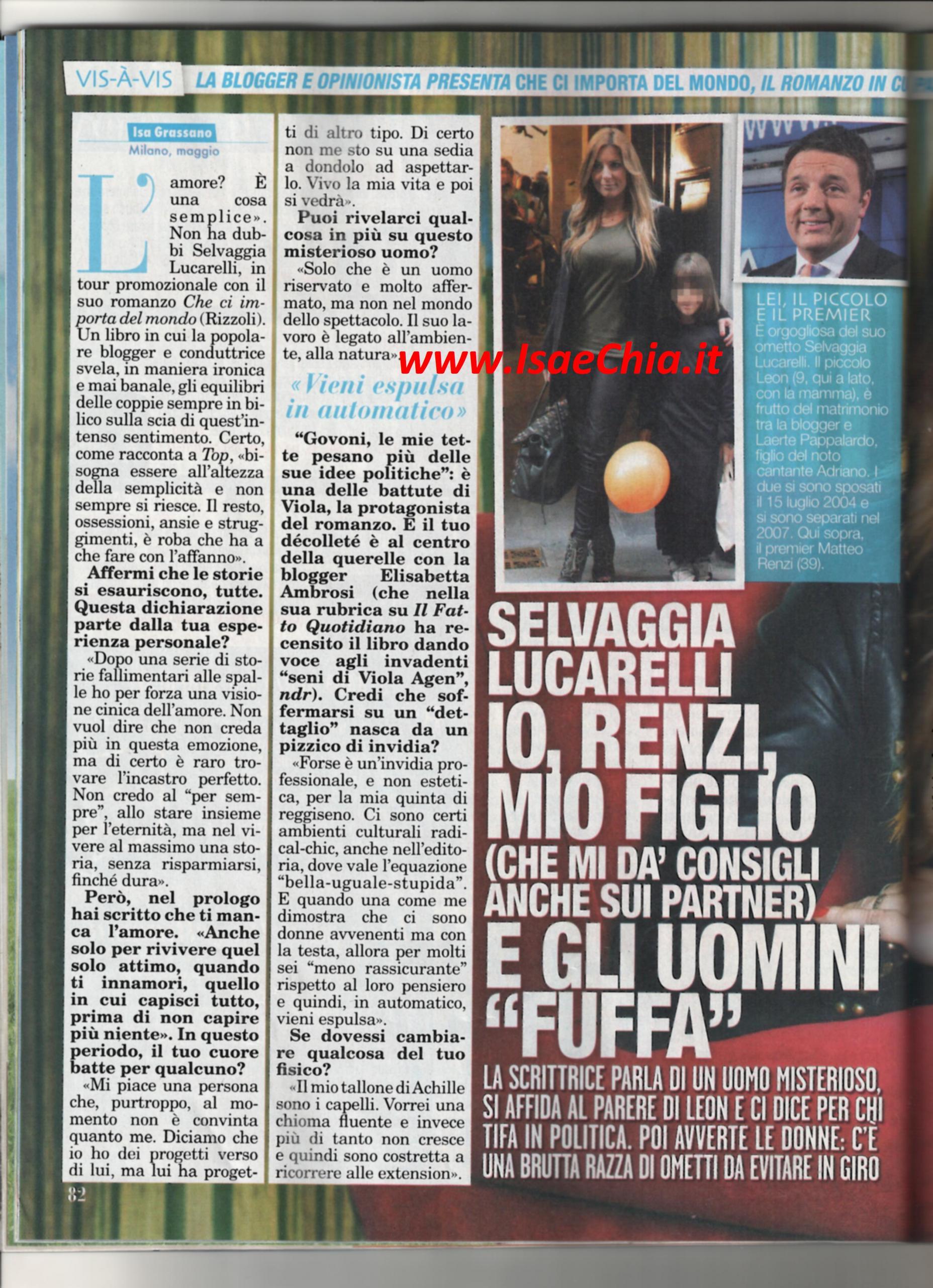 La blogger e conduttrice Selvaggia Lucarelli ha recentemente pubblicato un libro, Che ci importa del mondo e ha affermato che tutti gli amori sono destinati a finire: “Dopo una serie di storie fallimentari ho per forza una visione cinica dell’amore. Non vuol dire che non creda più in quest’emozione, ma certo è raro trovare l’incastro perfetto. Non credo ai “per sempre”, ma nel vivere una storia al massimo, finché dura. Ora mi piace una persona che, almeno al momento, non è convinta quanto me” rivela. “Io ho dei progetti verso di lui, ma lui ha progetti di altro tipo. Di certo non sto su una sedia a dondolo ad aspettarlo: vivo la mia vita e poi si vedrà. E’ molto riservato e molto affermato, ma non nello spettacolo: il suo mondo è l’ambiente, la natura”. Poi, parlando delle sue recenti provocazioni legate al suo seno da parte di una blogger e di una battuta legata al seno che fa il personaggio del suo libro, Selvaggia commenta: “Il fatto di avere una quinta taglia e di essere avvenente è poco rassicurante rispetto al pensiero di tanti e quindi, vieni espulsa. Fisicamente, il mio tallone d’Achille sono i capelli: vorrei crescessero di più, ma devo usare le extension”. Facendo un paragone tra suo figlio Leon e quello descritto nel libro, invece, spiega: “Mio figlio per fortuna non è bigotto e sa chi è suo padre, Laerte Pappalardo. In più ha grande diplomazia, dote presa né da me né dalla famiglia Pappalardo. Pur avendo 9 anni, mi dà consigli, anche sugli uomini. Di recente, conoscendo un mio amico-aspirante, ha detto ‘Non è cosa’ e aveva ragione!”