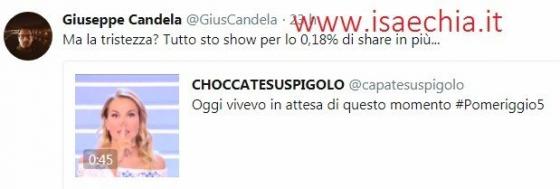 Inoltre, anche ieri in apertura di Pomeriggio 5, Barbara ha espresso la sua felicità per questa supremazia sulla concorrenza. Ma a storcere il naso per le parole entusiaste della D’Urso è stato Giuseppe Candela, il giornalista di Dagospia, che su Twitter ha scritto:
