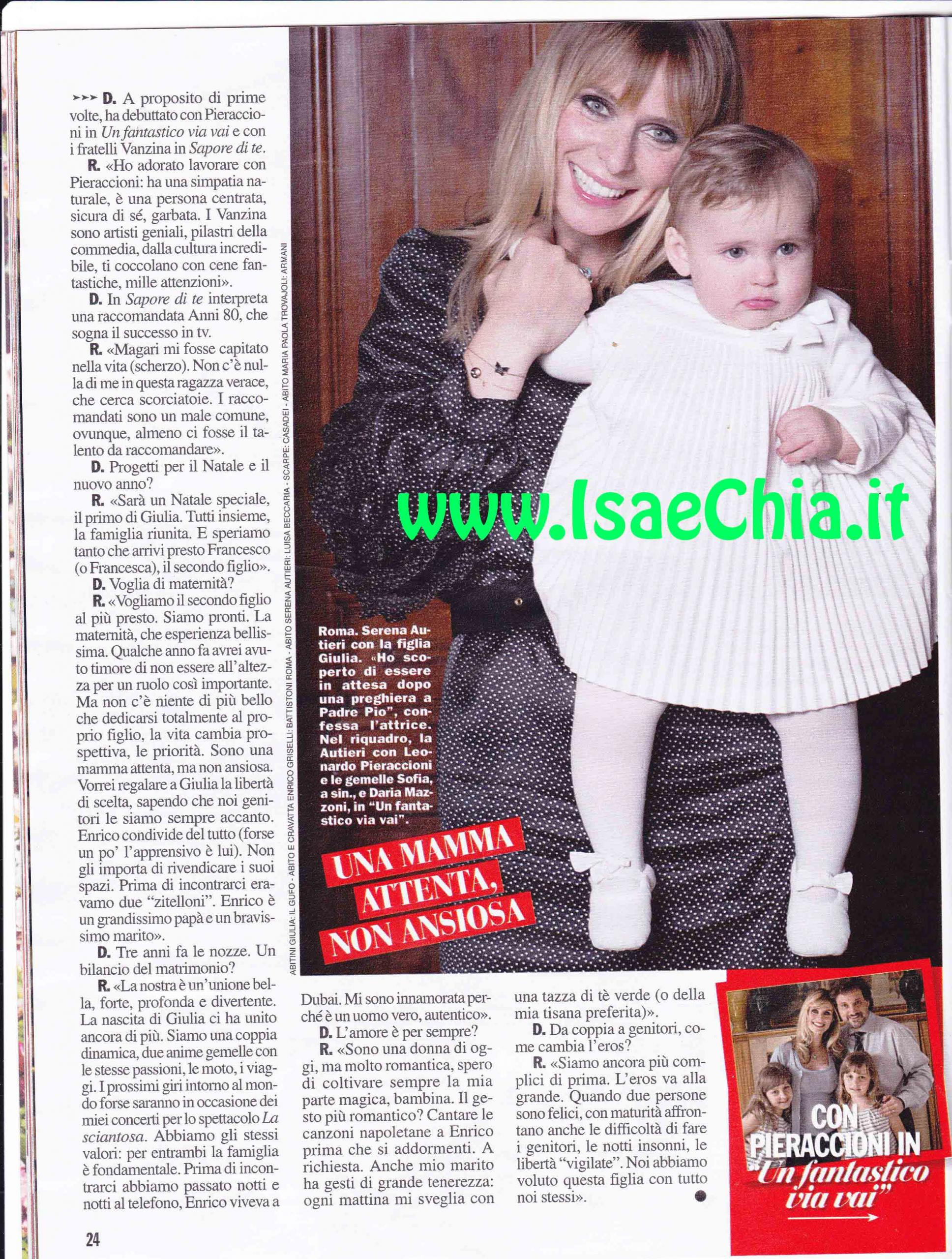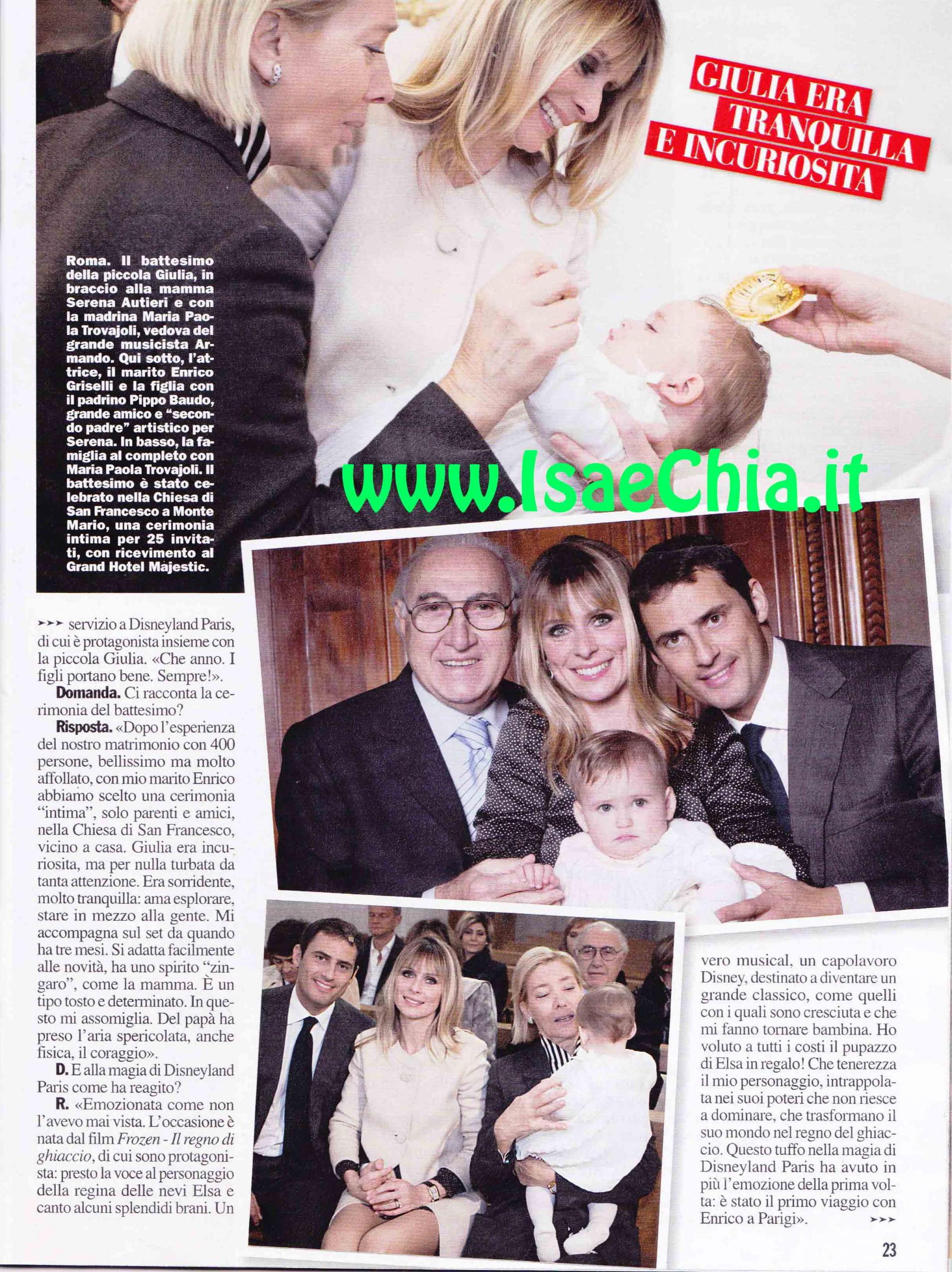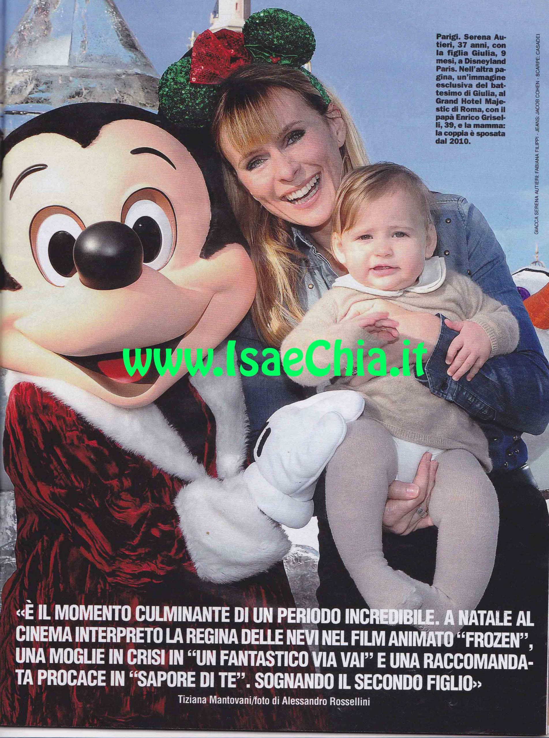 Con il recente ritorno a Tale e quale show e la maternità, il 2013 è stato sicuramente un anno fantastico per Serena Autieri, ma non è ancora finito qui: “Mi preparo al Natale con tre film in uscita. E sognando il secondo figlio: non vedo l’ora di diventare di nuovo mamma” esordisce lei. Chi mostra le foto del battesimo della piccola Giulia e di un viaggio fatto col marito Enrico Griselli a Disneyland Paris. “Dopo l’esperienza del matrimonio affollato con 400 persone, io e Enrico abbiamo scelto una cerimonia intima per il battesimo. Giulia ama stare in mezzo alla gente e mi accompagna sul set da quando aveva tre mesi. Ha uno spirito “zingaro” come la mamma, mentre dal padre ha preso quello spericolato e il coraggio. A Disneyland era emozionata come non l’ho mai vista. L’occasione è nata dal film Frozen – il regno di ghiaccio, in cui ho prestato la voce al personaggio della regina delle nevi Elsa e canto alcuni brani. Un vero musical, destinato a diventare un classico Disney. Ed è stato il primo viaggio a Parigi con Enrico. Ho adorato lavorare con Leonardo Pieraccioni in Un fantastico via vai, ha una simpatia naturale ed è una persona garbata. Coi fratelli Vanzina, pilastri della commedia, recito in Sapore di te: interpreto una raccomandata anni ’80. Magari fosse successo anche a me! Non c’è nulla di me in lei, i raccomandati sono un male comune”. Infine racconta: “Io e Enrico vogliamo il secondo figlio al più presto. La maternità, che esperienza bellissima. Qualche anno fa avrei avuto timore di non esserne all’altezza, ma non c’è niente di più bello di dedicarsi completamente al proprio figlio, la vita cambia prospettiva e priorità. La nostra è un’unione bella forte e Giulia ci ha unito ancora di più. Abbiamo le stesse passioni e gli stessi valori. Il gesto più romantico? Cantargli le canzoni in napoletano. Lui, invece, mi sveglia ogni mattina col té o la tisana. L’eros va alla grande, siamo più complici di prima. Quando due persone sono felici, con maturità affrontano anche le difficoltà di fare i genitori”.