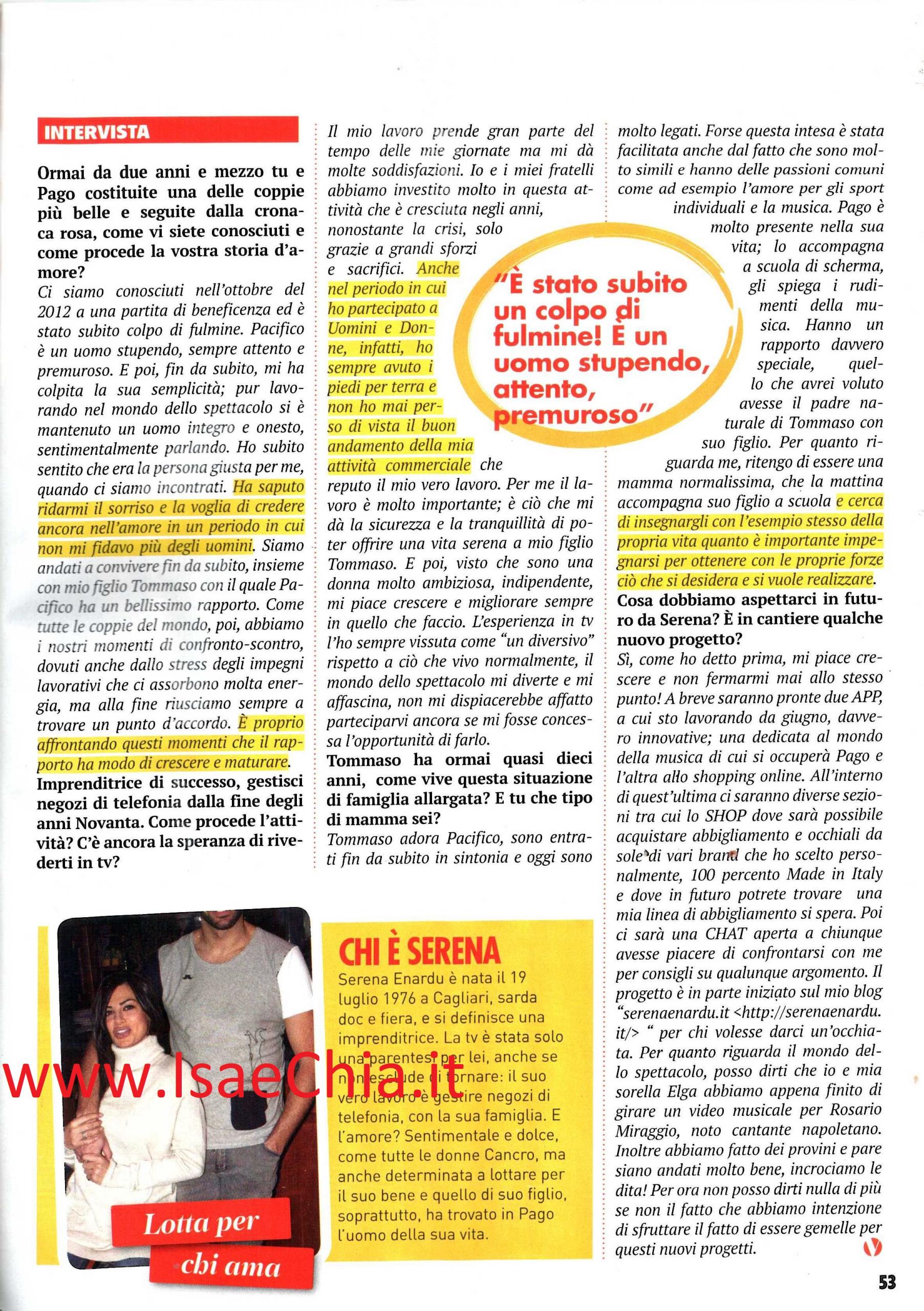 E’ passato un bel po’ di tempo da quando Serena Enardu sedette sul trono di Uomini e Donne, rimanendo negli anni comunque una delle troniste più amate di tutta la storia del programma. Da qualche tempo, inoltre, la bella imprenditrice sarda ha trovato l’amore con il cantante Pago. Incontrata durante una vacanza a Canazei, Serena racconta: “Io e Pago ci siamo conosciuti nell’ottobre 2012 ad una partita di beneficenza ed è stato un colpo di fulmine. Pacifico (questo è il suo vero nome) è un uomo stupendo, sempre attento e premuroso. Fin da subito mi ha colpito per la sua semplicità: pur lavorando nel mondo dello spettacolo si è mantenuto un uomo integro e onesto dal punto di vista sentimentale. Ho subito capito che era l’uomo giusto per me quando ci siamo incontrati. Ha saputo ridarmi il sorriso e la voglia di credere anche nell’amore in un periodo in cui non mi fidavo più degli uomini. Siamo andati a convivere fin da subito insieme a mio figlio Tommaso, con il quale Pacifico ha un bellissimo rapporto. Come tutte le coppie, abbiamo i nostri momenti di confronto-scontro, dovuti anche allo stress della vita lavorativa di tutti i giorni. Ma riusciamo sempre a trovare un punto d’accordo ed è proprio affrontando questi momenti che il rapporto ha modo di crescere e maturare”. Quando le si chiede se c’è ancora speranza di vederla in tv o continuerà a fare solo l’imprenditrice, risponde: “Il mio lavoro prende gran parte delle mie giornate e mi dà molte soddisfazioni. Io e i miei fratelli abbiamo investito in quest’attività che negli anni è cresciuta grazie a sforzi e sacrifici. Anche nel periodo in cui ero a Uomini e Donne non ho mai perso di vista l’andamento della mia attività commerciale. Per me il lavoro è molto importante, mi dà la sicurezza di poter offrire una vita tranquilla a mio figlio Tommaso. L’esperienza in tv l’ho sempre vista come un diversivo rispetto a ciò che vivo normalmente. Il mondo dello spettacolo mi diverte e mi affascina e non mi dispiacerebbe parteciparvi ancora, se mi fosse concessa l’opportunità di farlo. A breve saranno pronte due app a cui sto lavorando da giugno, davvero innovative, una dedicata al mondo della musica, gestita da Pago, e una allo shopping online. All’interno di quest’ultima ci saranno diverse sezioni, tra cui Shop, dove sarà possibile comprare abbigliamento e occhiali da sole di vari brand scelti da me, 100% Made in Italy e dove spero che in futuro potrete trovare una mia linea di abbigliamento. Poi ci sarà una chat aperta a chiunque volesse confrontarsi con me su qualsiasi argomento. Il progetto in parte è partito sul mio blog www.serenaenardu.it. Nello spettacolo, io e mia sorella Elga abbiamo appena girato un video musicale per il cantante napoletano Rosario Miraggio. Inoltre abbiamo fatto alcuni provini e sembra siano andati molto bene. Per ora non possiamo dire molto, se non che abbiamo intenzione di sfruttare il fatto di essere gemelle per questi nuovi progetti“. Infine, parlando della sua ‘famiglia allargata’ e del suo ruolo di mamma, Serena racconta: “Tommaso adora Pacifico e oggi sono molto legati. Forse questa intesa è dovuta al fatto che sono molto simili e hanno in comune l’amore per lo sport e per la musica. Pago è molto presente nella sua vita, lo accompagna a scuola di scherma, gli insegna i rudimenti della musica. Hanno un rapporto speciale, quello che avrei voluto avesse il padre naturale di Tommaso con suo figlio. Per quanto riguarda me, sono una mamma normalissima, che la mattina accompagna il figlio a scuola e cerca di insegnargli con l’esempio stesso della propria vita quanto è importante impegnarsi per ottenere con le proprie forze ciò che si vuole realizzare“.