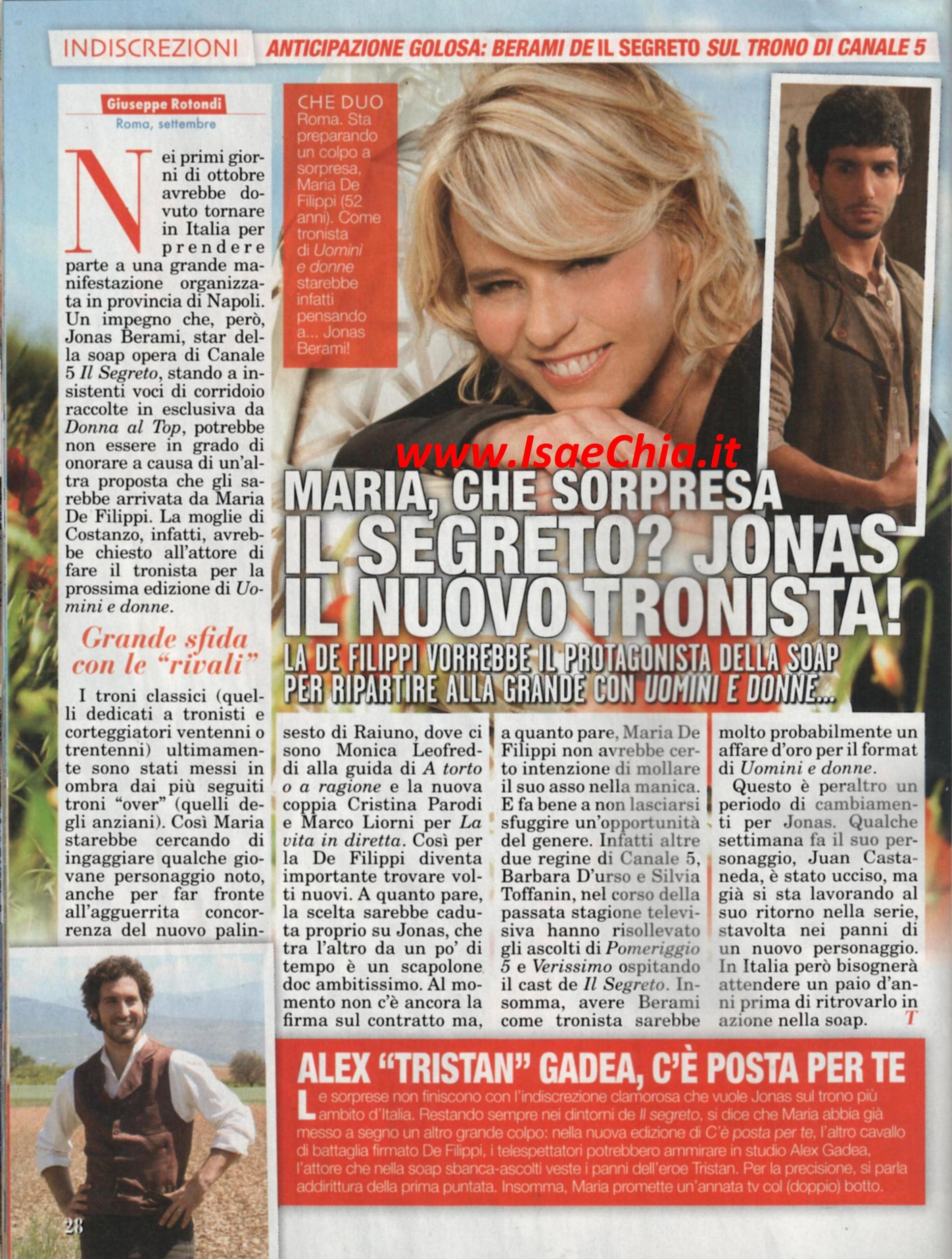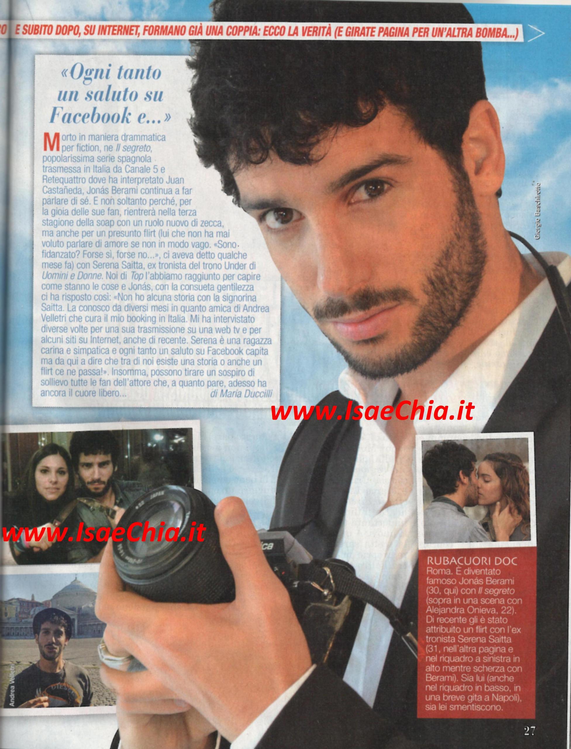 Serena Saitta è stata tra le protagoniste di Ragazzi e ragazze, ma ultimamente ha fatto parlare di sé per le sue rivelazioni sull’attore Marco Bocci, con il quale ha avuto una storia (QUI e QUI le sue interviste). Adesso, però, torna a far parlare di sé perché è stata vista con Jonas Berami, l’attore spagnolo famoso per Il segreto e neo-tronista di Uomini e donne. In effetti, anche noi di IsaeChia.it avevamo pubblicato un’intervista a Jonas in cui Serena aveva fatto da interprete (clicca QUI per rivedere il post). Infatti lei specifica: “Non era certo la prima volta che lo vedevo, visto che lo conosco ormai da nove mesi, anzi un annetto. Penso che il segreto del suo successo stia in Juan, il personaggio che interpreta, perché di Jonas si sa pochissimo: è molto riservato e non gli piace il gossip. Di lui mi hanno colpito determinazione e umiltà: nonostante il successo, è rimasto coi piedi per terra e proviene da una famiglia di pescatori. Non mi sono chiesta se qualcosa di me lo ha colpito, perché da un po’ sto frequentando un attore che uscirà ad ottobre con un film molto importante. Per il momento vorrei mantenere la sua identità misteriosa, ma quando uscirà la pellicola, lui stesso ufficializzerà la cosa e sarete i primi a saperlo. Stavolta, contrariamente al passato, la mia dolce metà è intenzionata a rendere pubblica la nostra relazione. Quindi tra me e Jonas non c’è stato nessun flirt. A livello estetico potrebbe piacermi, visto che mi ricorda un mio ex dell’adolescenza, e poi ha anche qualcosa di Marco Bocci!” scherza lei. E infatti lui aveva smentito la loro storia: “Mi ha intervistato per una trasmissione, è carina e simpatica e ogni tanto un saluto su Facebook ci capita ma da qui a dire che c’è una storia, ce ne passa!”. Infine, Serena parla dei suoi progetti: “Un giorno, davanti all’ennesimo femminicidio al telegiornale, mi sono detta ‘adesso basta’ e ho deciso di prendere parte gratuitamente a eventi per sensibilizzare sul fenomeno. Jonas ha accettato di farlo con me, facendo una foto con due cartelli, con su scritto Stop e Femminicidio. Lui ama le donne e ha rivolto un appello alle vittime di violenza perché non devono subire in silenzio, ma denunciare”.
