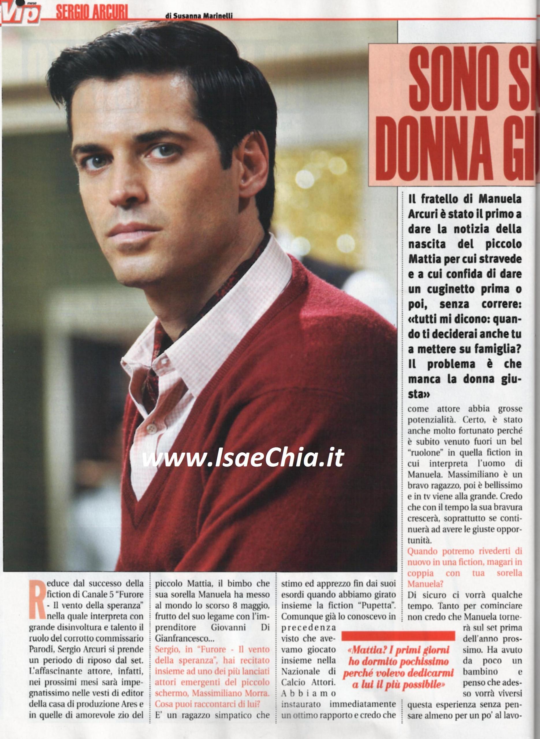 L’attore Sergio Arcuri è reduce dalla partecipazione alla fiction Furore – il vento della speranza, dove ha lavorato a contatto con Massimiliano Morra: “E’ un ragazzo simpatico che stimo e apprezzo, sin da quando abbiamo girato insieme Pupetta. Lo conoscevo già da prima perché abbiamo giocato insieme nella Nazionale di Calcio Attori e credo che abbia grandi potenzialità. E’ stato fortunato perché è subito venuto fuori un bel ‘ruolone’ per lui, perché interpretava l’uomo di mia sorella Manuela Arcuri. E’ un bellissimo ragazzo e in tv viene alla grande”. Quando gli si chiede invece quand’è che lui apparirà di nuovo in tv con sua sorella, risponde: “Ci vorrà qualche tempo. Manuela non tornerà sul set prima dell’anno prossimo: ha avuto da poco un bambino e vuole viversi al massimo quest’esperienza. Non ha un senso fare un figlio per poi non stare con lui nemmeno un po’. Inoltre Manuela è una che si dedica anima e corpo ai suoi impegni di lavoro e non potrebbe prendersi un impegno così grande. Per quanto riguarda me, al momento sto a vedere quali proposte arriveranno. Mi sono appassionato al mio lavoro di editor, che mi dà modo di sfruttare la mia laurea e le mie competenze”. Infine, racconta: “Diventare zio di Mattia mi ha reso incredibilmente felice, i primi giorni ho dormito pochissimo perché volevo dedicarmi a lui il più possibile e ho rinunciato ai miei week-end in giro. Io sono ancora single e da quando mia sorella ha avuto un figlio tutti mi chiedono quando metterò su famiglia anch’io! Il problema è che manca la donna giusta. Ho poco tempo per cercarla e certe situazioni non vengono a bussare alla tua porta. O meglio, qualcuna viene a bussarti, ma non sono le donne che prenderei in considerazione! Io però non vado di fretta e quando la troverò, penserò a regalare un cuginetto a Mattia”.