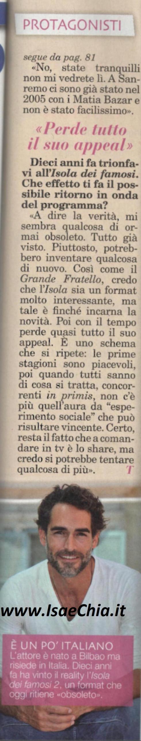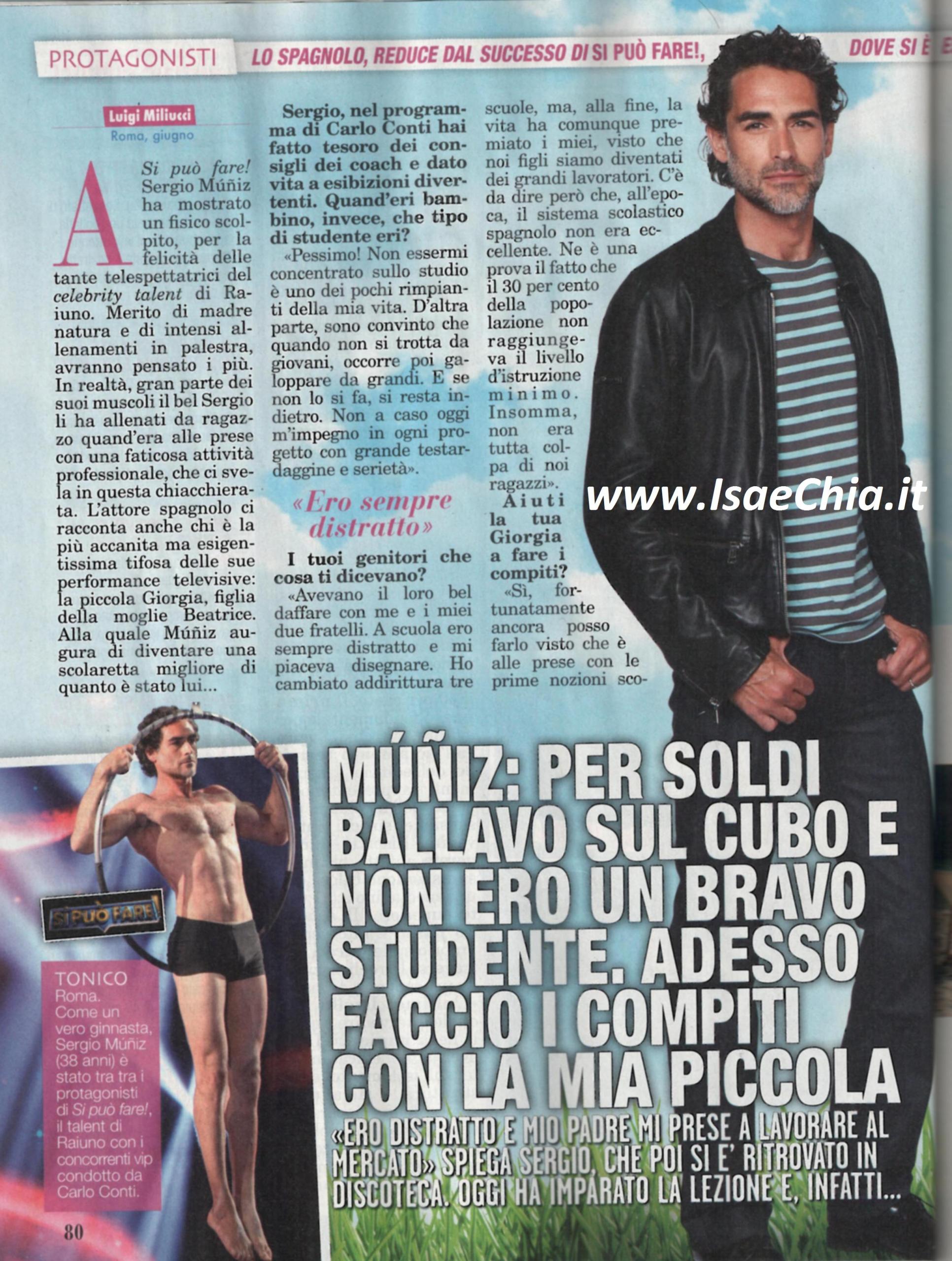Già vincitore dell’Isola dei famosi, Sergio Muniz è tornato in tv con Si può fare, dove anche se non ha ottenuto la vittoria, ha fatto una bellissima figura col suo fisico scolpito nelle sue performance atletiche. Ma se lì ha fatto tesoro dei consigli dei coach, per lui non è sempre stata così: “Da piccolo ero uno studente pessimo! Non essermi concentrato sui libri rimane uno dei rimpianti della mia vita. Ma sono convinto che se non si trotta da giovani, bisogna galoppare da grandi e oggi mi do ad ogni mio progetto con grande testardaggine e serietà. Ho cambiato scuola tre volte, ma c’è da dire che il sistema scolastico spagnolo allora non era eccellente e ne è la prova il fatto che il 30% della popolazione raggiunge il livello d’istruzione minimo. Ora che mia figlia Giorgia è alle prese con le prime nozioni, posso ancora aiutarla con i compiti, ma man mano che crescerà saranno al di là delle mie possibilità! A 16 anni aiutavo mio padre al mercato della frutta: i muscoli me li sono fatti lì, mica in palestra! Ho cominciato a lavoricchiare nella moda a vent’anni, ma i guadagni non erano molti, così ho cominciato anche a ballare sul cubo. E pensare che ho un animo da rockettaro e non amo le discoteche! Ora faccio un mestiere più difficile: il papà. Il mio lavoro mi porta ad essere spesso lontano da casa, ma per la mia bimba cerco di essere presente il più possibile. Giorgia mi ha seguito in tv, e si è anche arrabbiata per le puntate in cui non ho vinto! Io le ho spiegato che non è importante vincere, ma impegnarsi per fare bella figura. Chissà se l’ho convinta!”. E quando si parla di possibili ritorni futuri in tv, commenta: “Al festival di Sanremo c’è Carlo Conti, ma non credo che mi potrete vedere lì a rispolverare la mia passione per la musica. Un ritorno all’Isola? In realtà mi sembra qualcosa di obsoleto, come il Grande fratello: è bello per le prime edizioni, poi è sempre lo stesso schema che si ripete. Certo, a comandare è lo share, ma credo che si potrebbe tentare qualcosa di più!”