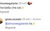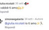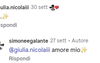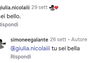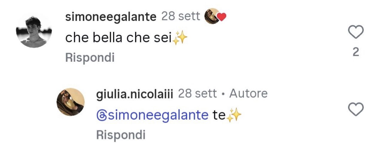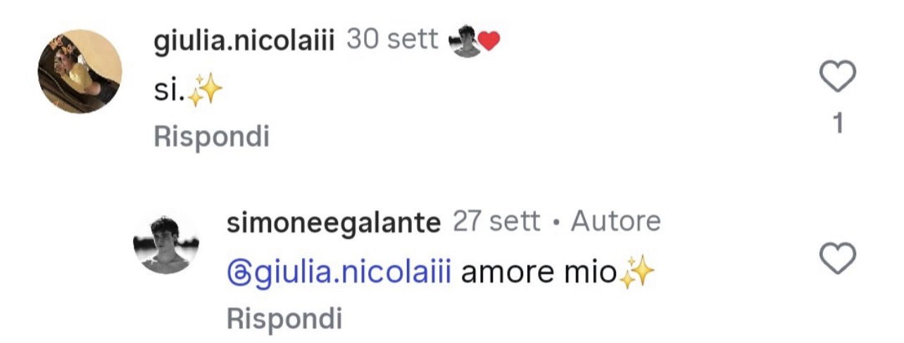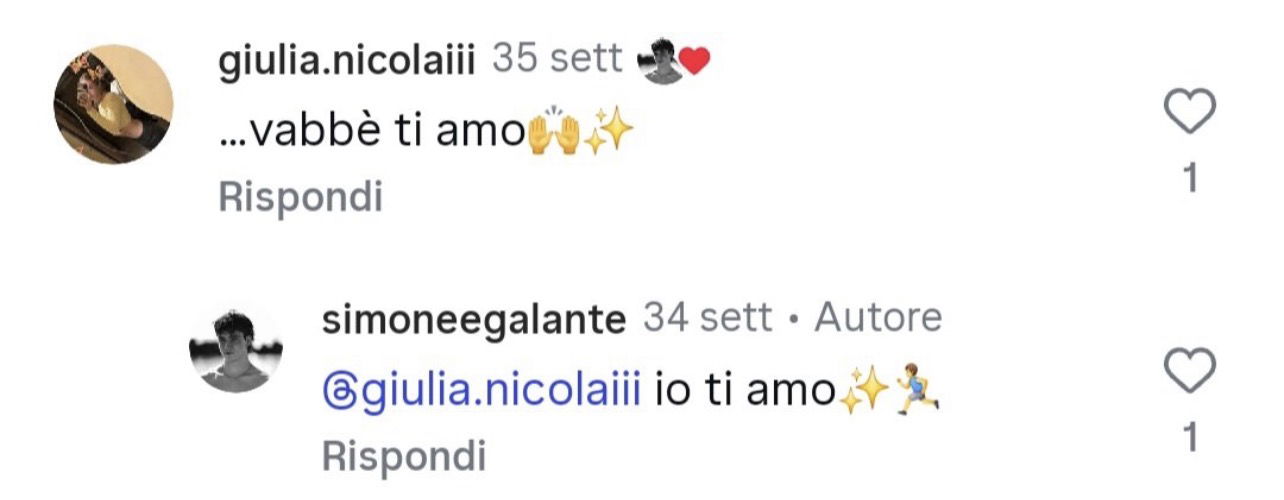 In uno dei commenti in questione, Simone ha scritto a Giulia “Che bella che sei” e lei ha risposto “te”. In un altro è stata la Nicolai a scrivere al ballerino “sei bello” e lui ha replicato “tu sei bella”, mentre in un altro ancora lui ha scritto “amore mio” in risposta alla danzatrice.