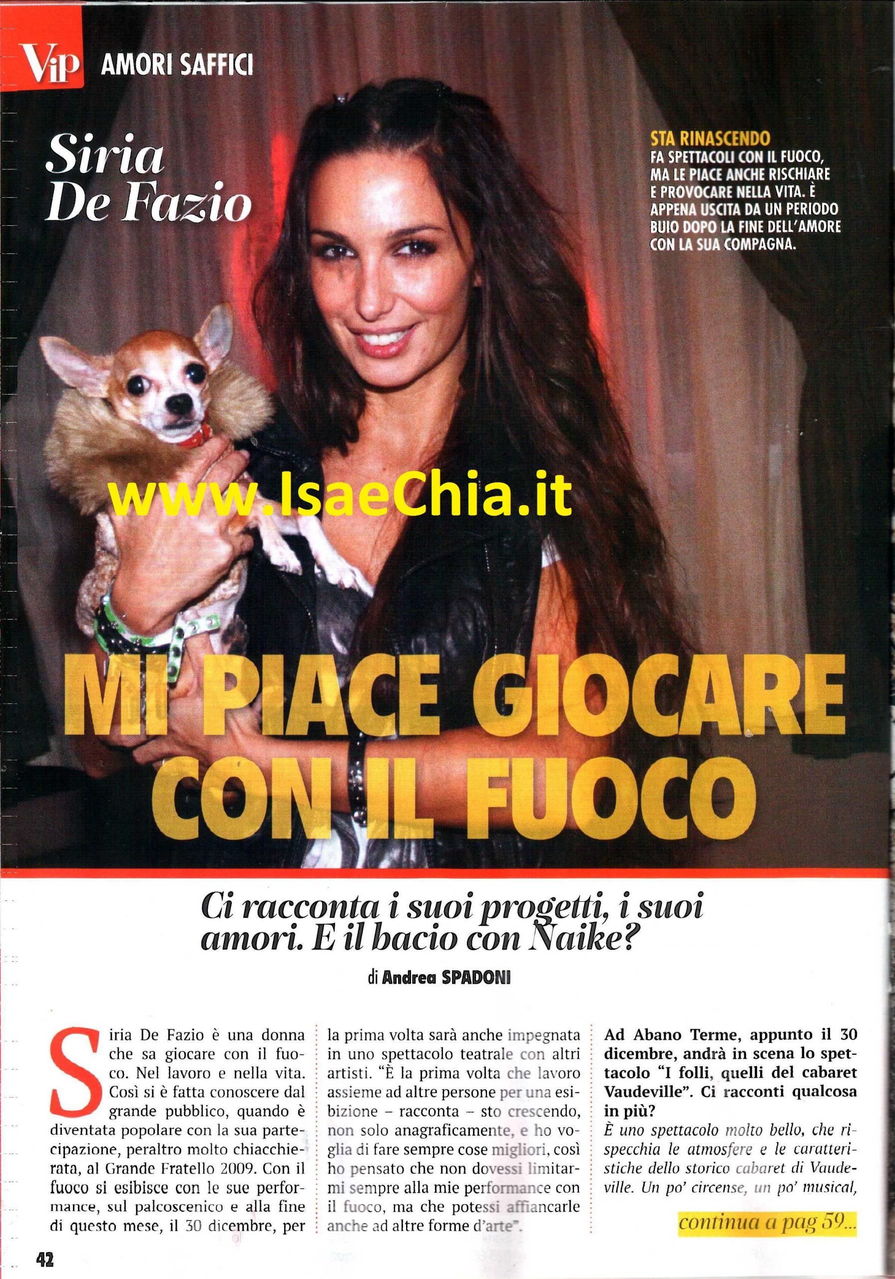 Al Grande fratello 9 Siria De Fazio fece molto parlare di sé per la sua professione di mangiafuoco e per la dichiarata omosessualità. Ma il prossimo 30 dicembre, per la prima volta, sarà impegnata in uno spettacolo teatrale con altri artisti: “E’ la prima volta che lavoro insieme ad altri per un’esibizione. Sto crescendo, ho voglia di fare cose sempre migliori e ho pensato di affiancare le mie performance col fuoco ad altre forme di arte. Lo spettacolo I folli, quelli del cabaret Vaudeville, è uno spettacolo molto bello, che rispecchia le caratteristiche storiche del cabaret di Vaudeville, un po’ circense, un po’ musical, un po’ burlesque, irriverente e sensuale. E poi ci sono io col fachirismo. Io vengo dalla scuola di teatro, anche se non ci avevo quasi mai lavorato. La tv serve a renderti popolare, ma c’è poco spazio per l’arte, si predilige il prodotto commerciale. Sto attraversando un bel momento, sono serena e piena di voglia di fare, però questo stato d’animo arriva dopo un periodo buio: ho avuto una delusione sentimentale e dei gravi problemi di salute. Ho sofferto per la fine della relazione con la mia ex compagna. E’ durata due anni, ci siamo amate moltissimo e quando ci siamo lasciate ho sofferto tanto e profondamente. Ci sono voluti mesi per ritrovare me stessa, e proprio in quel momento sono venuti fuori i problemi di salute. Devo sottopormi a un intervento e i medici sospettavano un cancro. Dopo una serie di controlli, il peggio è stato scongiurato. Oggi penso che quest’esperienza mi sia servita a crescere“. Ultimamente, inoltre, l’ex gieffina ha pubblicato una foto in cui bacia Naike Rivelli, la trasgressiva figlia dell’attrice Ornella Muti (QUI per rivedere il post). Quando le si chiede del suo stato sentimentale, risponde solo: “Ora sono tranquilla, con me stessa, ho voglia di fare cose migliori, sia sul lavoro che nella vita privata. E poi sono single, chissà se un giorno tornerà anche l’amore…“
