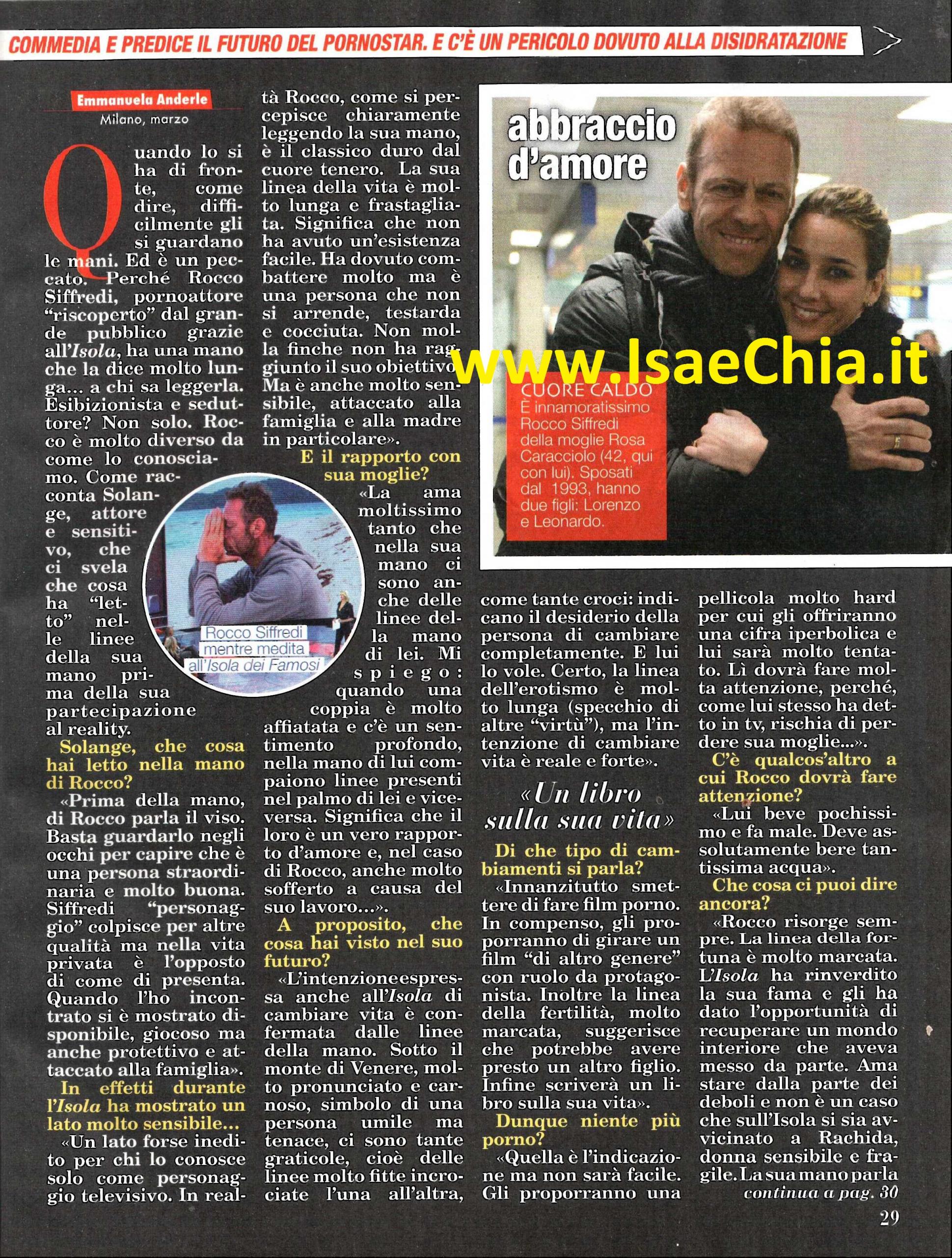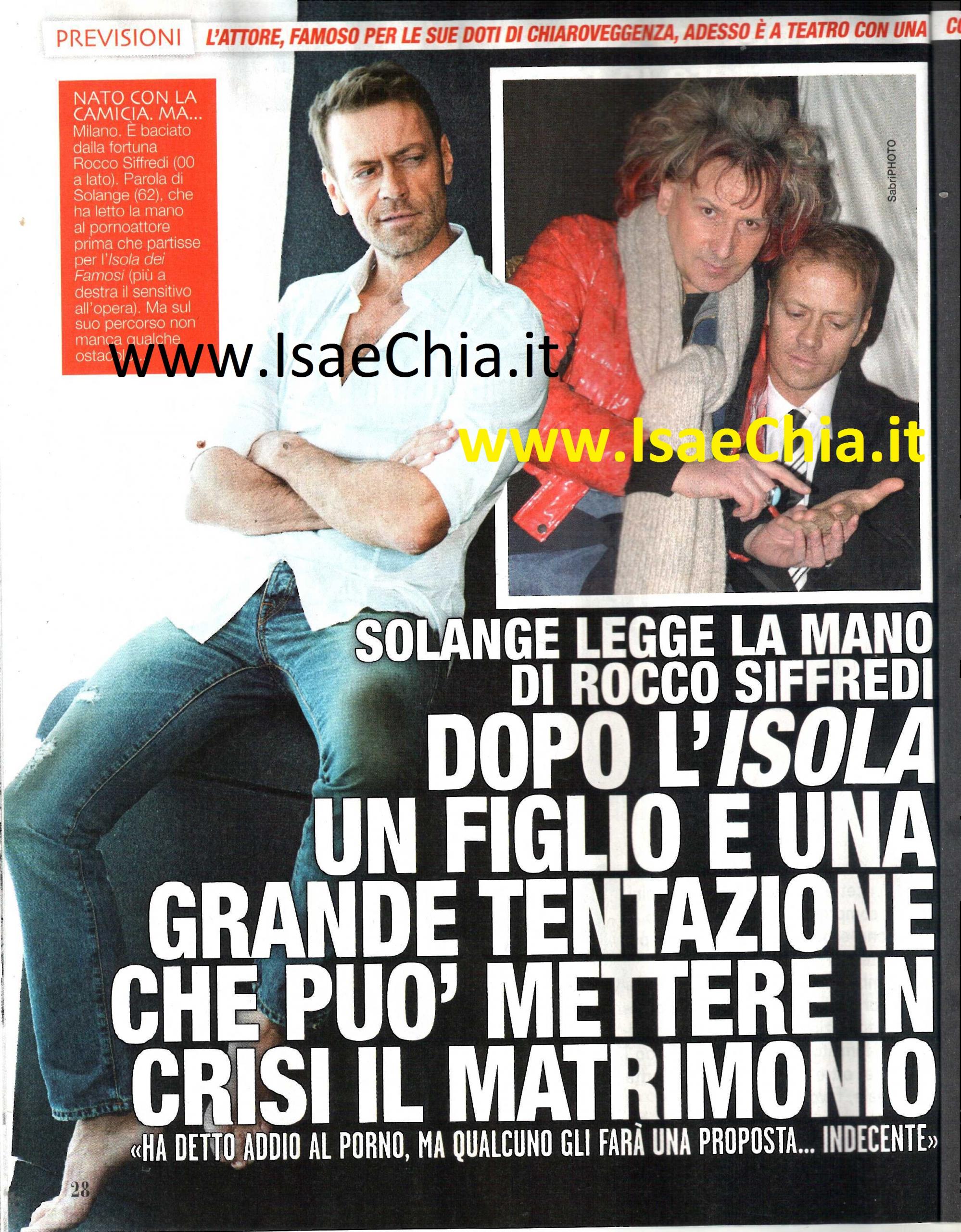 Prima della partecipazione all’Isola dei famosi 10, il sensitivo Solange, noto per varie apparizioni televisive tra cui Buona domenica e La fattoria 2004, ha avuto occasione di leggere la mano a Rocco Siffredi. Intervistato, racconta cosa ha letto nel suo futuro: “Prima della mano, di Rocco si legge il viso. Basta guardarlo negli occhi per capire che è una persona straordinaria e molto buona. Il Siffredi ‘personaggio’ colpisce per altre qualità, ma nella vita privata è l’opposto di come si presenta. Durante l’Isola, infatti, si è dimostrato molto attaccato alla sua famiglia e questo è un lato forse inedito per chi lo conosce solo come personaggio. In realtà, lui è il classico duro dal cuore tenero. La sua linea della vita è molto lunga ma frastagliata. Ciò vuol dire che non ha avuto un’esistenza facile, ma è una persona che non si arrende e non molla finché non ha raggiunto il proprio obiettivo. Ma è anche molto sensibile e attaccato alla famiglia, alla madre in particolare. Ama moltissimo sua moglie, tanto che nella sua mano, ci sono anche delle linee della mano di lei. Mi spiego: quando in una coppia affiatata c’è un sentimento profondo, nella mano di lui compaiono delle linee del palmo di lei e viceversa. Significa che il loro è un vero rapporto d’amore e, nel caso di Rocco, è molto sofferto a causa del suo lavoro“. Ma Rocco ha promesso che dopo l’Isola smetterà di fare il pornoattore e Solange trova conferma nella sua mano: “L’intenzione di cambiare vita è confermata dalle linee della sua mano: sotto il monte di Venere, molto pronunciato e carnoso, segno di una persona umile ma tenace, ci sono molte graticole, ossia linee molto fitte incrociate, come tante croci: esse indicano il desiderio di cambiare totalmente. Certo, la linea dell’erotismo è molto lunga (specchio di altre ‘virtù’!), ma l’intenzione di cambiare è reale e forte. In compenso, gli proporranno di girare film di altro genere, con ruolo di protagonista. Inoltre la linea della fertilità, molto marcata, suggerisce che potrebbe presto avere un altro figlio. Infine scriverà un libro sulla sua vita“. Quindi, niente più porno per lui? “Gli proporranno una pellicola molto hard, per cui gli offriranno una cifra iperbolica e lui sarà molto tentato. Lì dovrà fare attenzione, perché come lui stesso ha detto in tv, rischia di perdere sua moglie. Infine posso dire che lui risorge sempre: la linea della fortuna è molto marcata. L’Isola ha rinverdito la sua fama e gli ha dato l’occasione di recuperare un mondo interiore che aveva messo da parte. Ama stare dalla parte dei deboli e non è un caso che sull’Isola si sia avvicinato a Rachida Karrati, donna sensibile e fragile. D’ora in poi il suo percorso sarà pieno di successi”. Quando gli si chiede come ha imparato a leggere la mano, Solange racconta: “Mia nonna, in punto di morte, nonostante non riconoscesse nessuno, ha chiesto di me. Mi ha dato due suoi capelli da conservare e poi mi ha detto di andare su Collesalvetti (in provincia di Livorno) dove avrei incontrato una persona. ‘Prendile la mano, aprila e dille tutto della sua vita’, mi disse, e tutto è accaduto. Da allora ho sempre sfruttato questo mio dono, ma gratuitamente, per fare del bene. Sono sensitivo nella vita, mago sul palcoscenico. Sarò a teatro con Centro malessere a cinque stelle, in cui interpreto una sorta di mago che opera in un centro benessere. Ci sono tanti colpi di scena, si balla, si ride e ci si diverte. Un po’ come dovrebbe essere la vita di tutti i giorni!“.