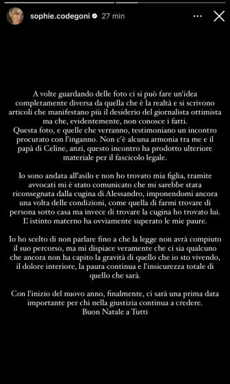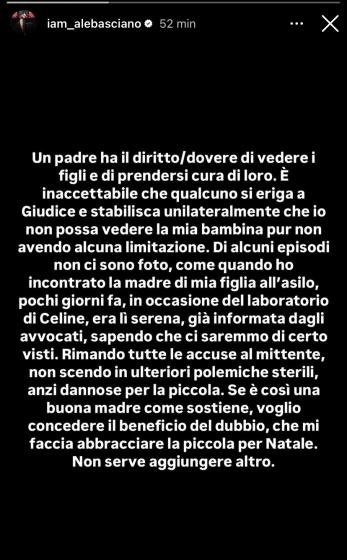 Rimando tutte le accuse al mittente. Non scendo in ulteriori polemiche sterili, anzi dannose per la piccola. Se è così una buona madre come sostiene, voglio concedere il beneficio del dubbio e che mi faccia abbracciare la piccola per Natale. Non serve aggiungere altro.