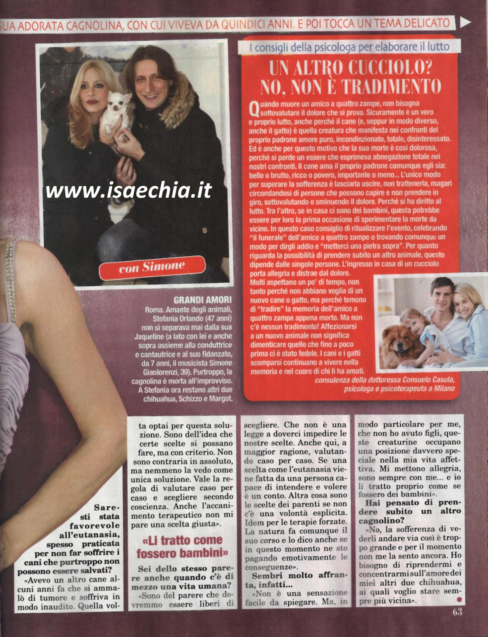 La conduttrice Stefania Orlando racconta la scomparsa della sua cagnolina Jaqueline: “Aveva già avuto problemi di insufficienza cardiaca, ma avevamo trovato una cura. Purtroppo è arrivata una crisi che ha coinvolto anche i polmoni ed è morta tra le mie braccia. Fino al giorno prima era allegra e felice, anche se non poteva saltare. A volte le si riempivano i polmoni d’acqua; per un po’ è stato possibile curarla con delle dosi massicce di diuretici, poi ho intuito che non c’era più nulla da fare. So che è morta serenamente, con me e gli altri cani vicino, che oggi sono la mia forza. In passato, con un cane che aveva un tumore ho scelto l’eutanasia: non sono contraria in assoluto, credo che certe scelte vadano fatte con criterio. Lo stesso vale per l’accanimento terapeutico. Anche le persone dovrebbero avere la possibilità di scegliere. Sono molto affranta, non è una sensazione facile da spiegare. Per me, che non ho avuto figli, queste creaturine occupano una posizione davvero speciale nella mia vita affettiva: li amo come se fossero bambini. Non ho pensato di prendere un altro cagnolino: ho bisogno di riprendermi e stare più vicina ai miei altri due chihuahua”.