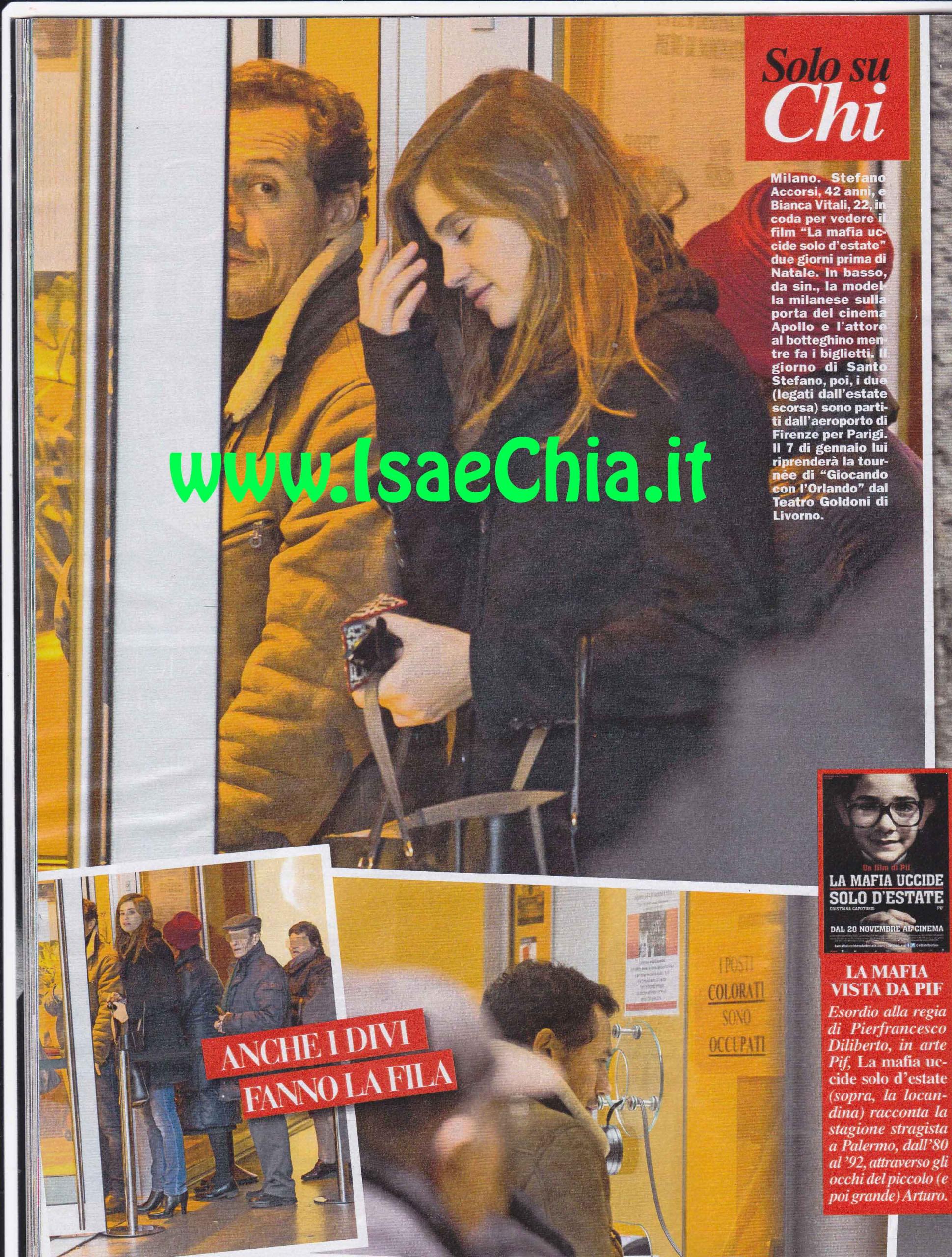 Il mese scorso la rivista Chi ha dato in anteprima la notizia dell’amore nato tra l’attore Stefano Accorsi e la modella Bianca Vitali. E a quanto pare, la storia si fa sempre più seria, dato che i due non perdono occasione per stare insieme. Dopo esser stati beccati insieme al teatro, stavolta la coppia è stata ripresa in un cinema di Milano, dove erano in coda per guardare il film La mafia uccide solo d’estate. Il giorno di Santo Stefano, poi, i due (che hanno ben vent’anni di differenza), sono partiti dall’aeroporto di Firenze alla volta di Parigi. Il 7 gennaio lui ha ripreso la tournée con lo spettacolo Giocando con l’Orlando. Quando si vedranno di nuovo?