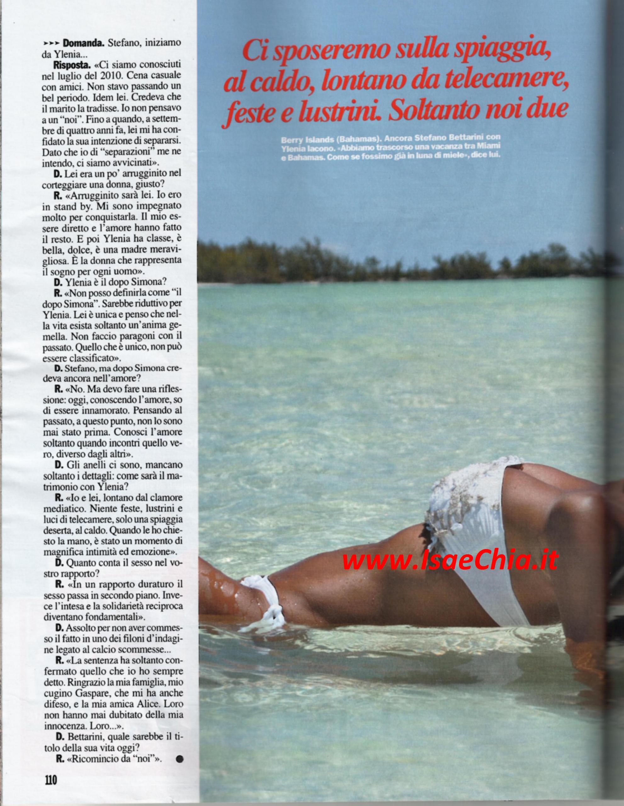 Nel 1998 il calciatore Stefano Bettarini aveva sposato Simona Ventura, ma il loro matrimonio è finito qualche anno dopo. Adesso il vincitore di Jump! giura che la donna della sua vita è Ylenia Iacono, ex moglie del magnate dell’amaro Giuliani. “Definirla il “dopo-Simona” sarebbe riduttivo per lei. Lei è unica e io penso che nella vita ci sia una sola anima gemella. Non si possono fare paragoni col passato: quello che è unico non può essere classificato. Dopo Simona non credevo nell’amore, ma in realtà ora che conosco l’amore, posso dire che non lo sono mai stato prima. Conosci l’amore solo quando incontri quello vero, diverso dagli altri. Ci siamo incontrati per caso, lei pensava che il marito la tradisse. Io non pensavo a un “noi” fin quando non mi ha confidato la sua intenzione di separarsi. Io mi sono impegnato molto per conquistarla, il mio essere diretto e l’amore hanno fatto il resto. Lei ha classe, è dolce, è una mamma meravigliosa. E’ il sogno di ogni uomo”. Quando gli si chiede del matrimonio, risponde: “Sarà solo io e lei, lontano dal clamore mediatico, su una spiaggia. Quando le ho chiesto la mano, è stato un momento di magnifica intimità ed emozione. In un rapporto duraturo il sesso passa in secondo piano: contano l’intesa e la solidarietà reciproca”.