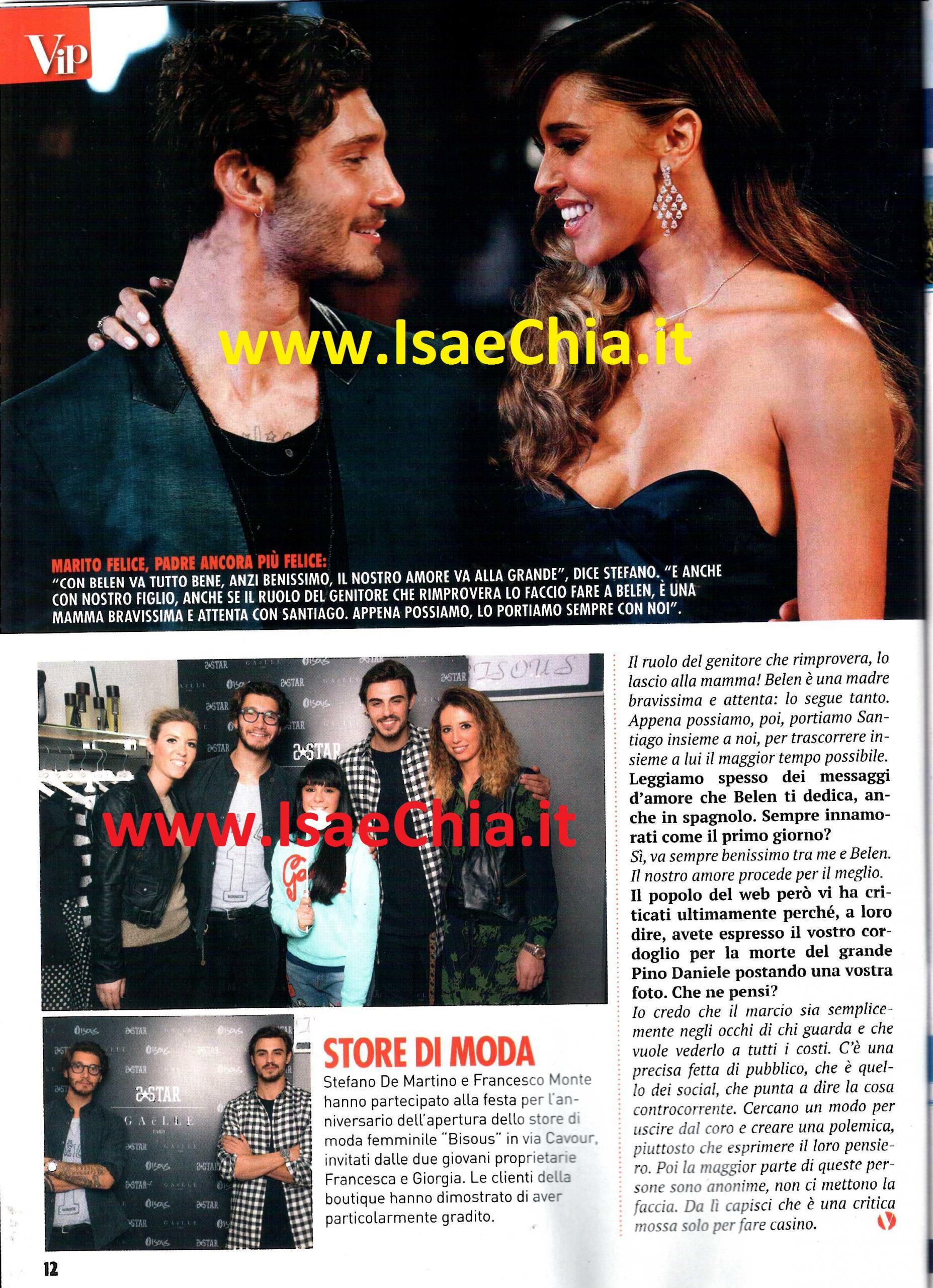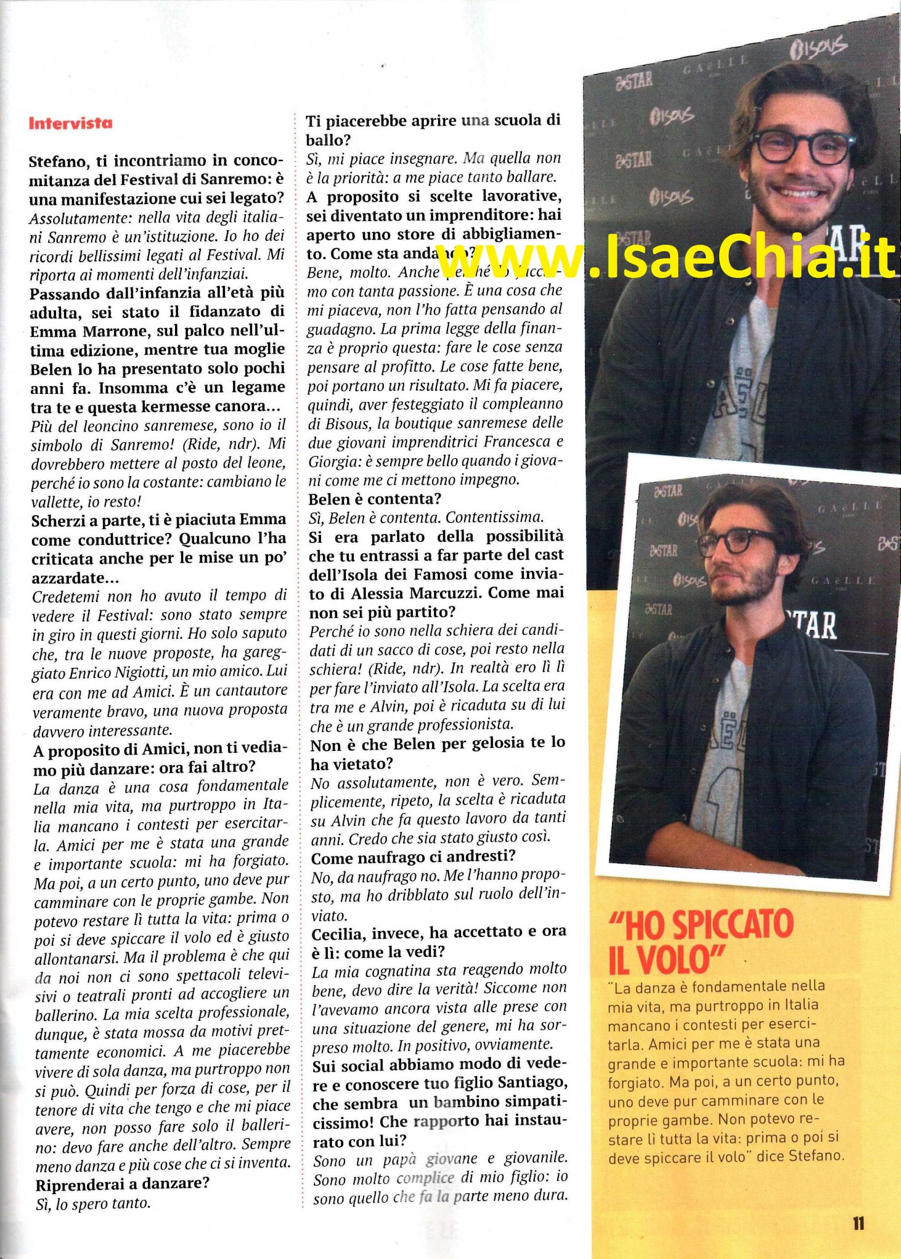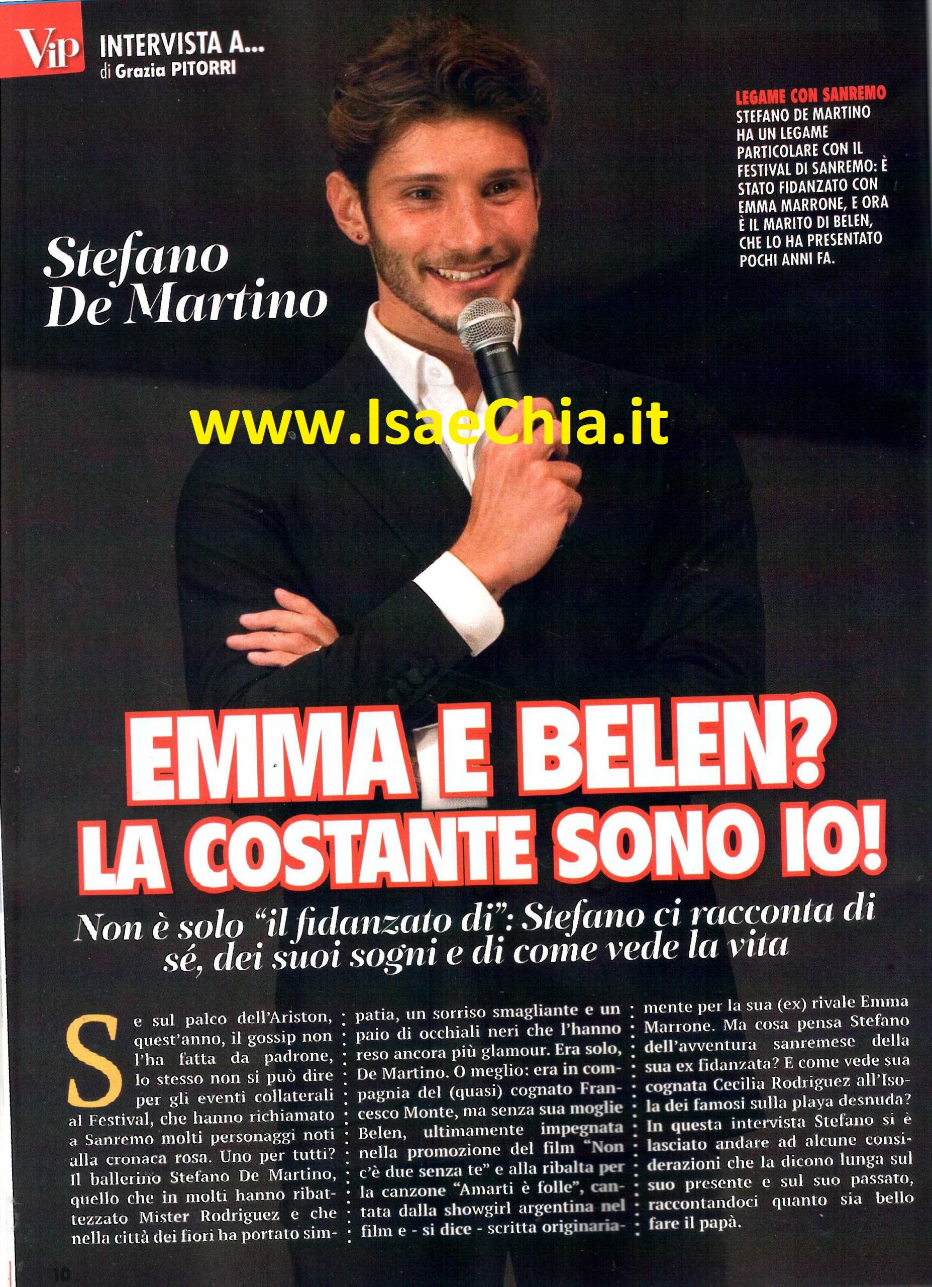 Quest’anno il Festival di Sanremo ha stupito con due vallette d’eccezione, le cantanti Arisa ed Emma Marrone. Quest’ultima è coinvolta in un curioso triangolo: il suo ex Stefano De Martino, infatti, adesso è sposato con Belén Rodriguez, che nelle passate edizioni è stata a sua volta valletta del Festival. E, proprio in quei giorni, era a Sanremo per l’inaugurazione di un negozio insieme al “cognato” Francesco Monte. Inoltre, si era parlato di Stefano come probabile concorrente o inviato dell’Isola dei famosi 10, reality nel quale è concorrente la sorella di Belén, Cecilia. Intervistato, il ballerino lanciato da Amici racconta: “Sono legato a Sanremo, ho ricordi bellissimi legati al Festival, mi riporta a momenti dell’infanzia” e quando gli si fa notare della presenza di Emma e Belén nelle ultime edizioni, commenta ironico: “Ormai più del leoncino sanremese, sono io il simbolo del Festival! Mi dovrebbero mettere al posto del leone, perché io sono la costante: cambiano le vallette, ma io resto!“. Scherzi a parte, quando gli si chiede di commentare il Festival, risponde: “Credetemi, non ho avuto il tempo di guardarlo. So che è in gara il mio amico Enrico Nigiotti, che era con me ad Amici. E’ un cantautore davvero bravo, una nuova proposta davvero interessante“. E, a proposito di Amici, quando gli si chiede come mai non lo vediamo più danzare in tv, risponde: “La danza è fondamentale nella mia vita, ma purtroppo in Italia mancano i contesti per esercitarla. Amici è stata per me una grande scuola, ma prima o poi dovevo camminare sulle mie gambe, non potevo restare lì tutta la vita. La mia scelta professionale, dunque, è stata mossa da motivi prettamente economici: mi piacerebbe vivere di sola danza, ma purtroppo non si può. Quindi, per forza di cose, per il tenore di vita che tengo e che mi piace avere, non posso fare il ballerino, devo fare anche altro. Il mio store d’abbigliamento sta andando molto bene, anche perché ci metto la passione: è una cosa che mi piaceva, non l’ho fatta per il guadagno. E Belén è contenta, anzi, contentissima. Dovevo prendere parte all’Isola dei famosi, ma io sono nella schiera dei candidati per parecchie cose, solo che poi resto nella schiera! In realtà avrei dovuto fare l’inviato sull’Isola. La scelta era tra me e Alvin, poi è ricaduta su di lui, che è un grande professionista. Non è assolutamente vero che me l’ha vietato Belén per gelosia. La scelta è ricaduta su Alvin perché fa questo lavoro da tanti anni e credo sia giusto così. Come naufrago non ci andrei: me l’hanno proposto, ma ho dribblato sul ruolo dell’inviato! La mia cognatina Cecilia sta reagendo molto bene. Siccome non l’avevo mai vista alle prese con una situazione del genere, mi ha sorpreso molto. In positivo, ovviamente“. Infine, parla di altri due importanti “lavori” a cui si sta dedicando ultimamente, quelli di padre e marito: “Per Santiago sono un padre giovane e giovanile, sono molto complice e sono quello che fa la parte meno dura, mentre Belén è una madre attentissima e lascio a lei il ruolo del genitore che rimprovera! Tra me e lei va sempre benissimo e il nostro amore procede per il meglio. Di chi ci critica (come quando abbiamo pubblicato una nostro foto per esprimere il cordoglio per la morte di Pino Daniele), penso che il marcio sia solo negli occhi di chi vuole vederlo a tutti i costi. Sono persone che cercano un modo per creare polemica e la maggior parte di queste persone sono anonime, non ci mettono la faccia. Da lì capisci che è una critica mossa solo per fare casino“.